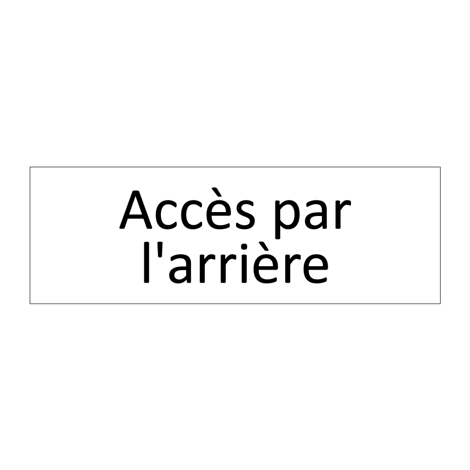Cette enseigne est idéale pour indiquer un accès situé à l'arrière d'un bâtiment ou d'une installation. Elle est particulièrement utile dans les environnements commerciaux, industriels ou résidentiels où l'entrée principale n'est pas évidente. Placez-la à proximité des zones de stationnement, des entrées de service ou des allées pour guider efficacement les visiteurs et le personnel. En facilitant la circulation et en réduisant la confusion, cette signalisation contribue à une meilleure organisation des espaces.