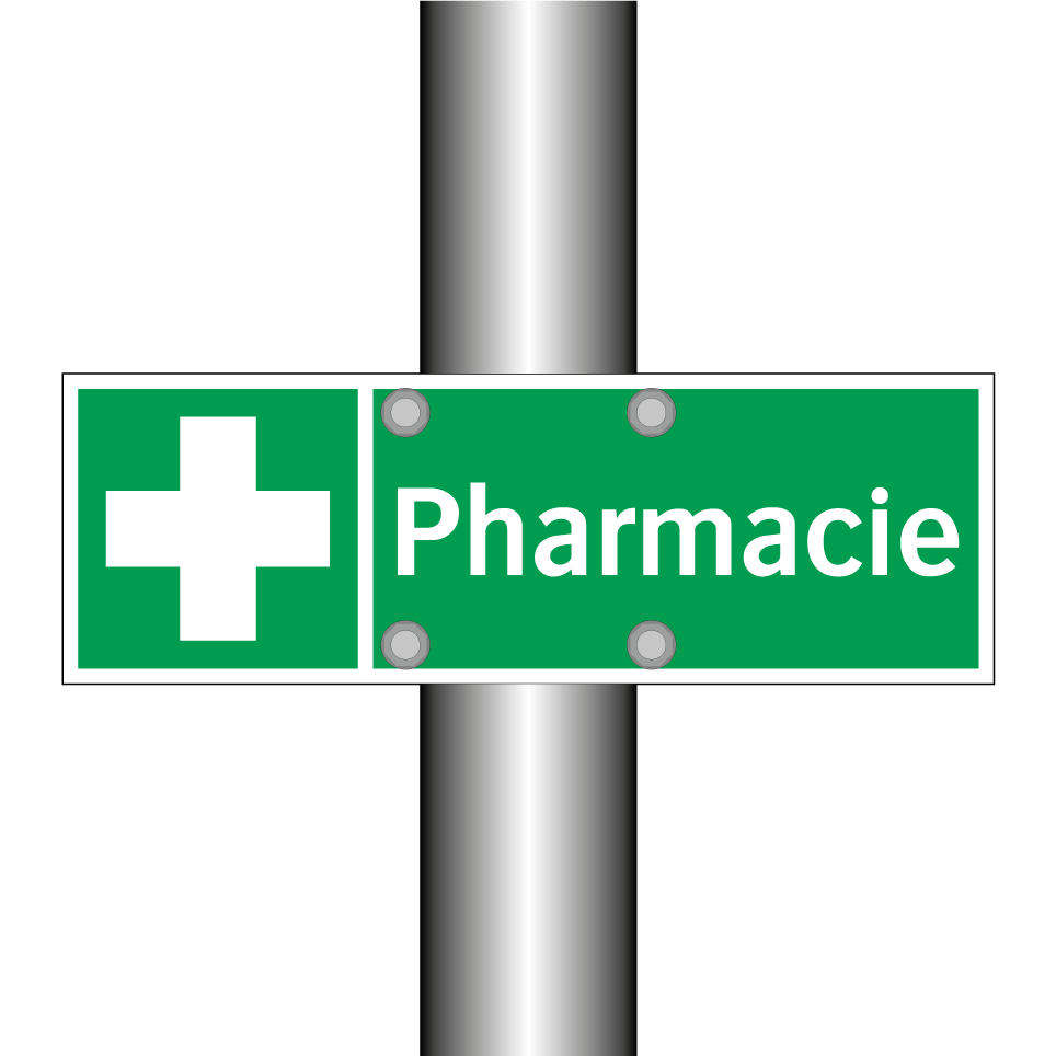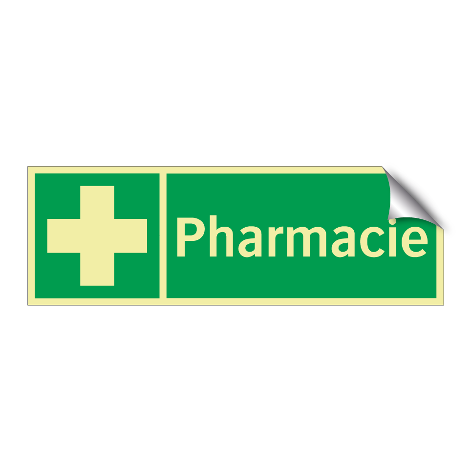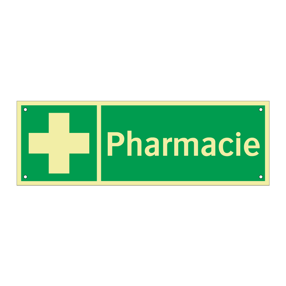 Panneau de secours avec le texte Pharmacie et une symbolique claire