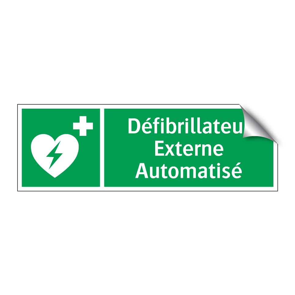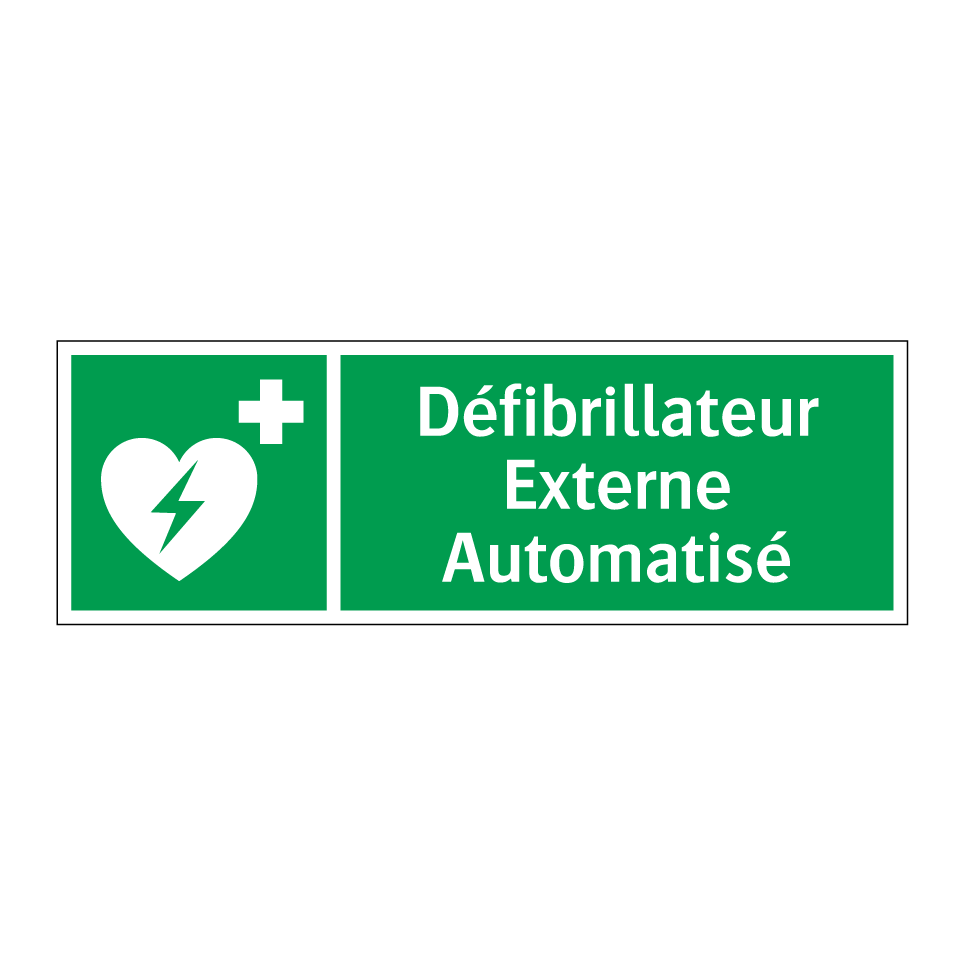 Panneau de secours avec le texte Défibrillateur Externe Automatisé et une symbolique claire