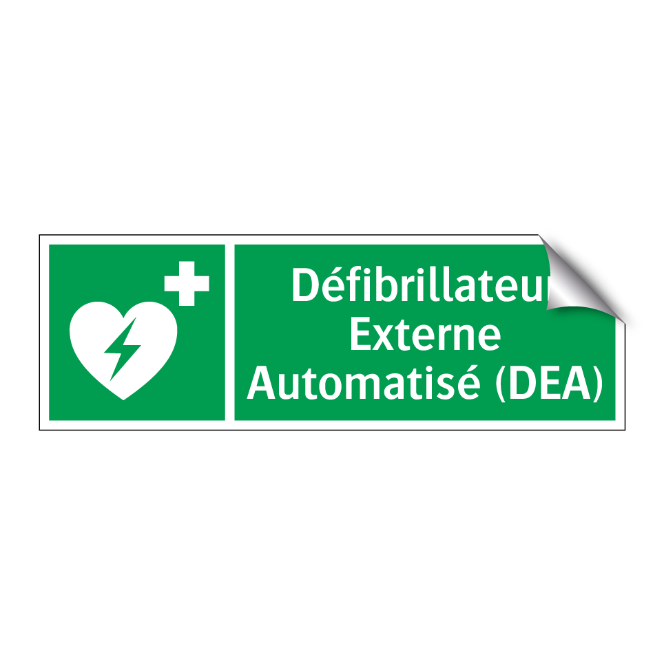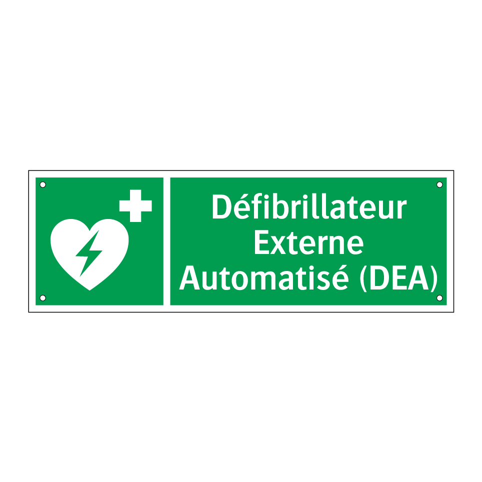 Panneau de secours avec le texte Défibrillateur Externe Automatisé (DEA) et une symbolique claire