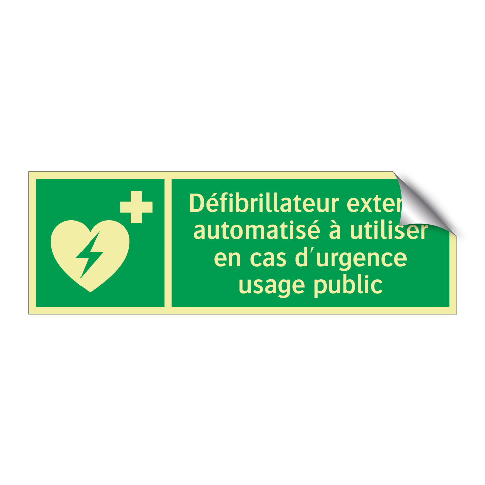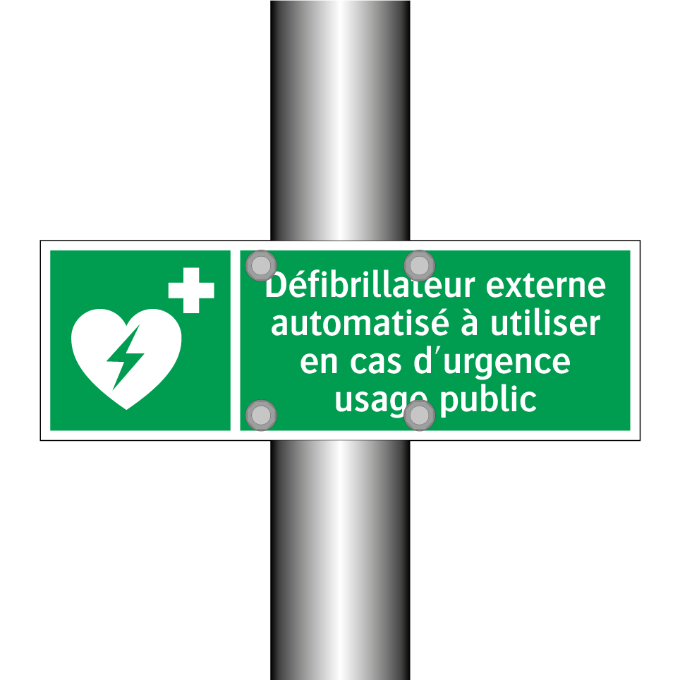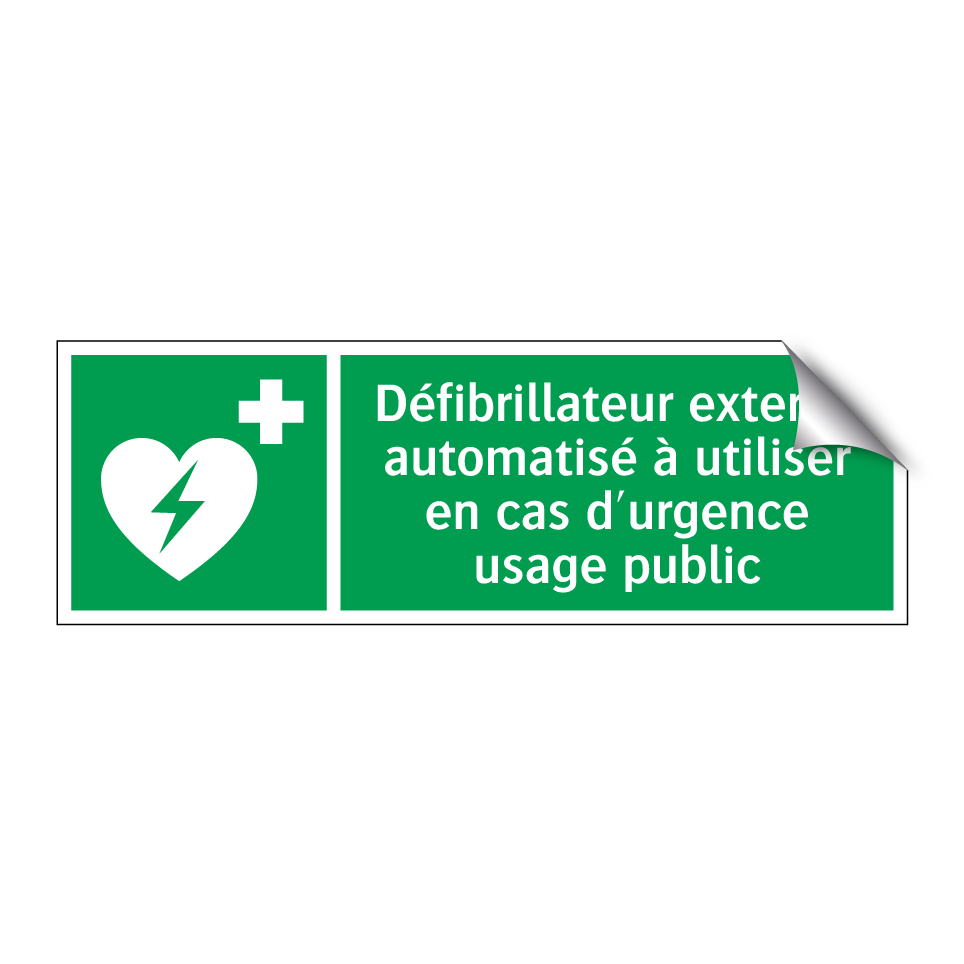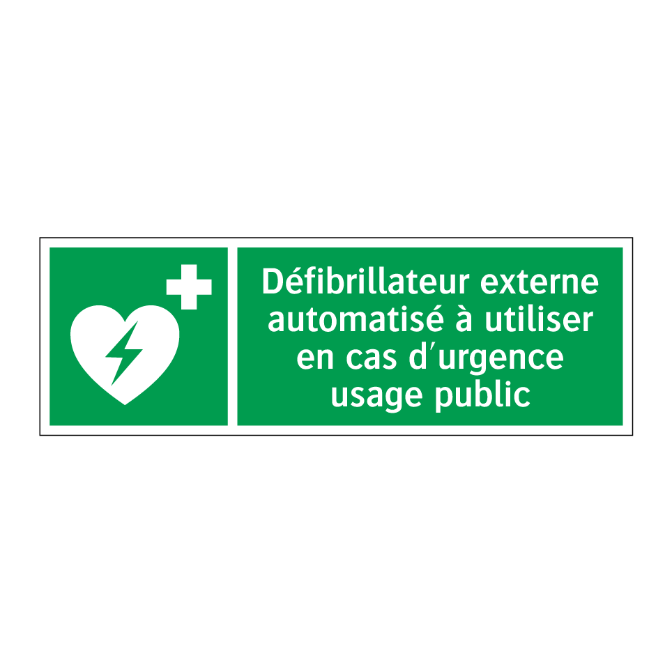 Panneau de secours avec le texte Défibrillateur externe automatisé à utiliser en cas d'urgence usage public et une symbolique claire