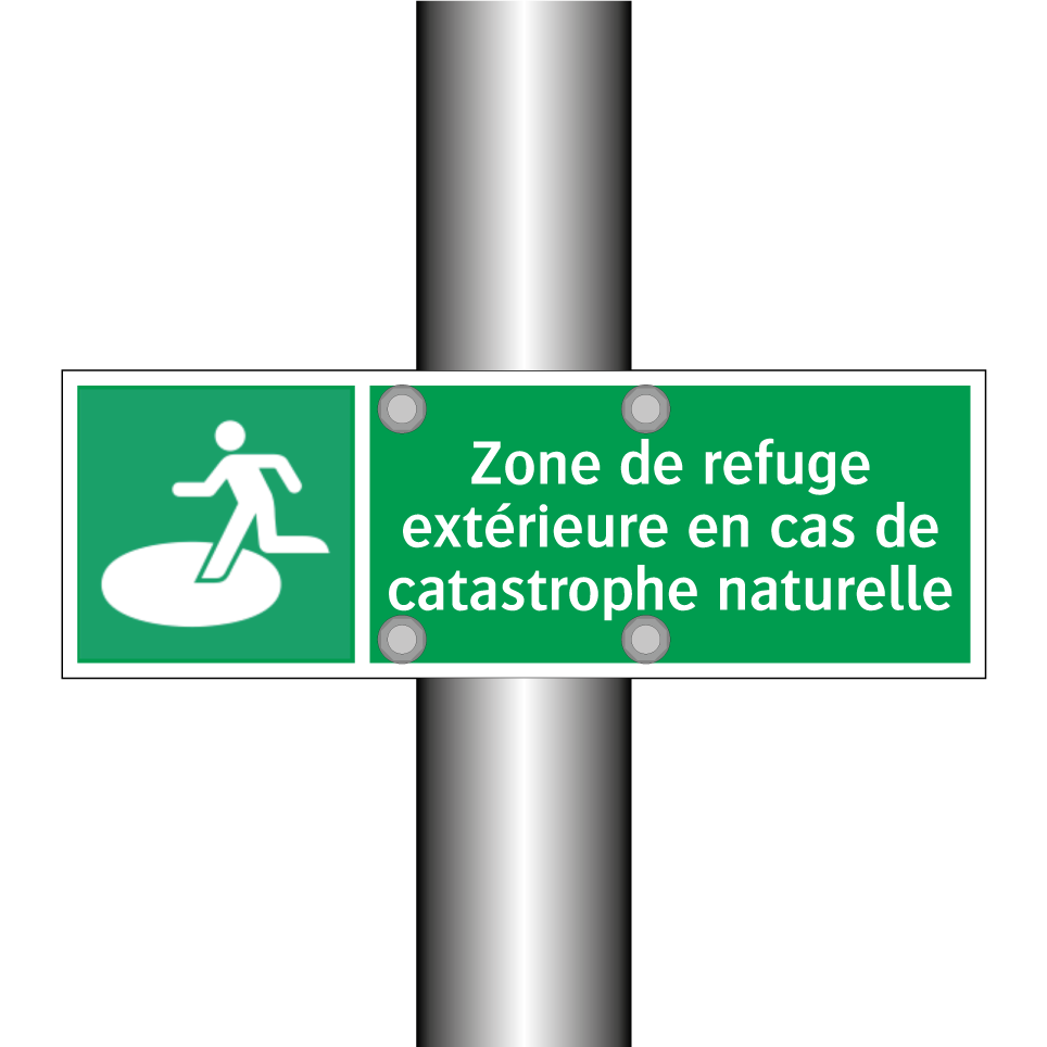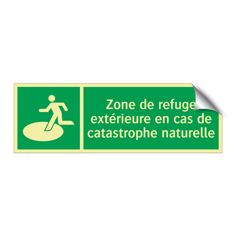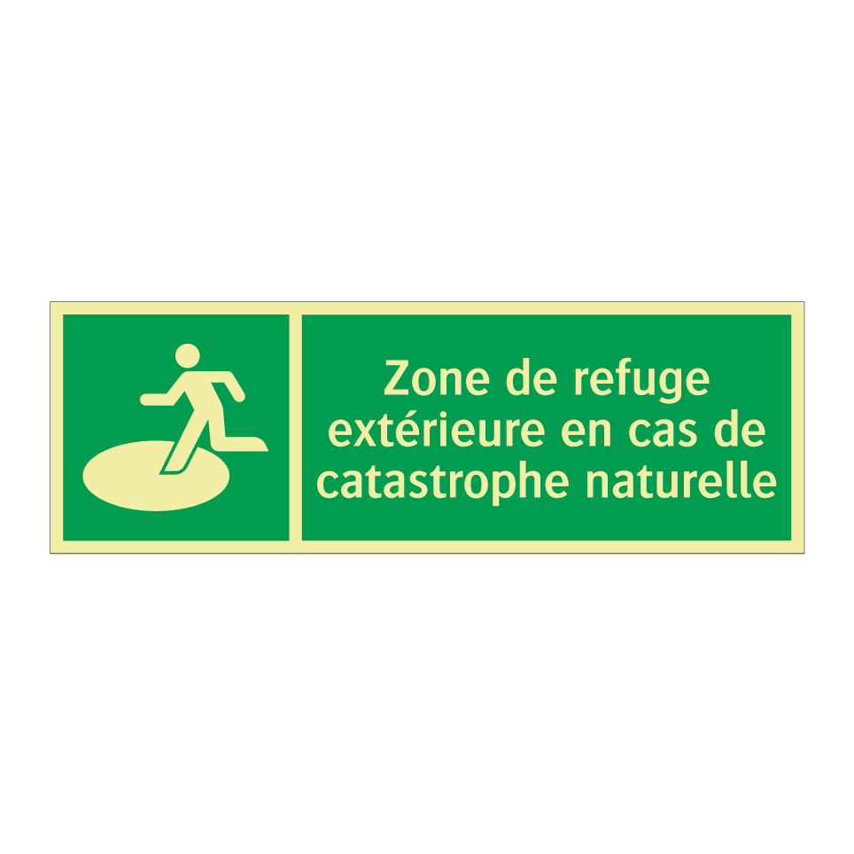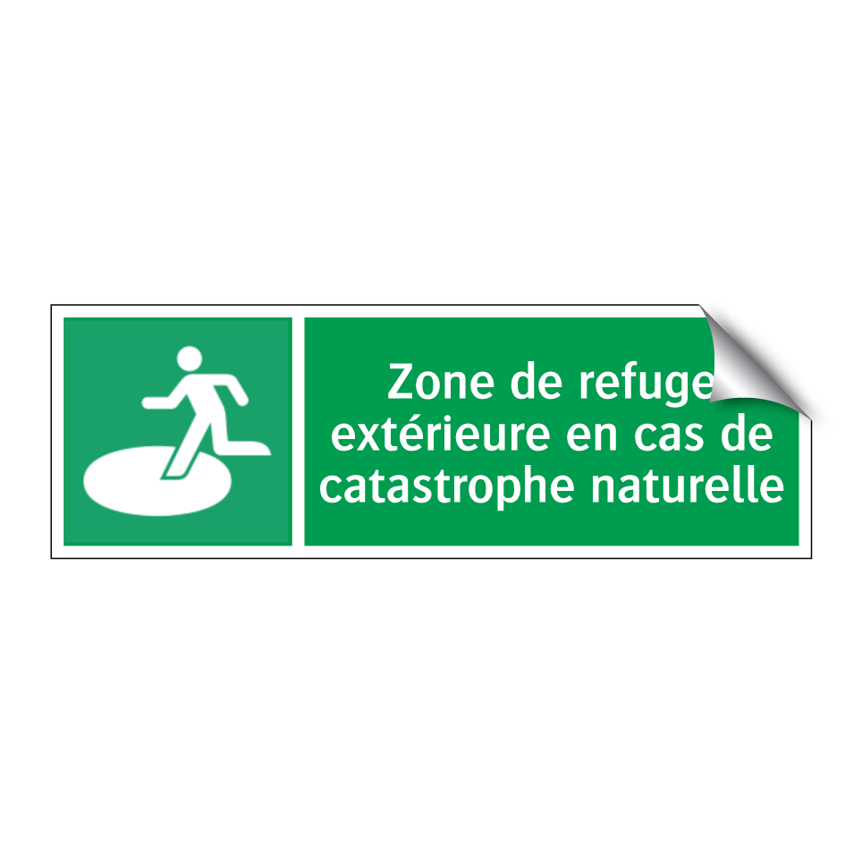 Panneau de secours avec le texte Zone de refuge extérieure en cas de catastrophe naturelle et une symbolique claire