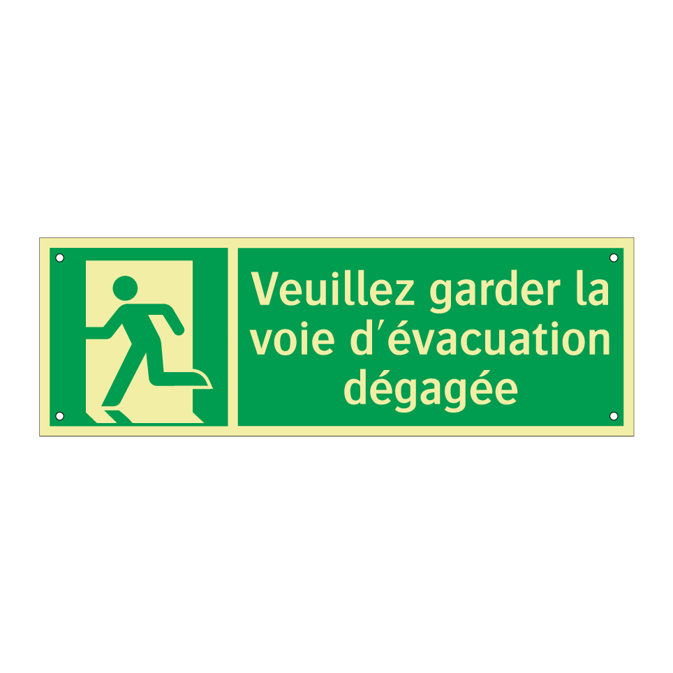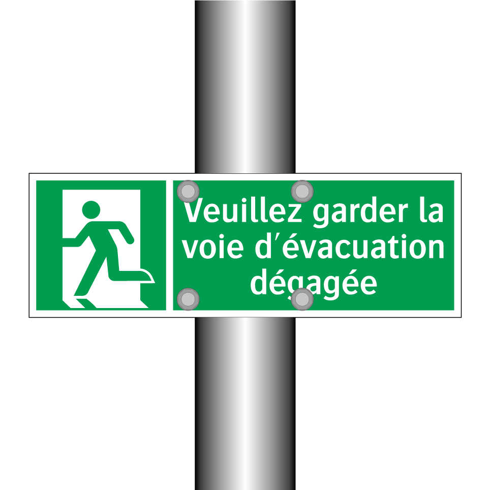 Panneau de secours avec le texte Veuillez garder la voie d'évacuation dégagée et une symbolique claire
