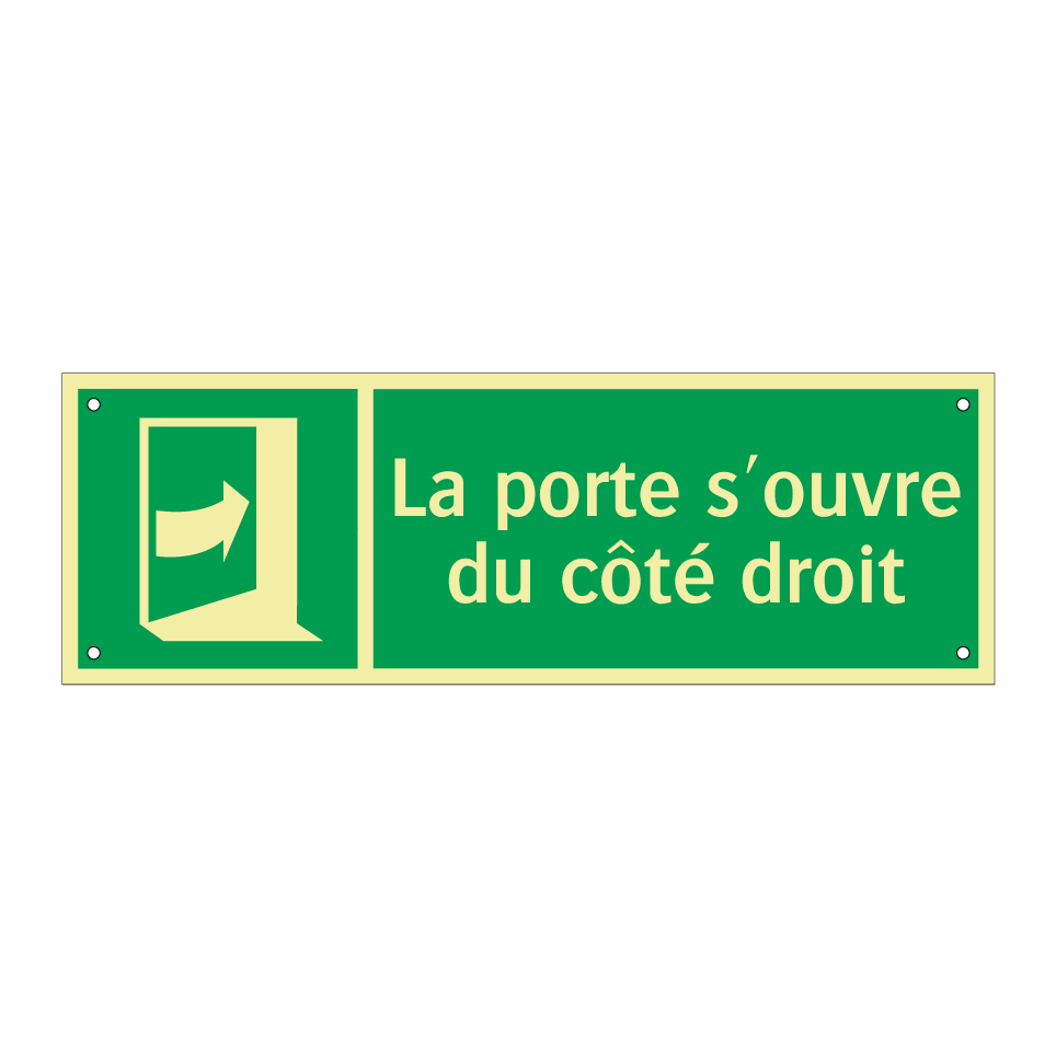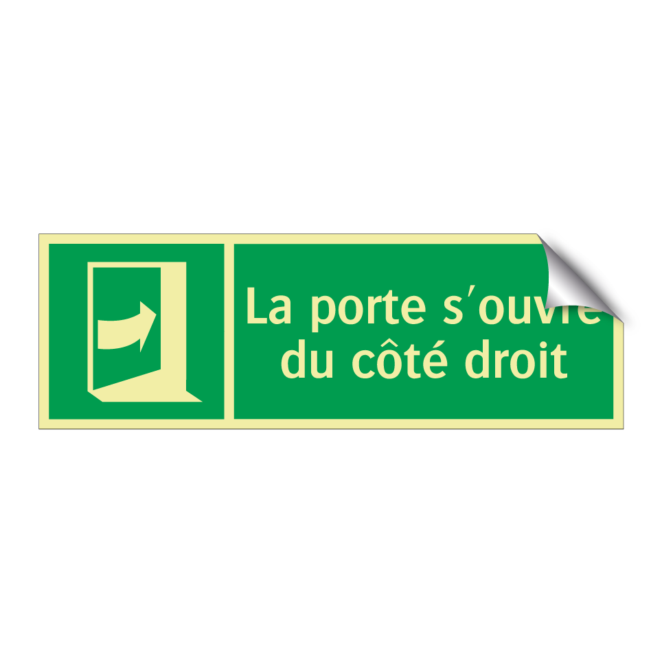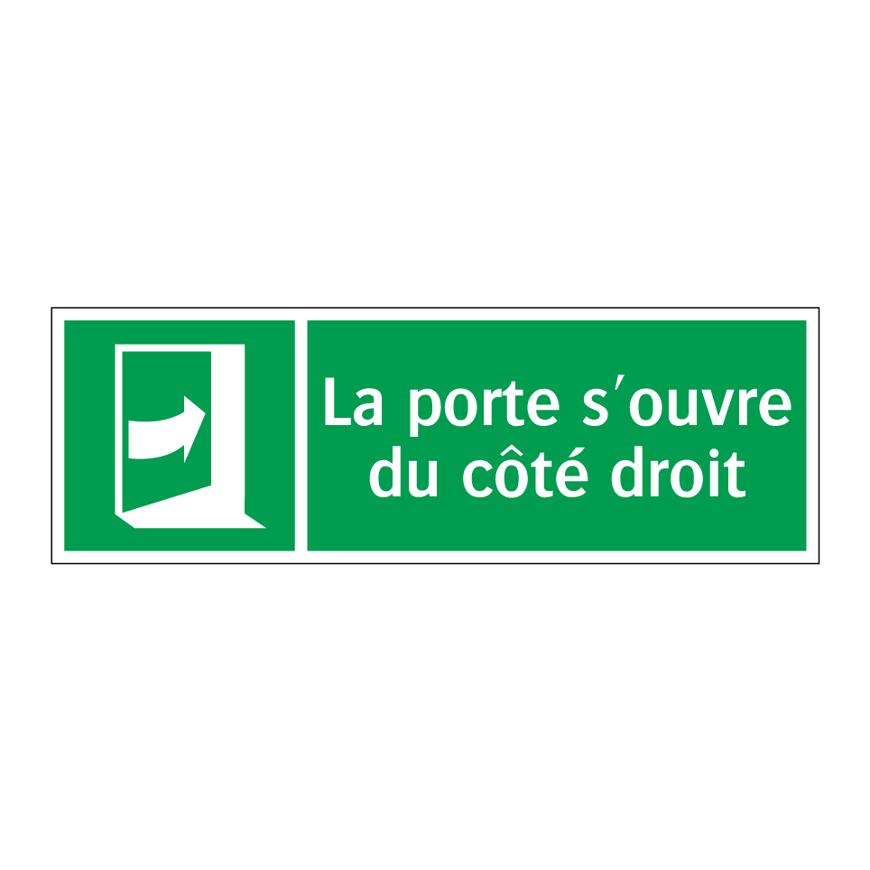 Panneau de secours avec le texte La porte s'ouvre du côté droit et une symbolique claire