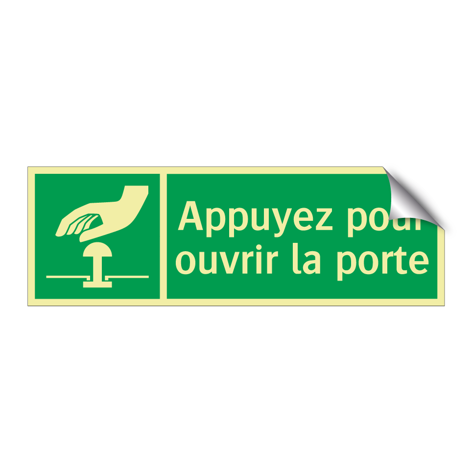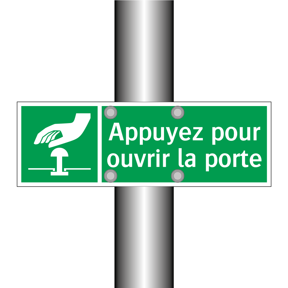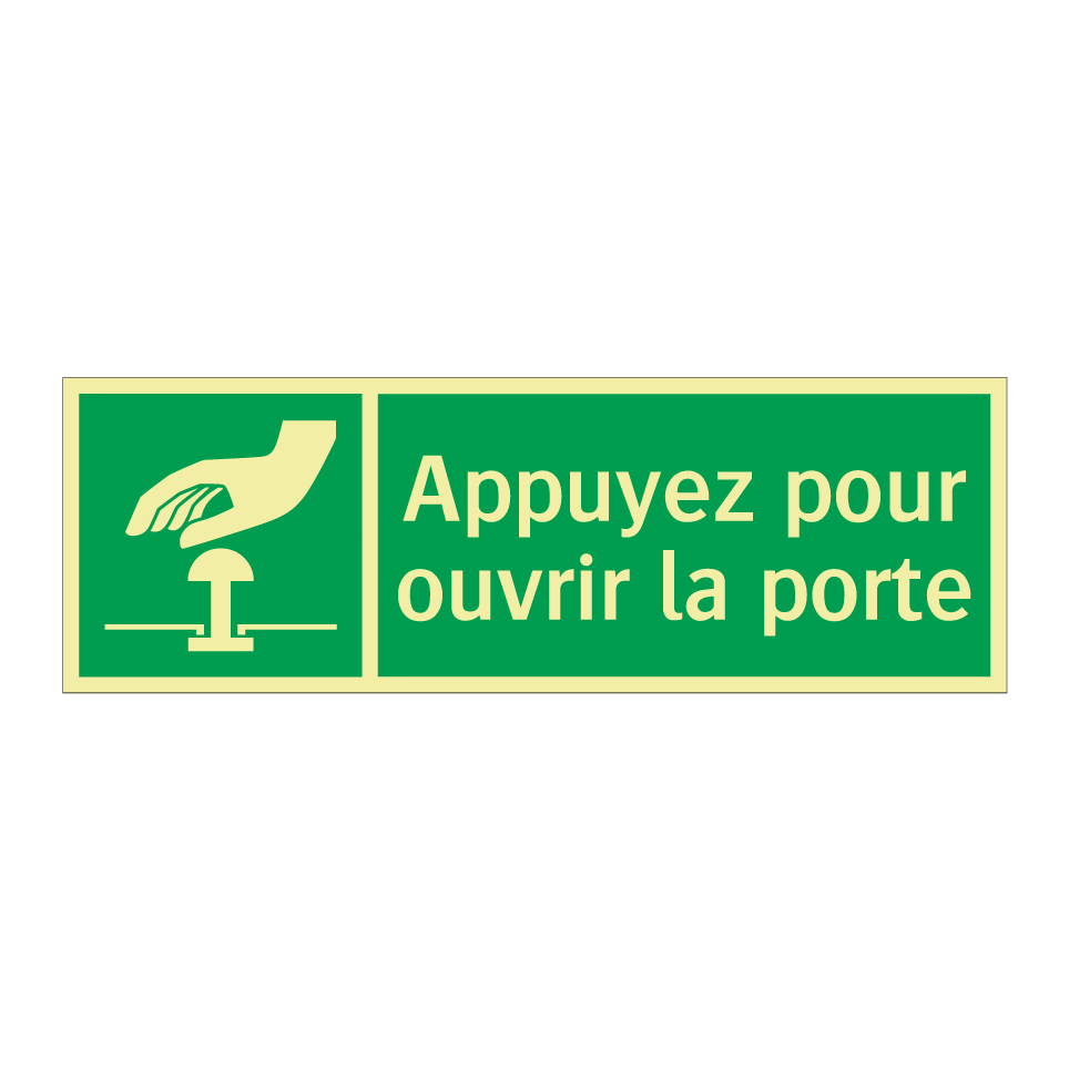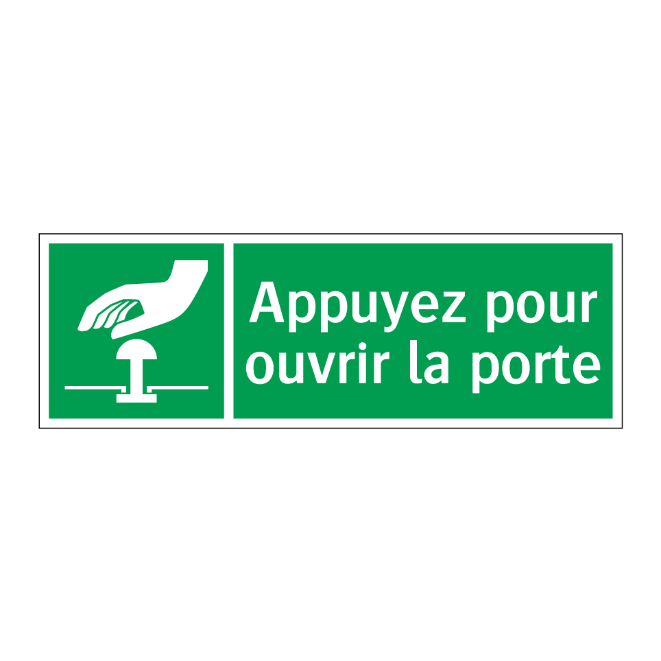 Panneau de secours avec le texte Appuyez pour ouvrir la porte et une symbolique claire