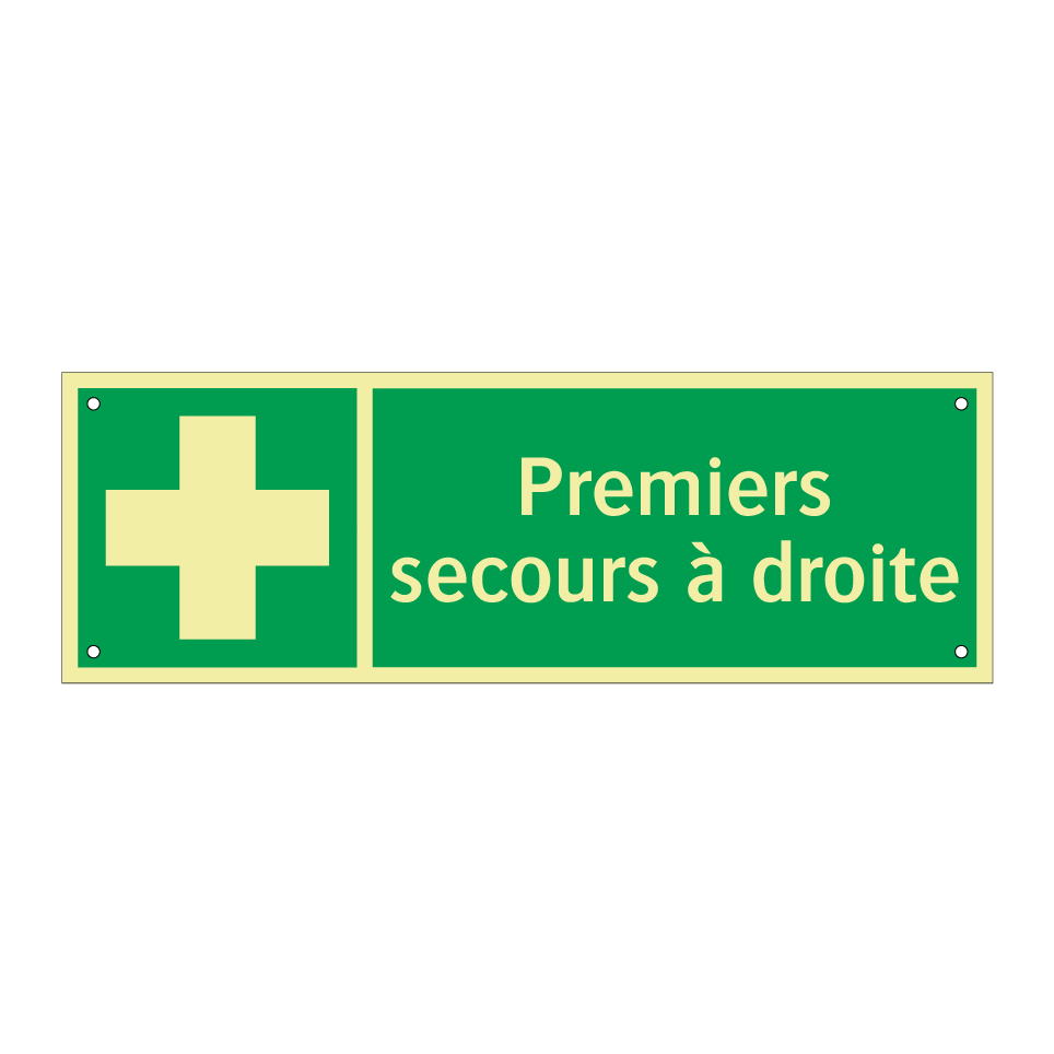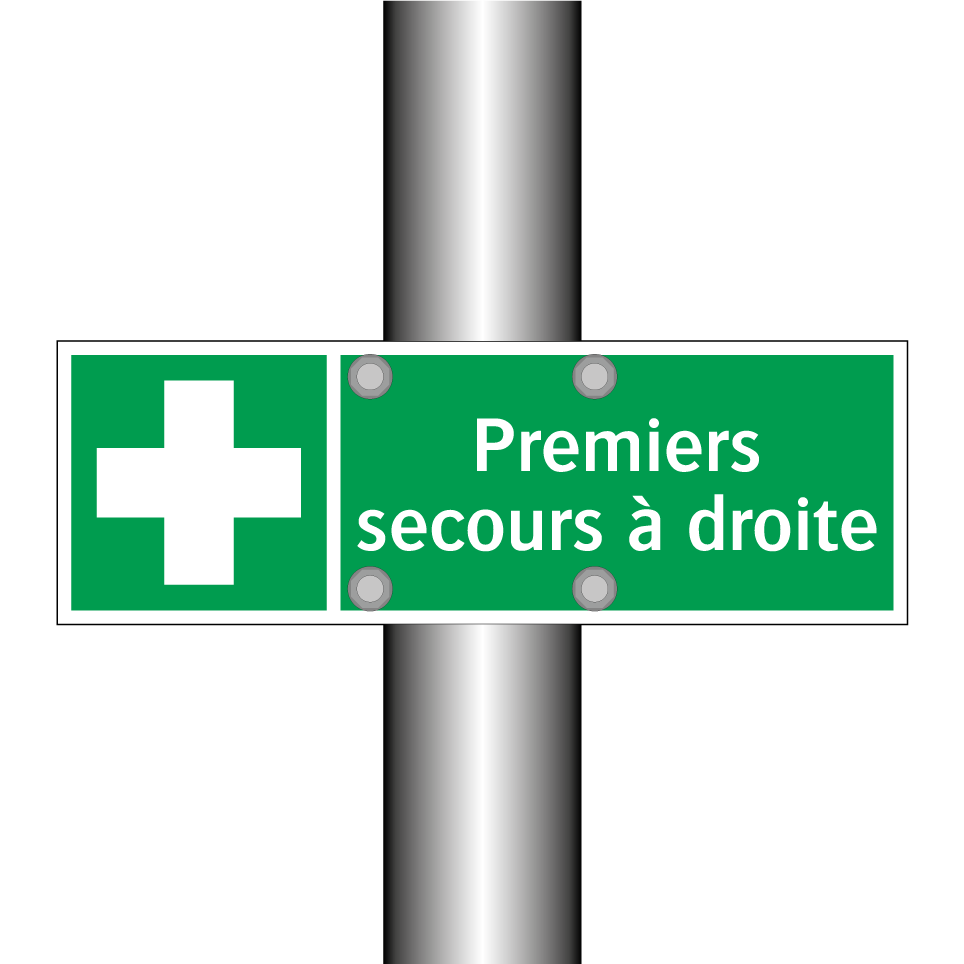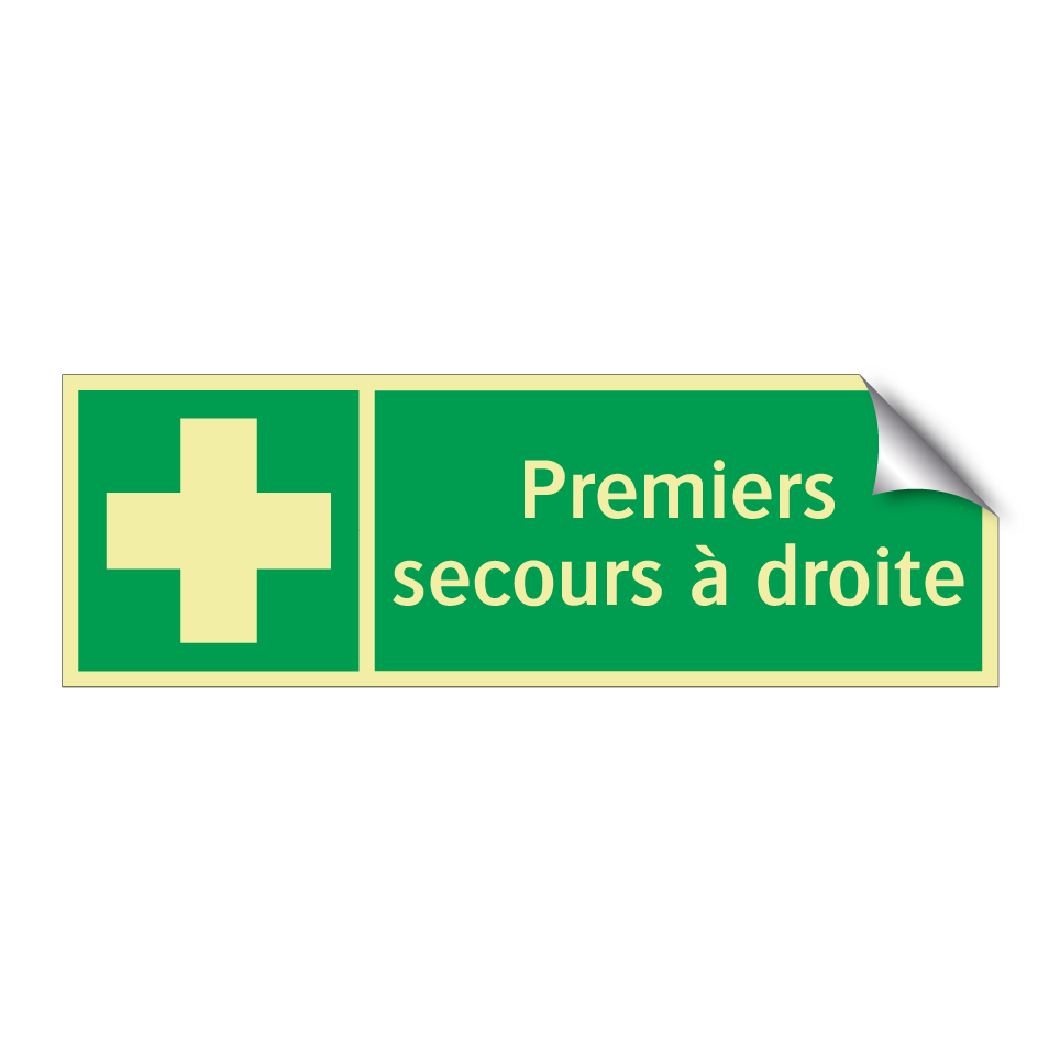 Panneau de secours avec le texte Premiers secours à droite et une symbolique claire
