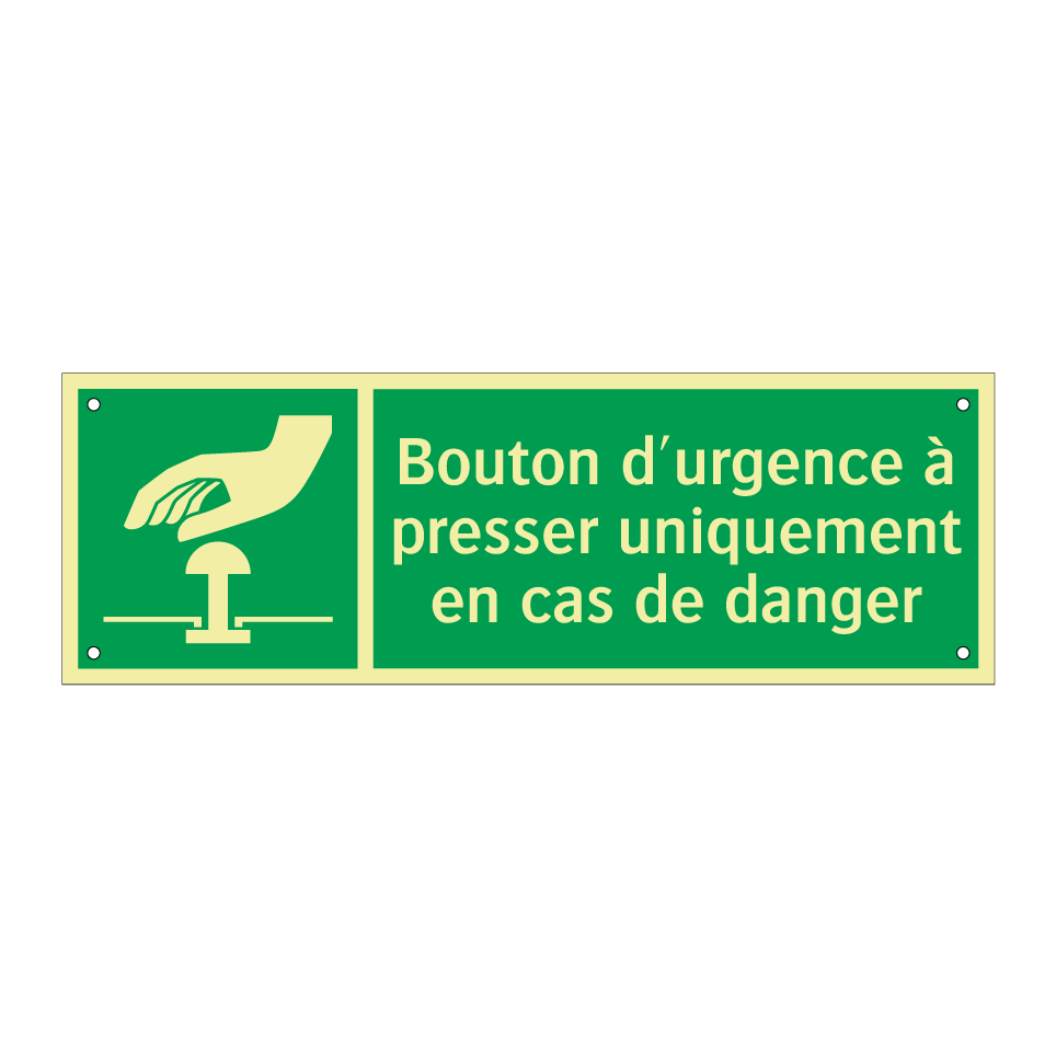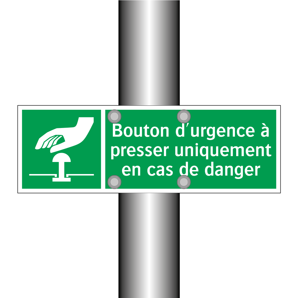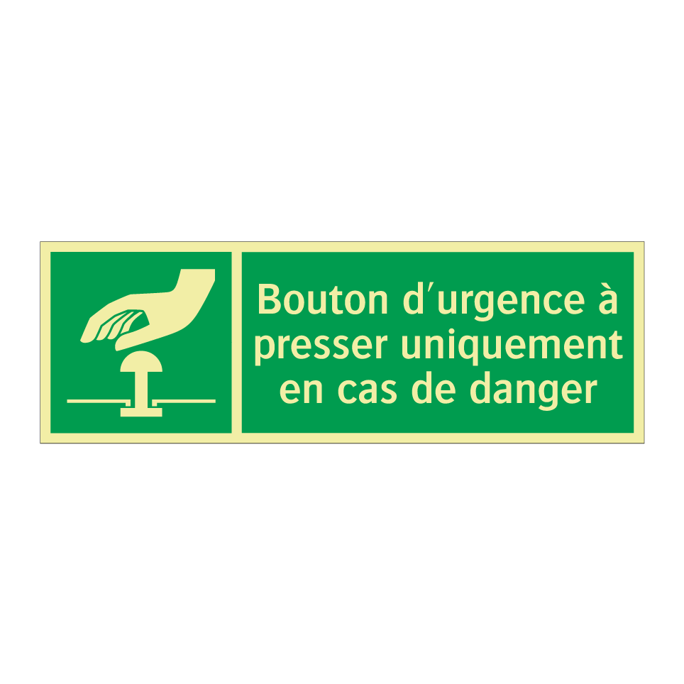 Panneau de secours avec le texte Bouton d'urgence à presser uniquement en cas de danger et une symbolique claire
