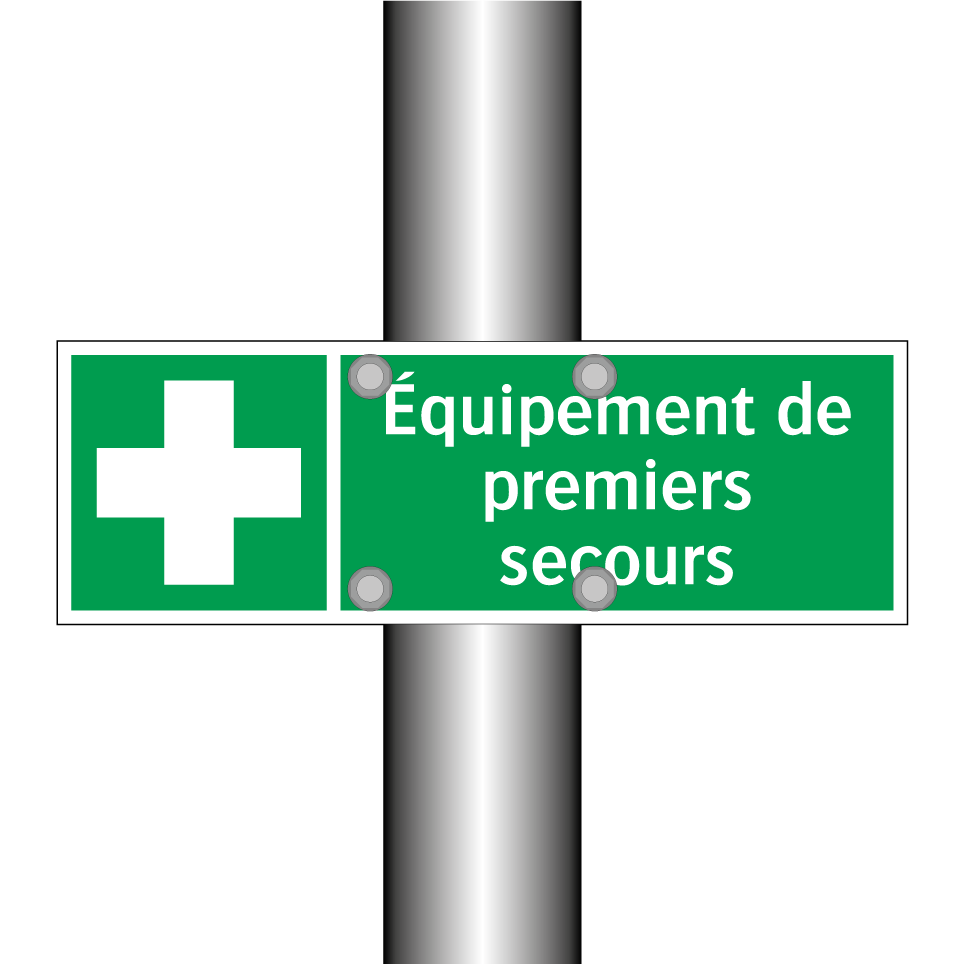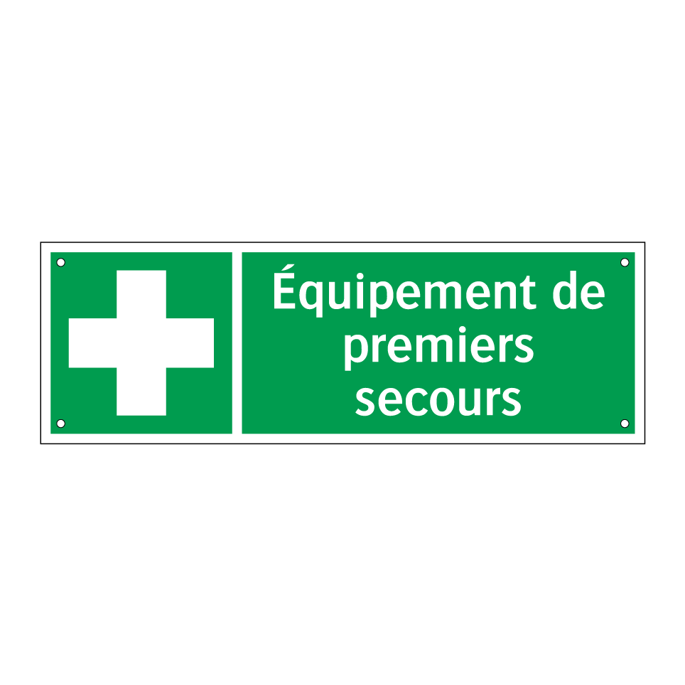 Panneau de secours avec le texte Équipement de premiers secours et une symbolique claire