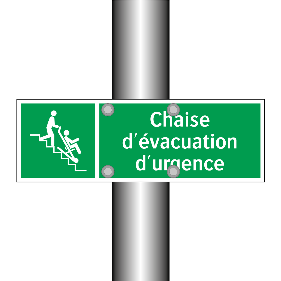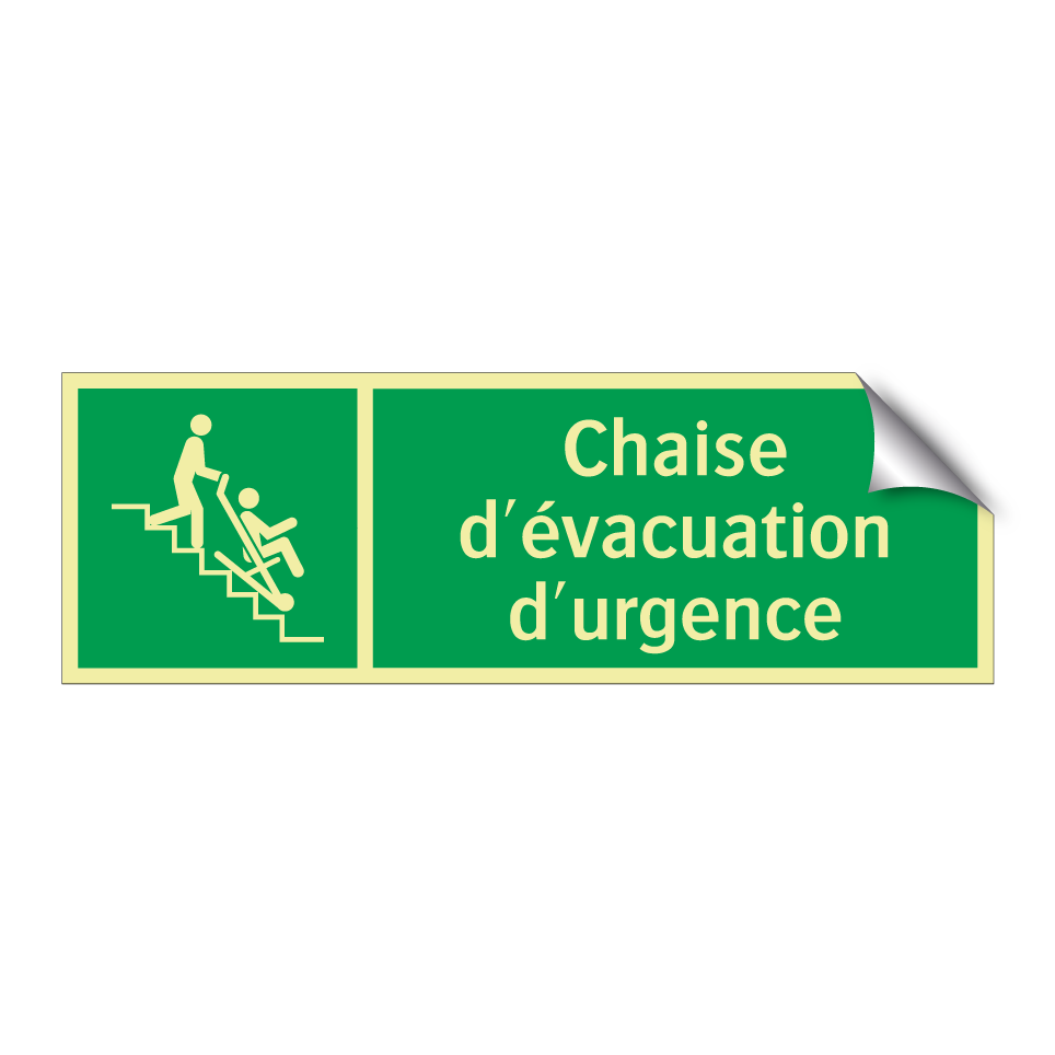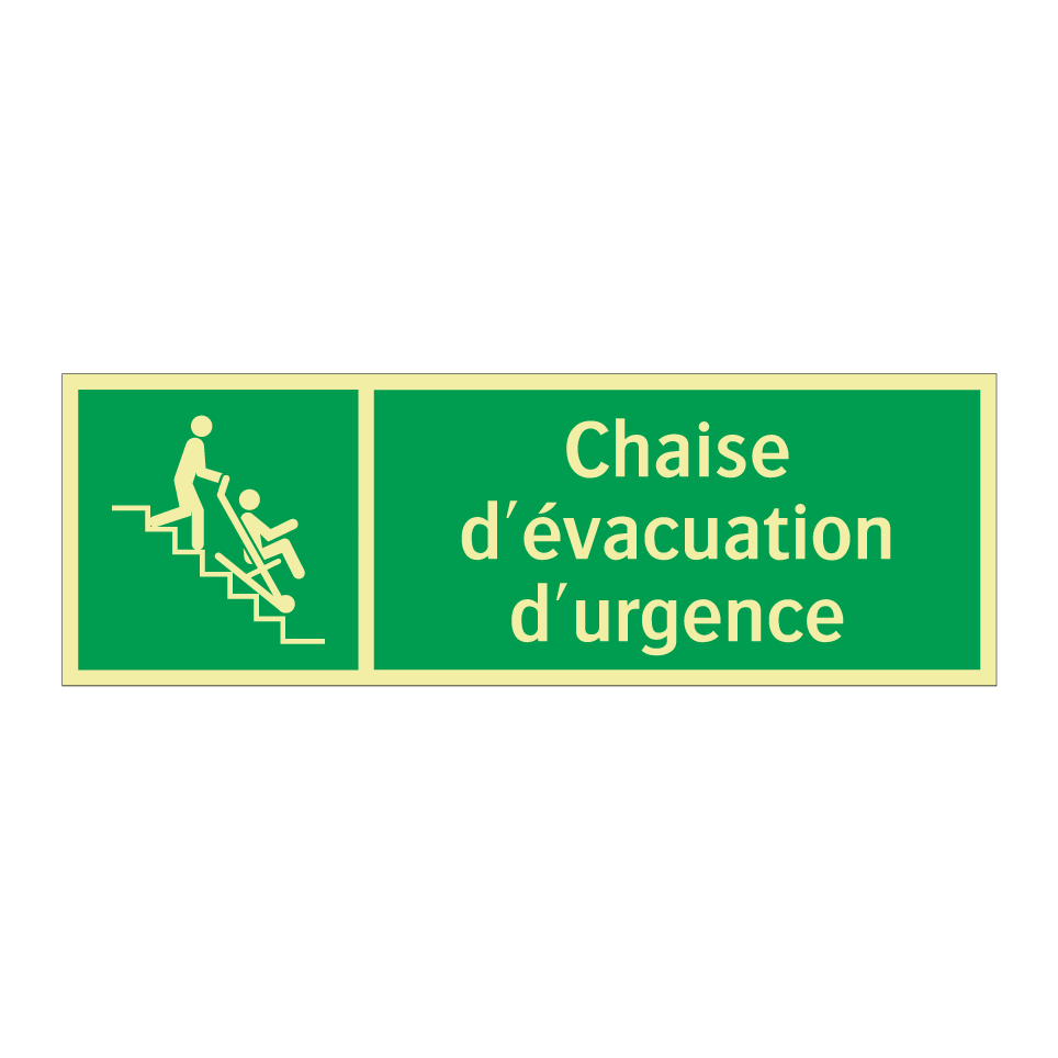 Panneau de secours avec le texte Chaise d'évacuation d'urgence et une symbolique claire