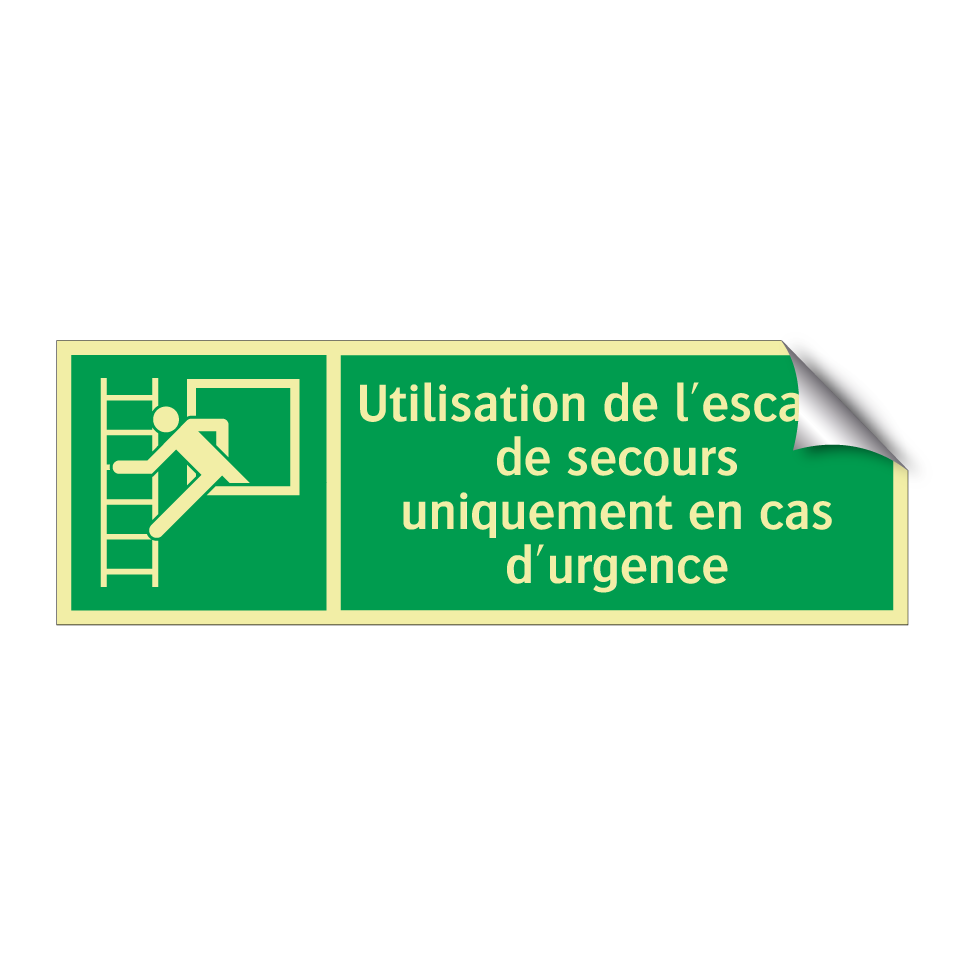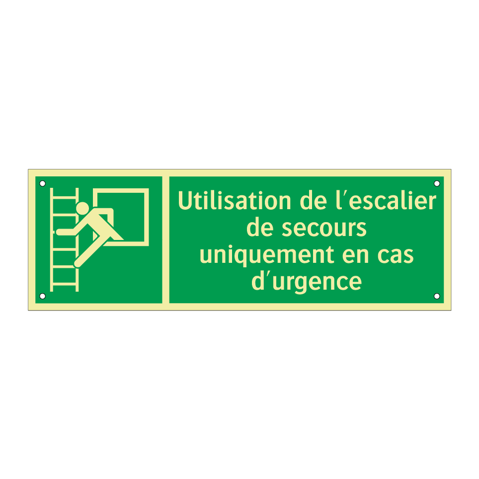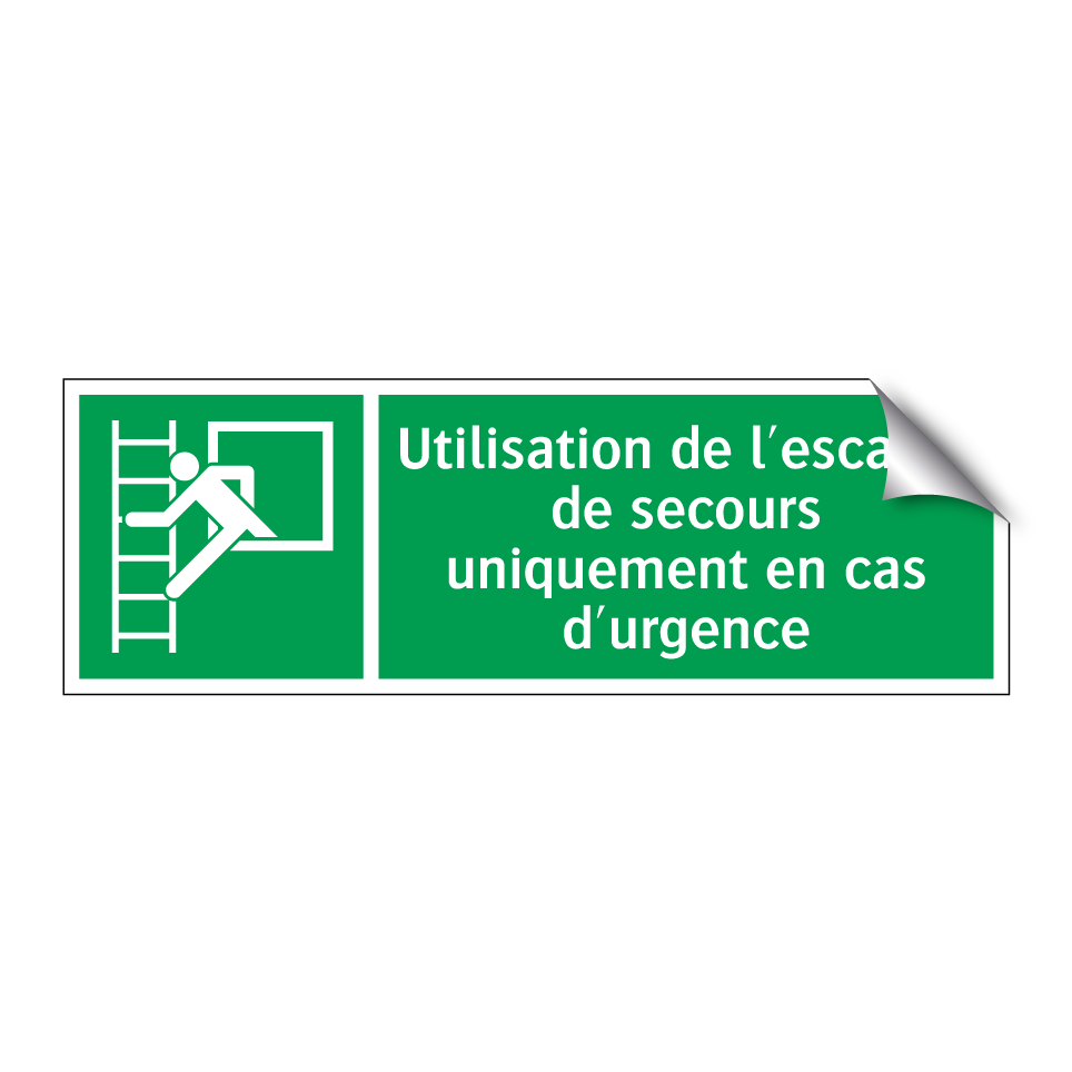 Panneau de secours avec le texte Utilisation de l'escalier de secours uniquement en cas d'urgence et une symbolique claire