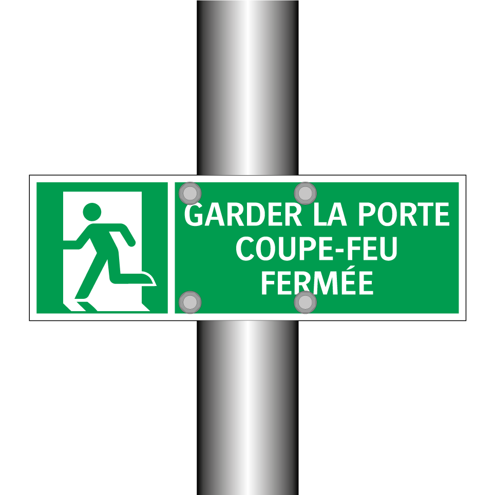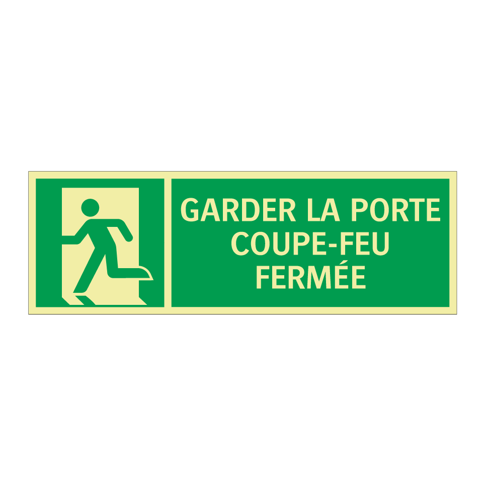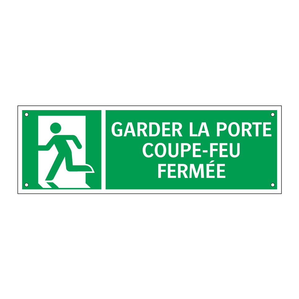 Panneau de secours avec le texte GARDER LA PORTE COUPE-FEU FERMÉE et une symbolique claire