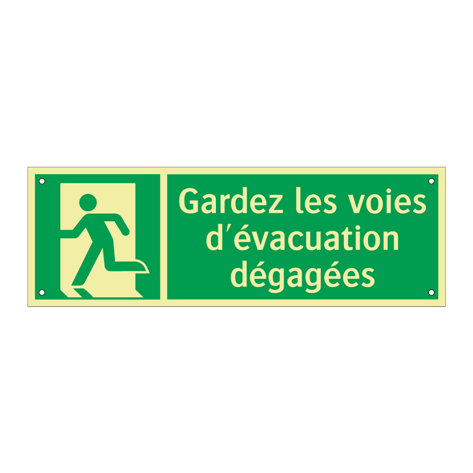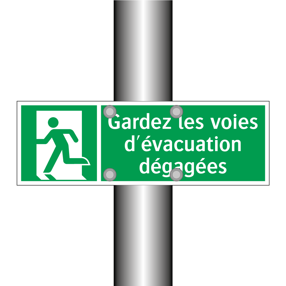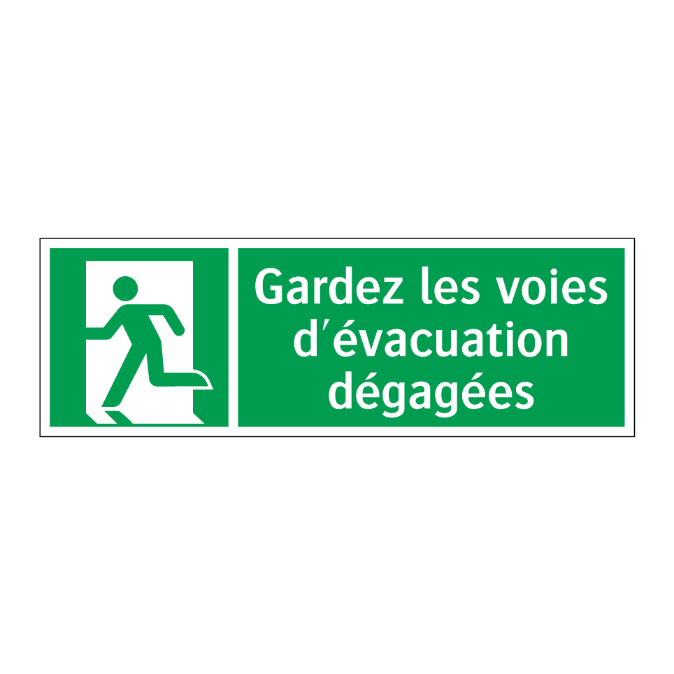 Panneau de secours avec le texte Gardez les voies d'évacuation dégagées et une symbolique claire
