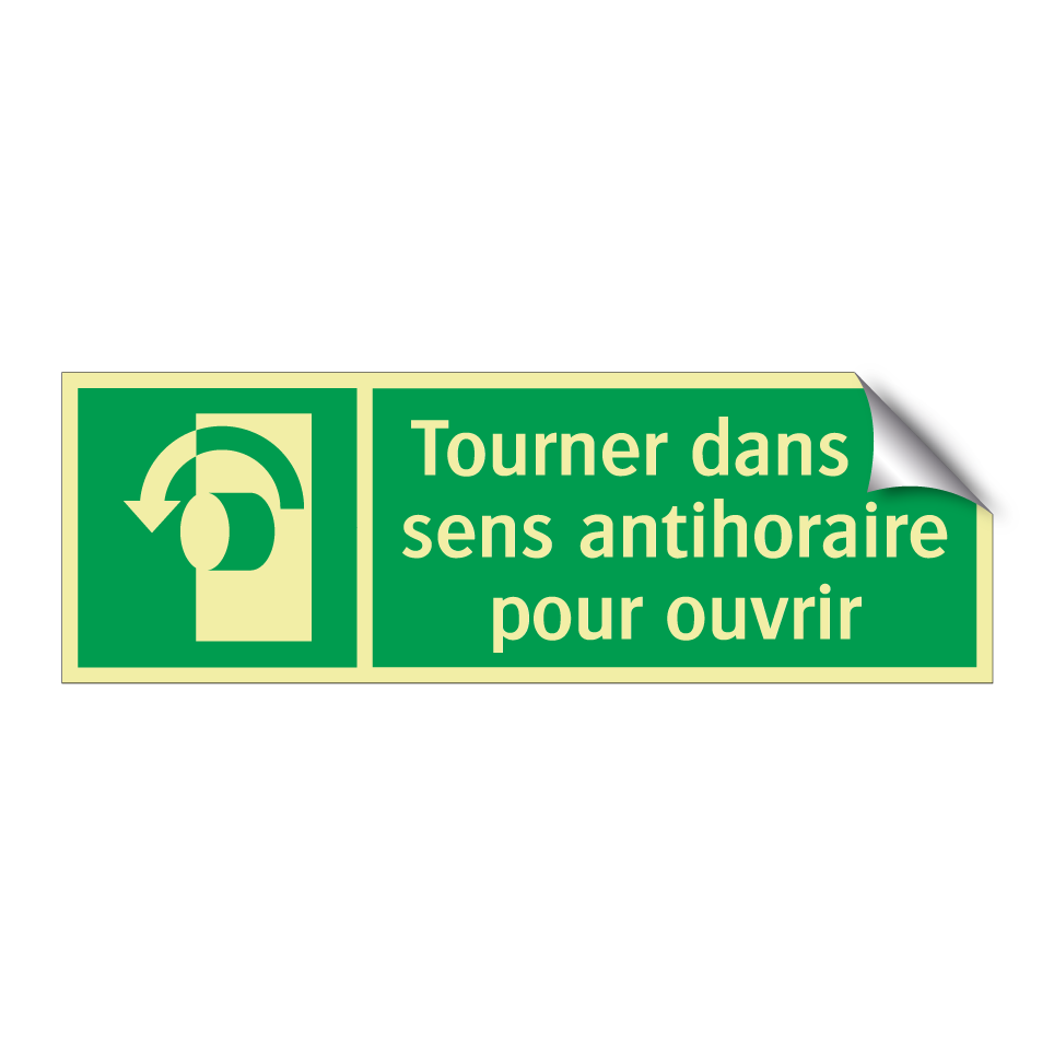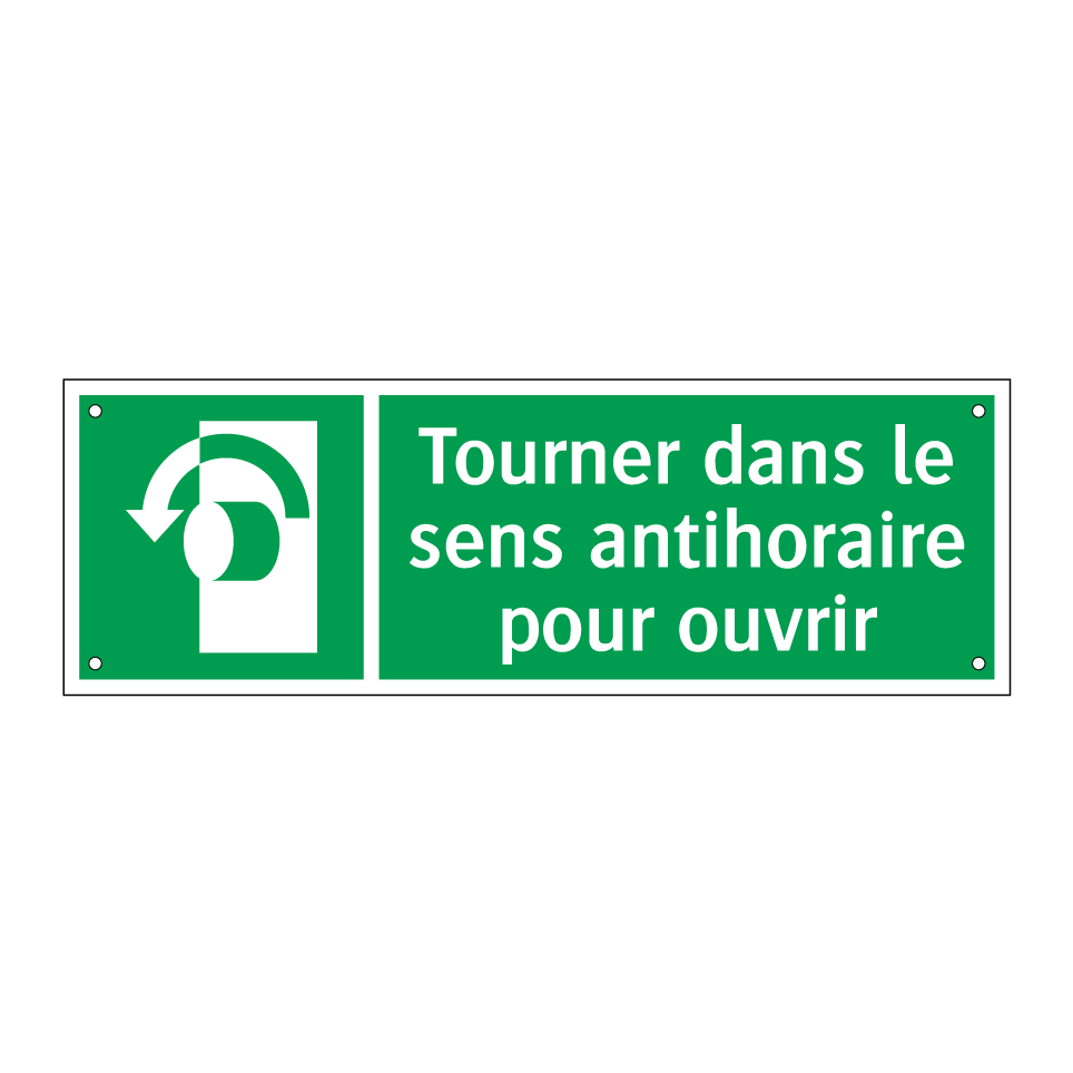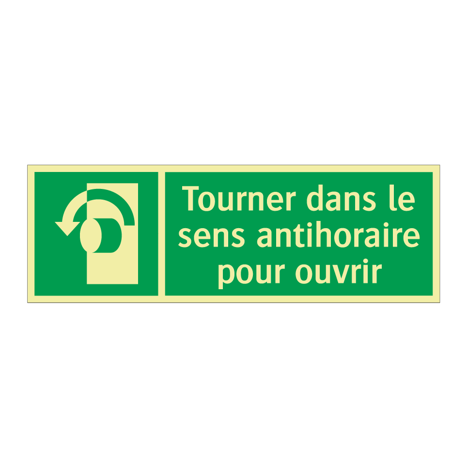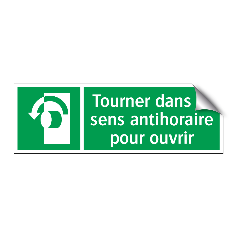 Panneau de secours avec le texte Tourner dans le sens antihoraire pour ouvrir et une symbolique claire