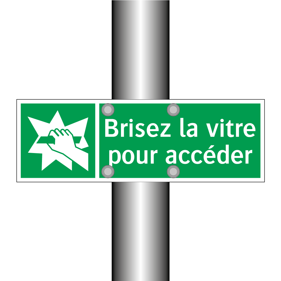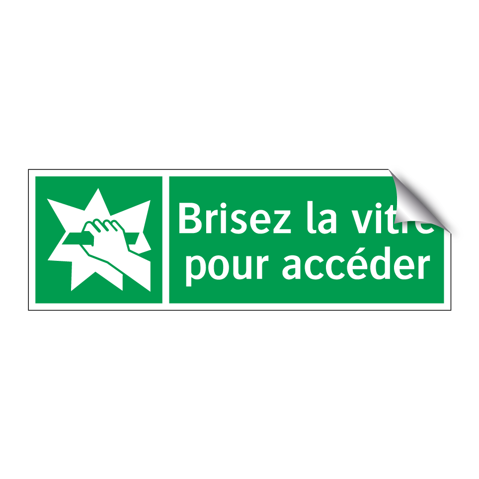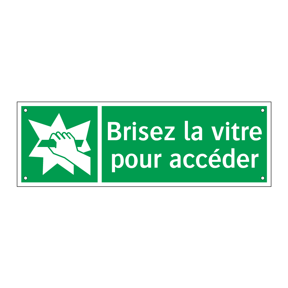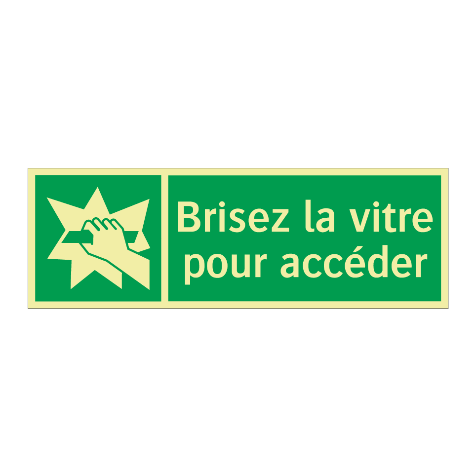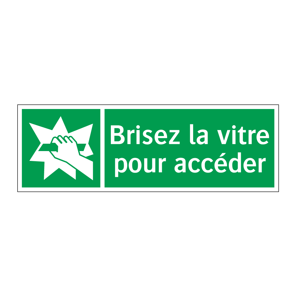 Panneau de secours avec le texte Brisez la vitre pour accéder et une symbolique claire