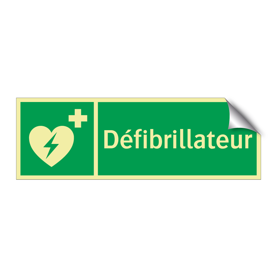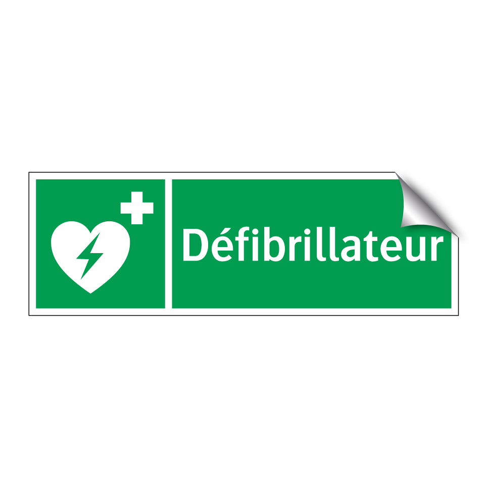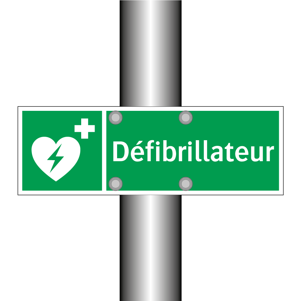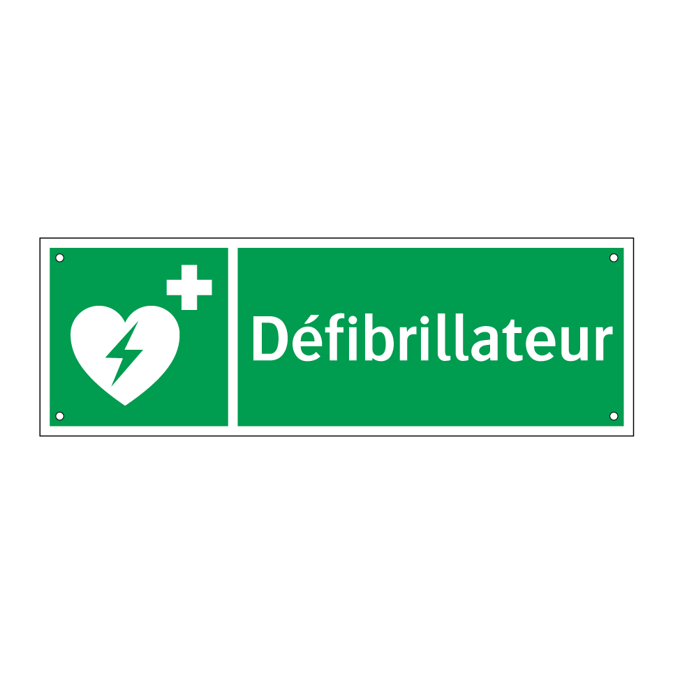 Panneau de secours avec le texte Défibrillateur et une symbolique claire