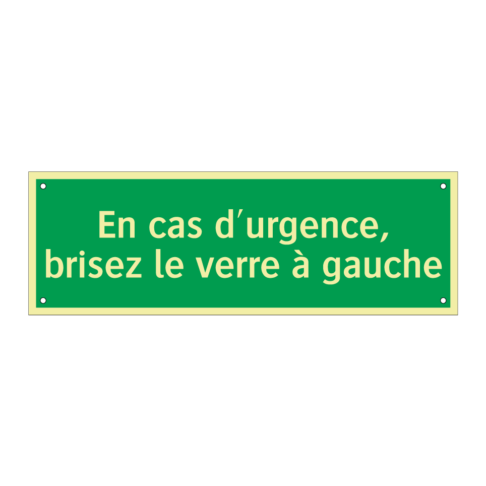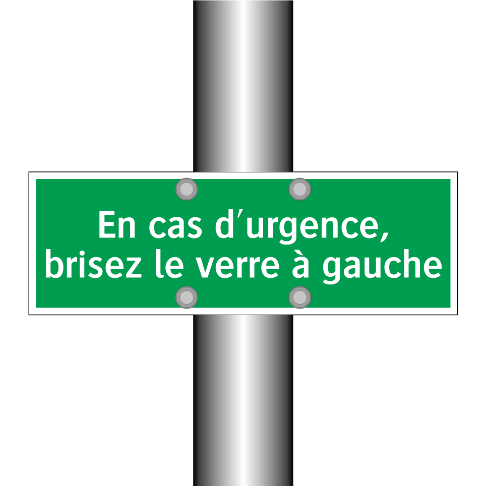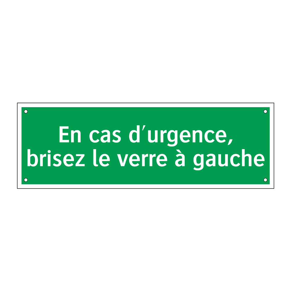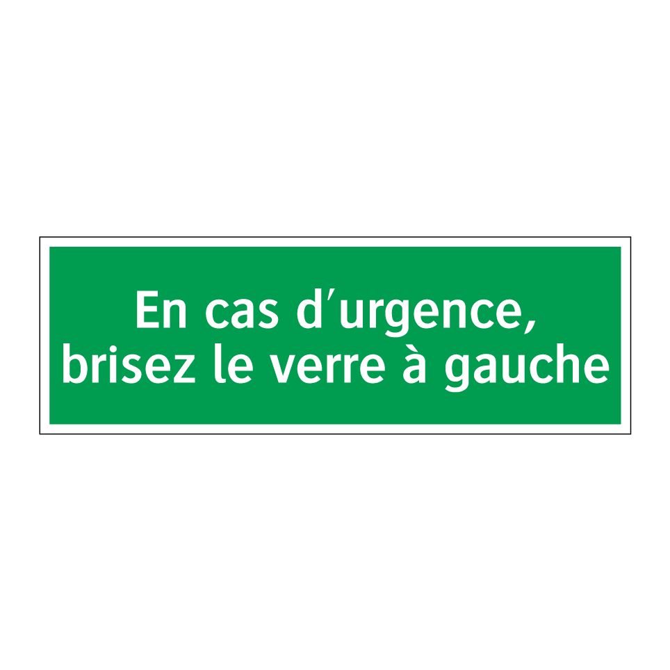 Panneau de secours avec le texte En cas d'urgence, brisez le verre à gauche