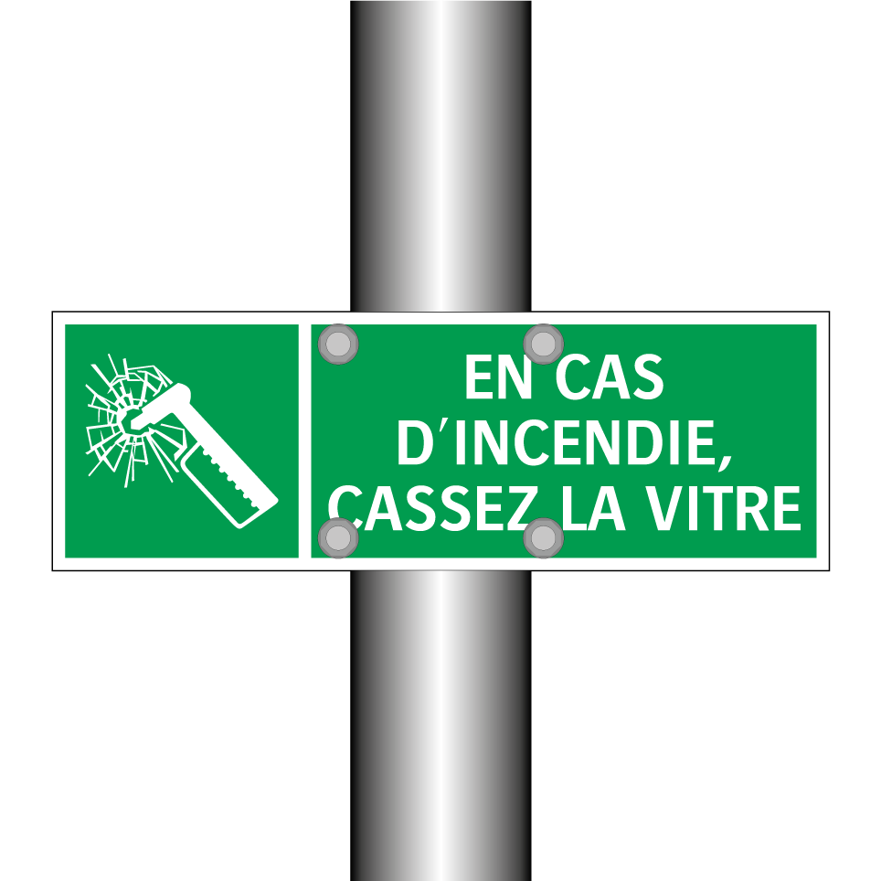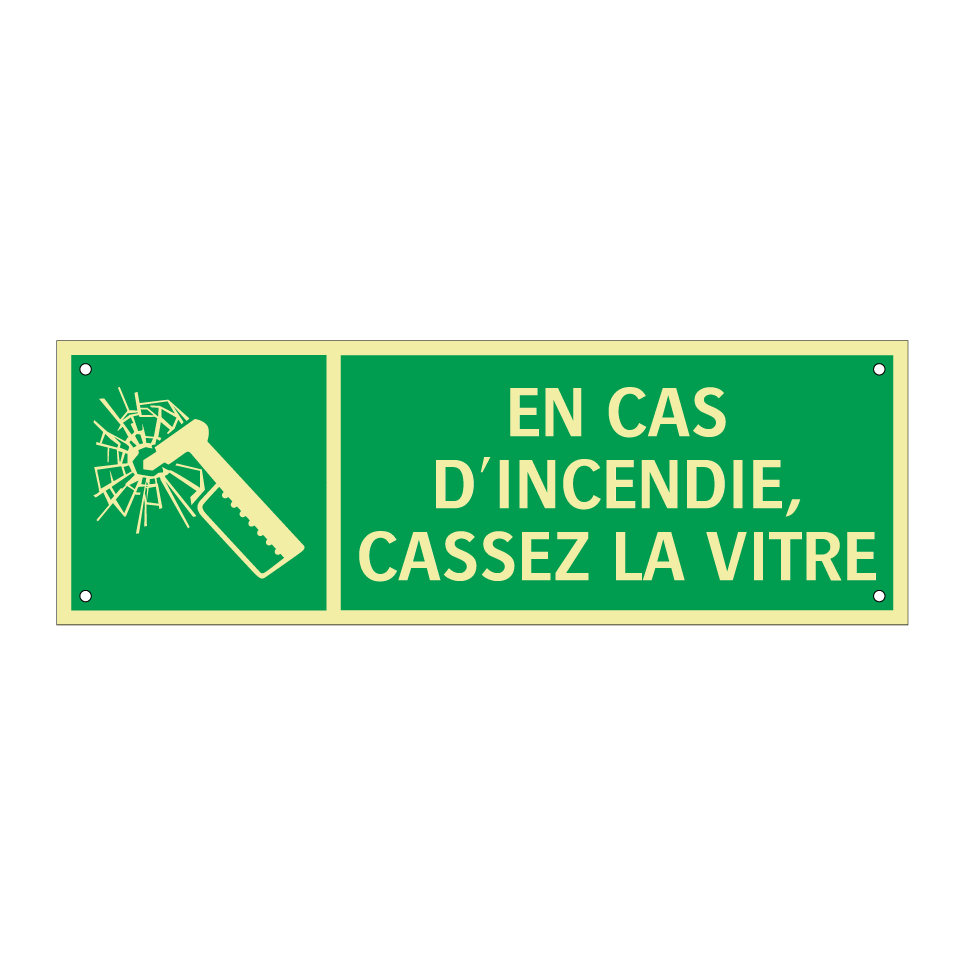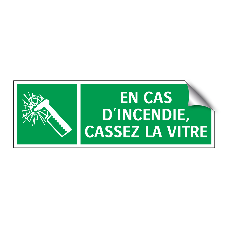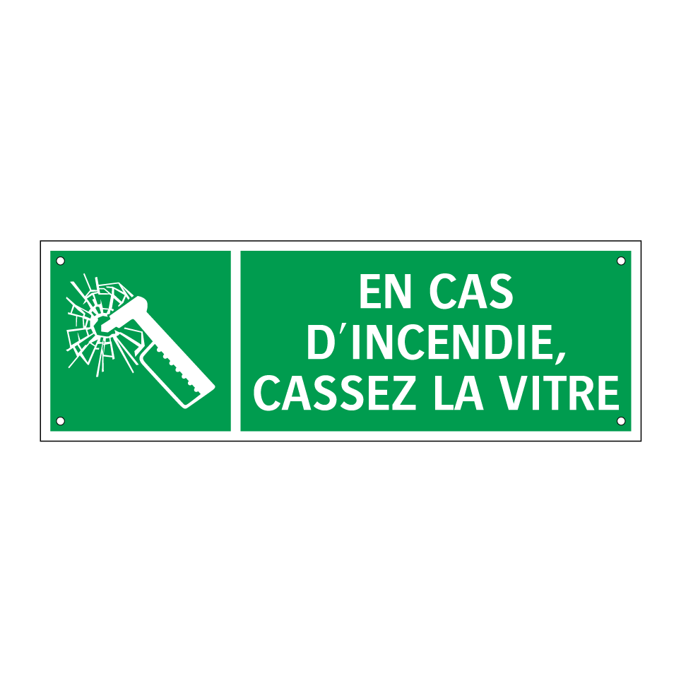 Panneau de secours avec le texte EN CAS D'INCENDIE, CASSEZ LA VITRE et une symbolique claire