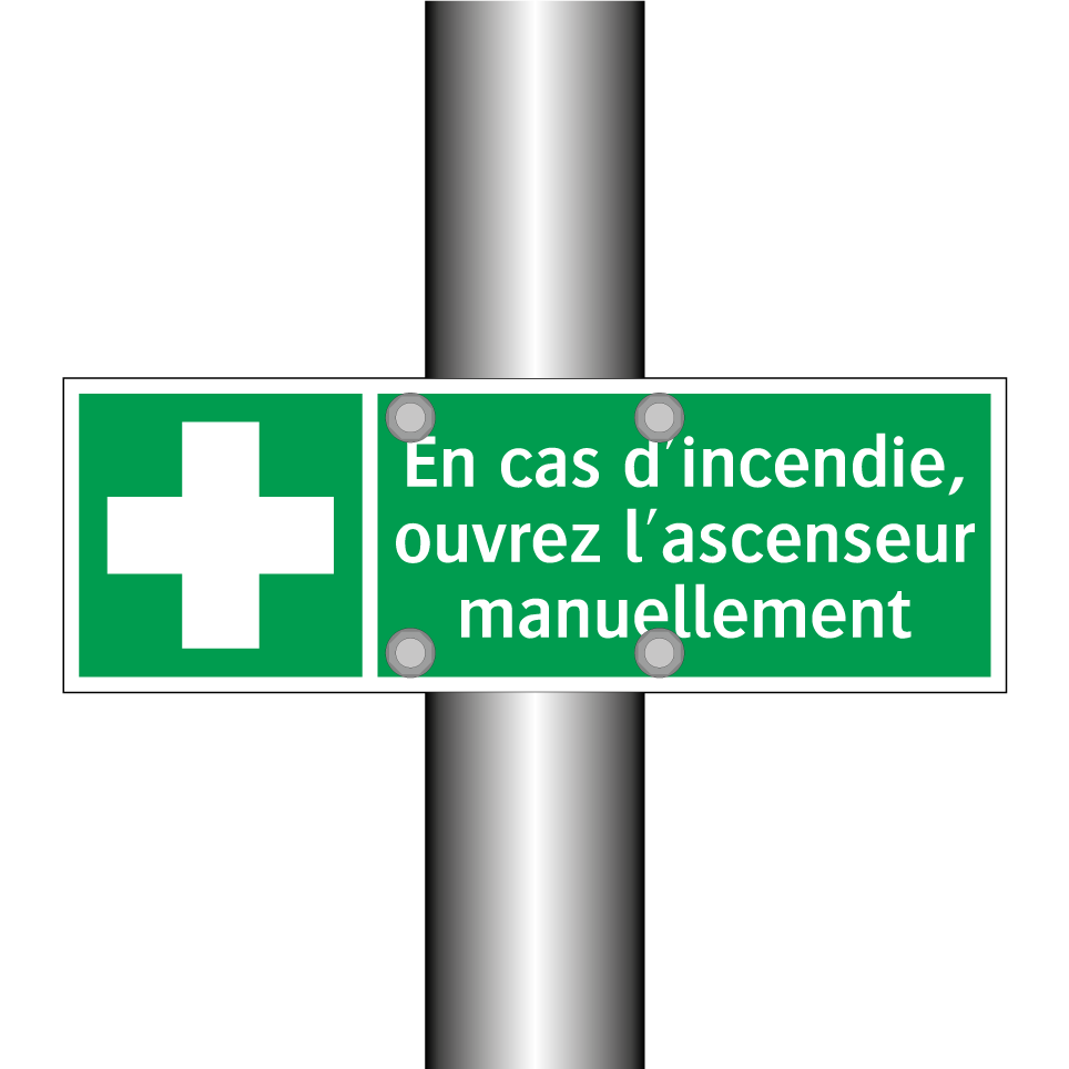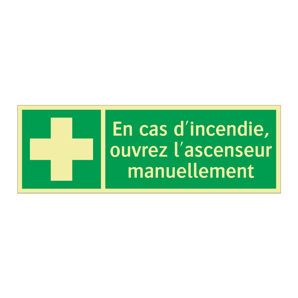 Panneau de secours avec le texte En cas d'incendie, ouvrez l'ascenseur manuellement et une symbolique claire