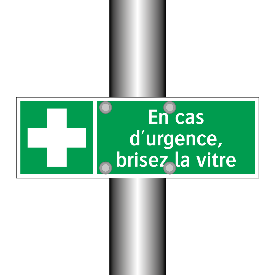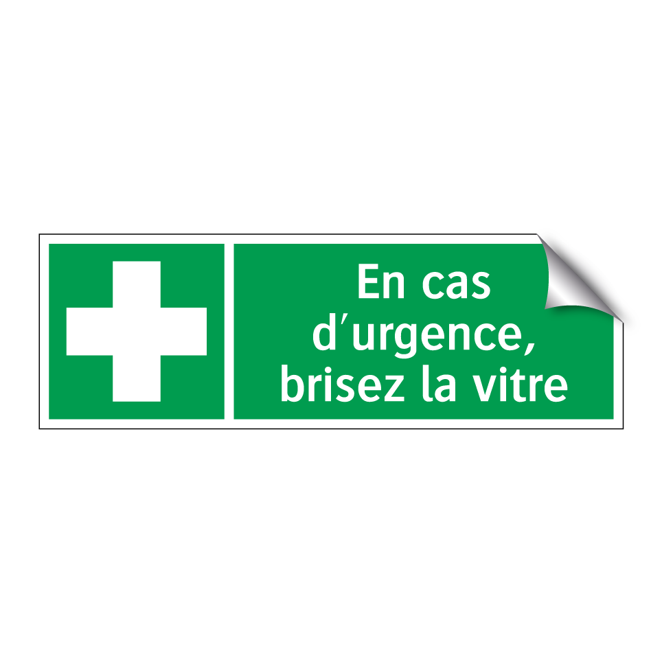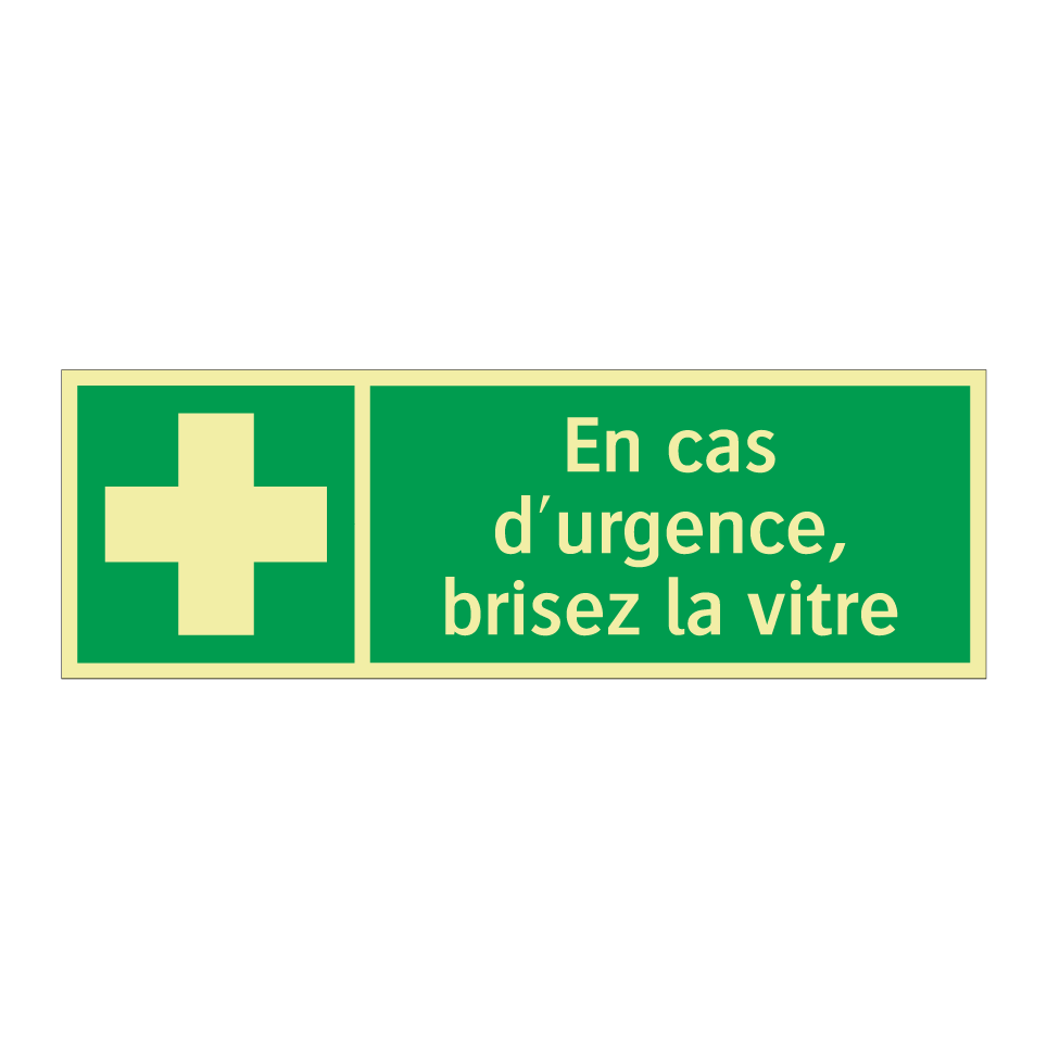 Panneau de secours avec le texte En cas d'urgence, brisez la vitre et une symbolique claire