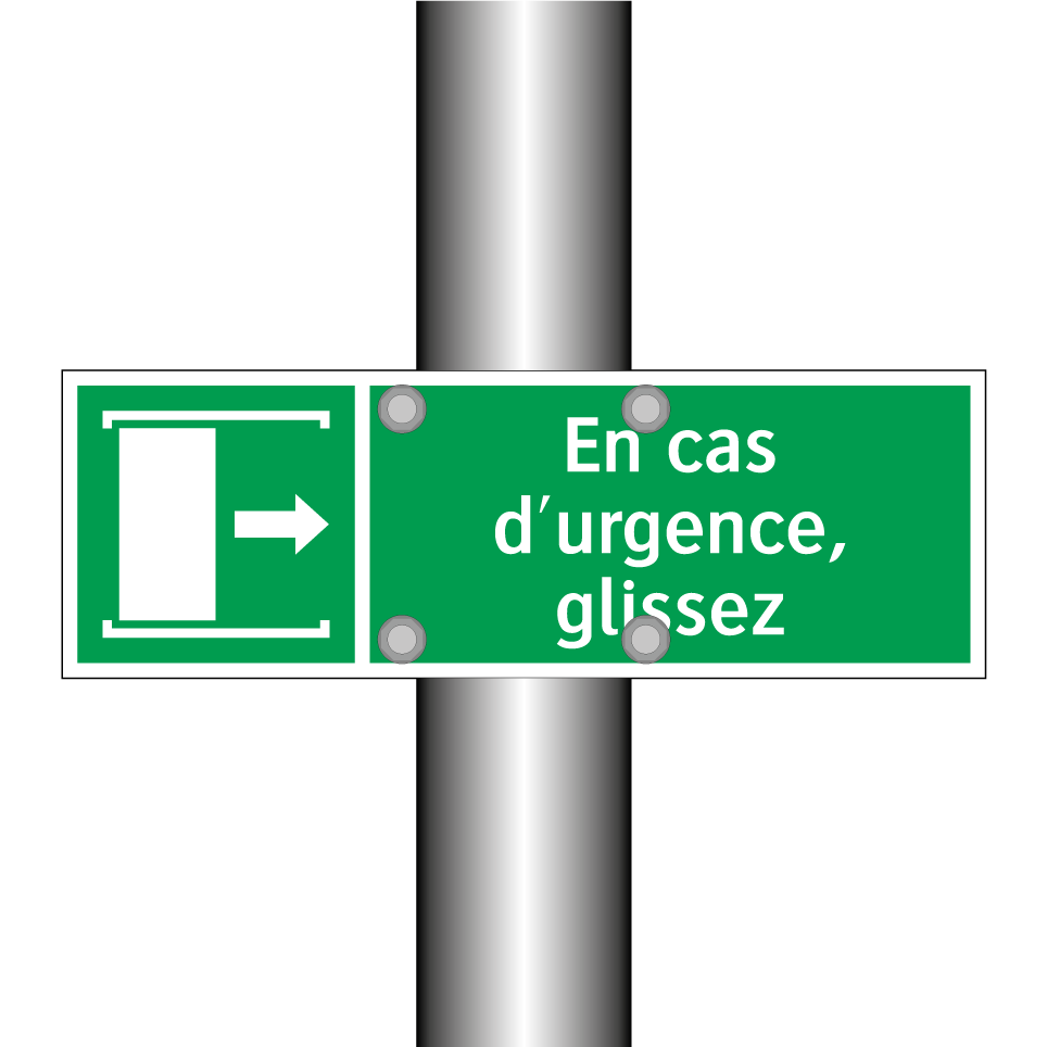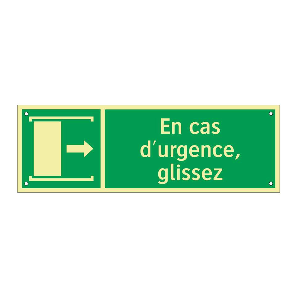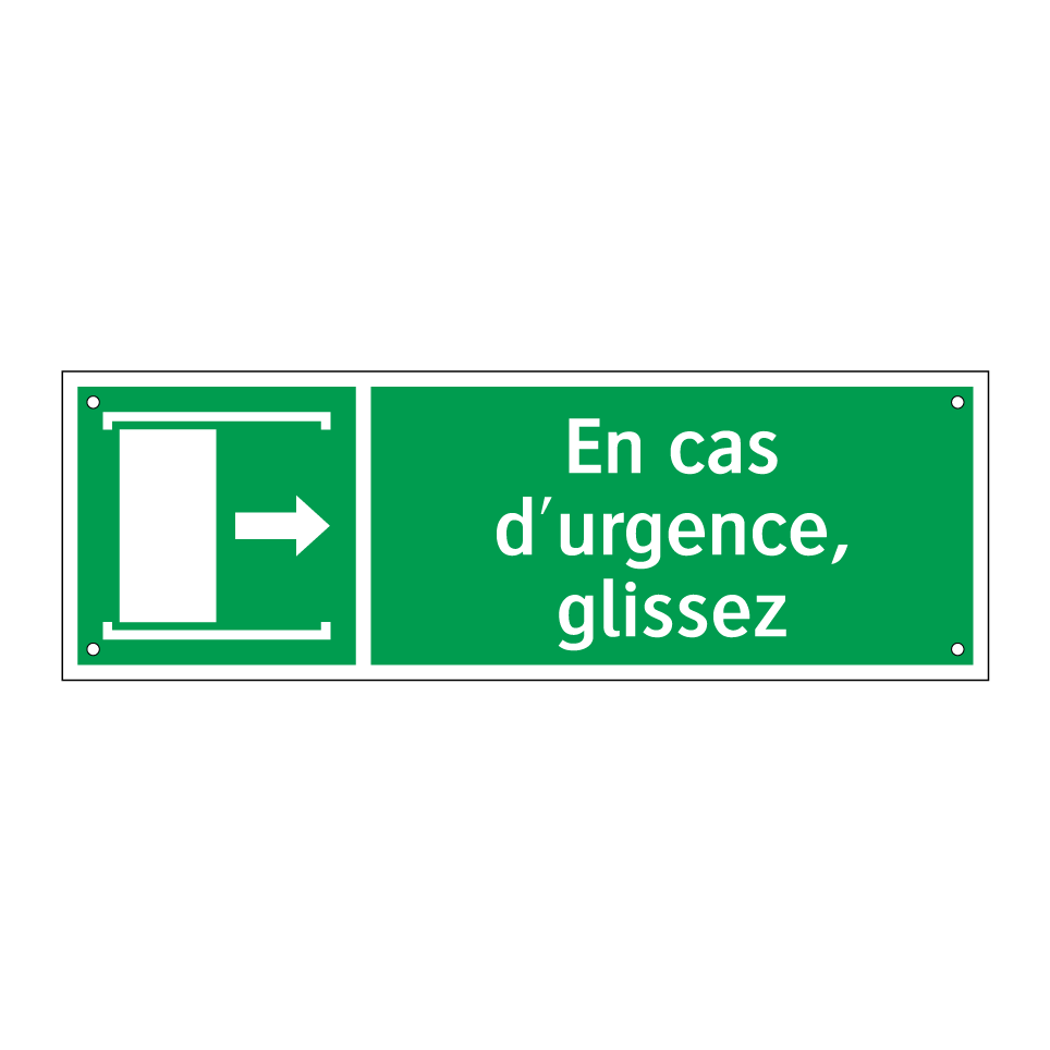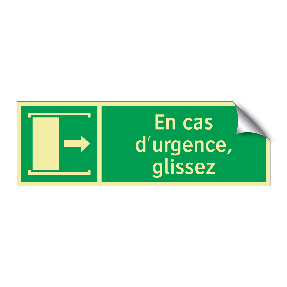 Panneau de secours avec le texte En cas d'urgence, glissez et une symbolique claire