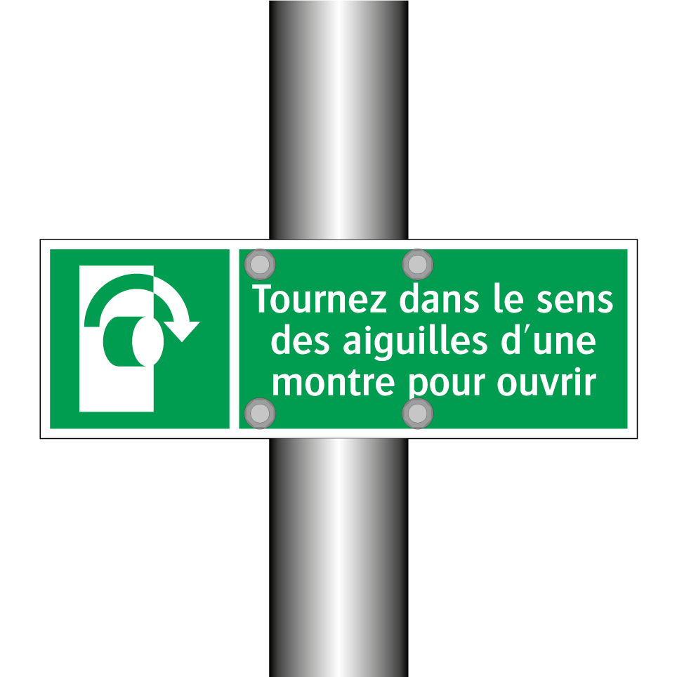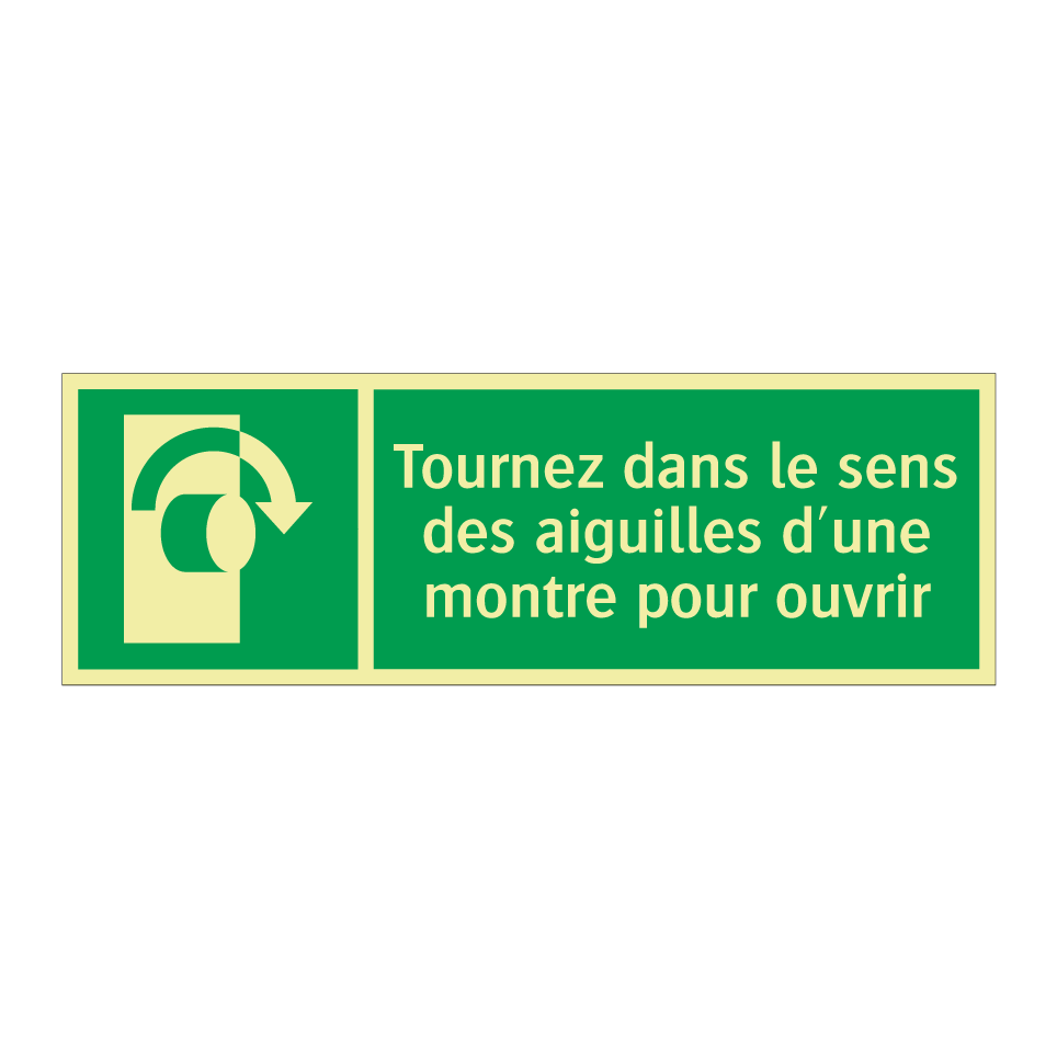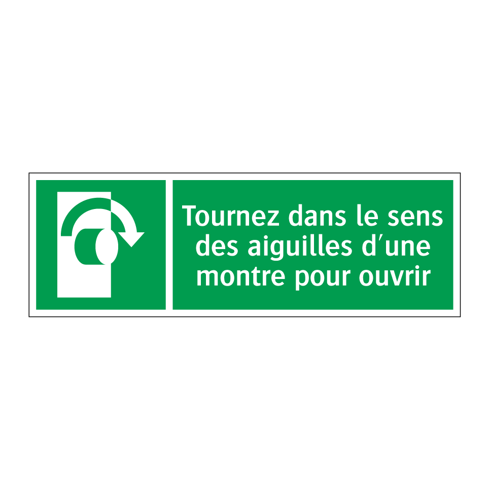 Panneau de secours avec le texte Tournez dans le sens des aiguilles d'une montre pour ouvrir et une symbolique claire
