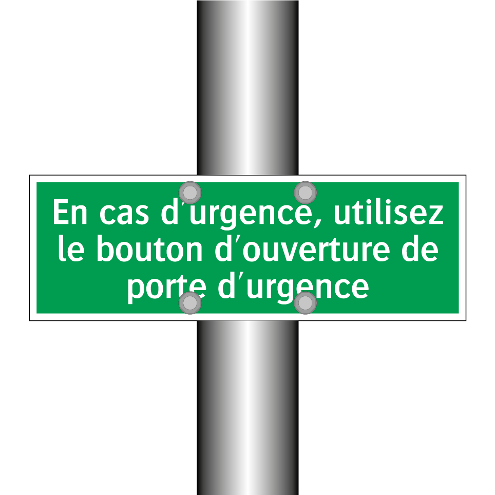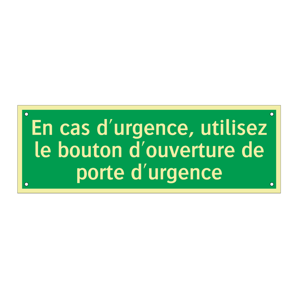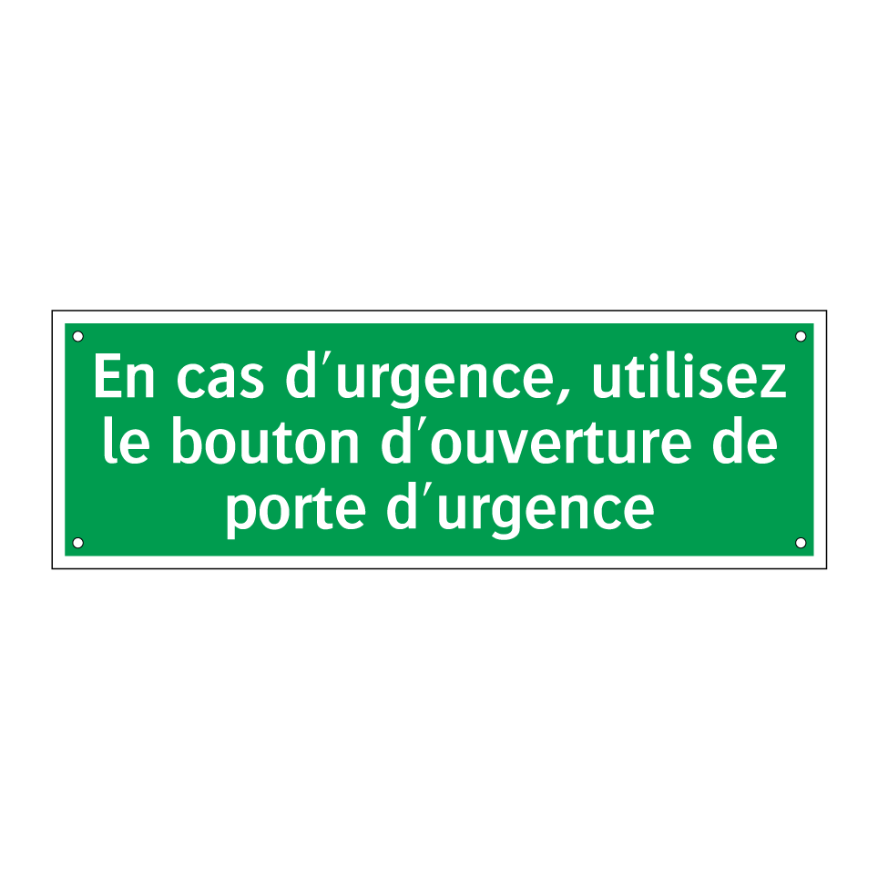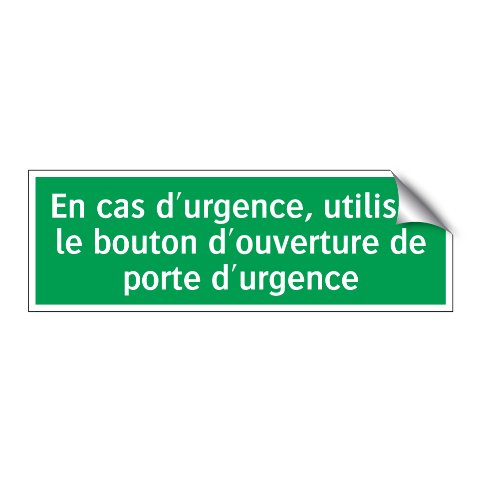 Panneau de secours avec le texte En cas d'urgence, utilisez le bouton d'ouverture de porte d'urgence