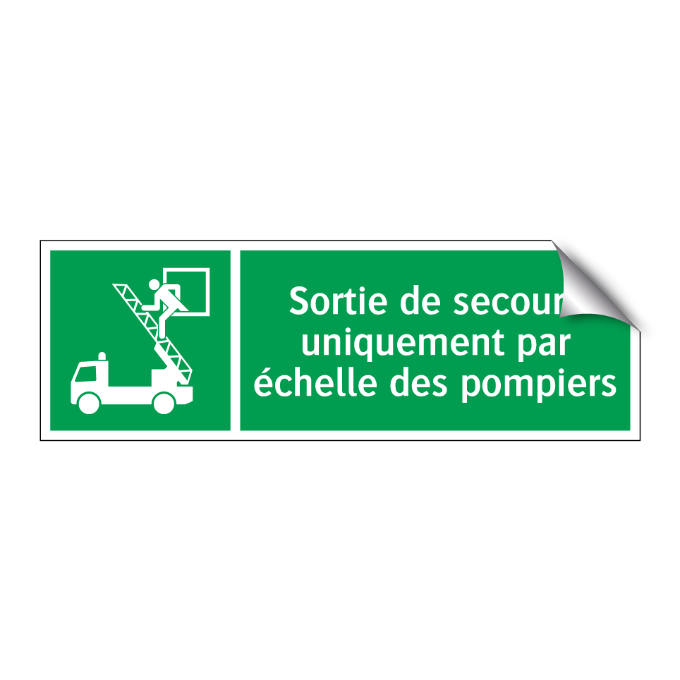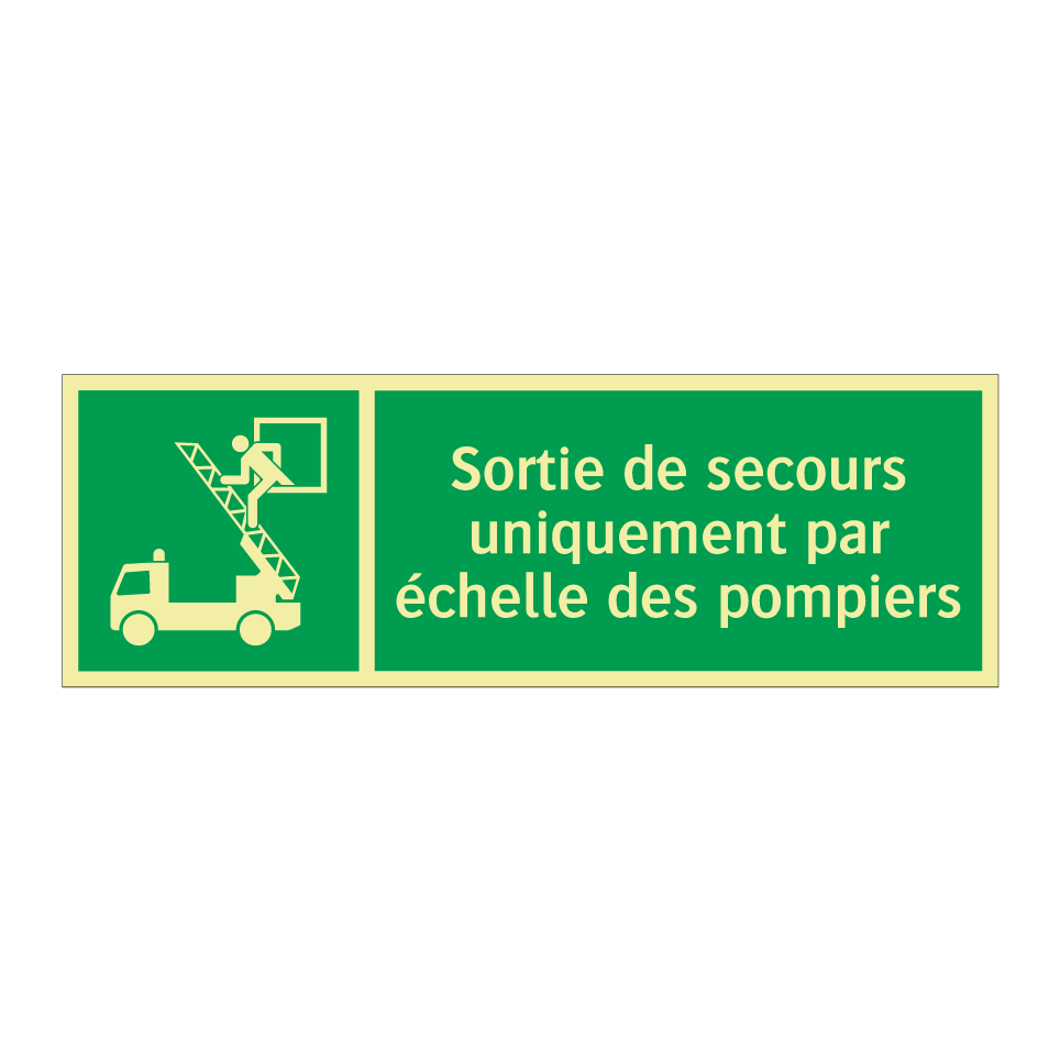 Panneau de secours avec le texte Sortie de secours uniquement par échelle des pompiers et une symbolique claire