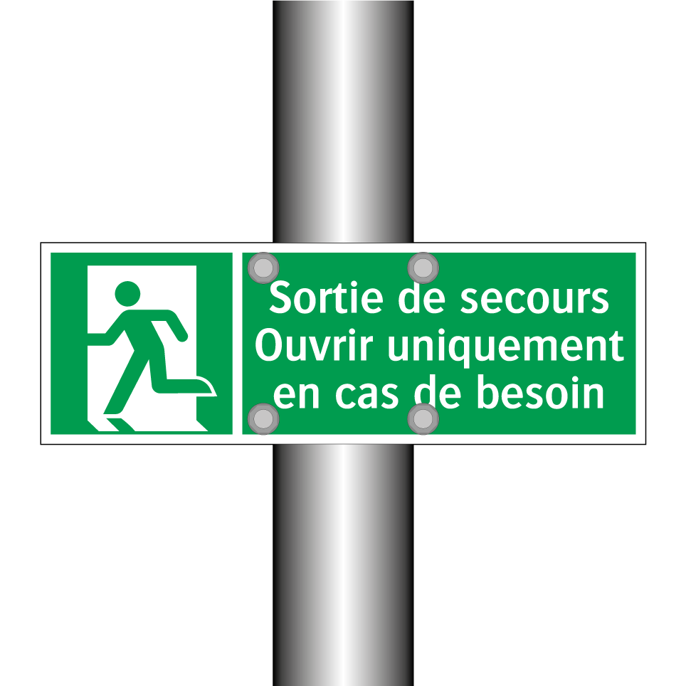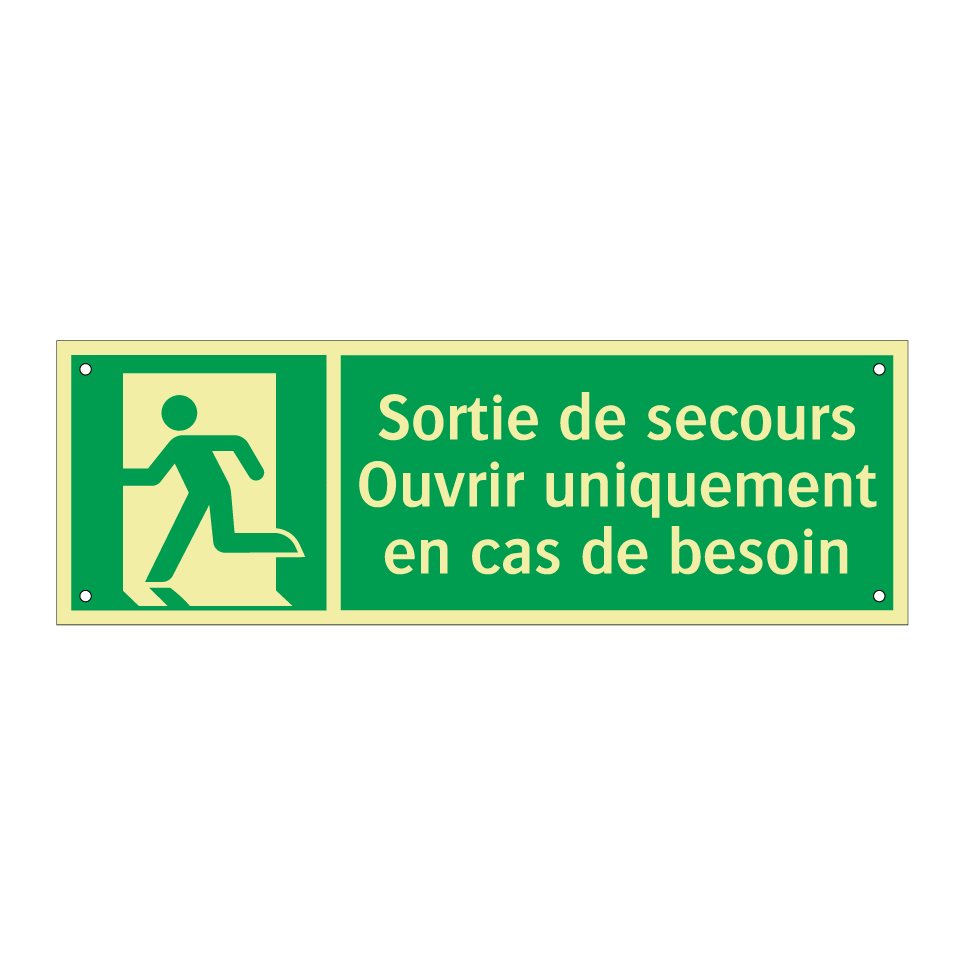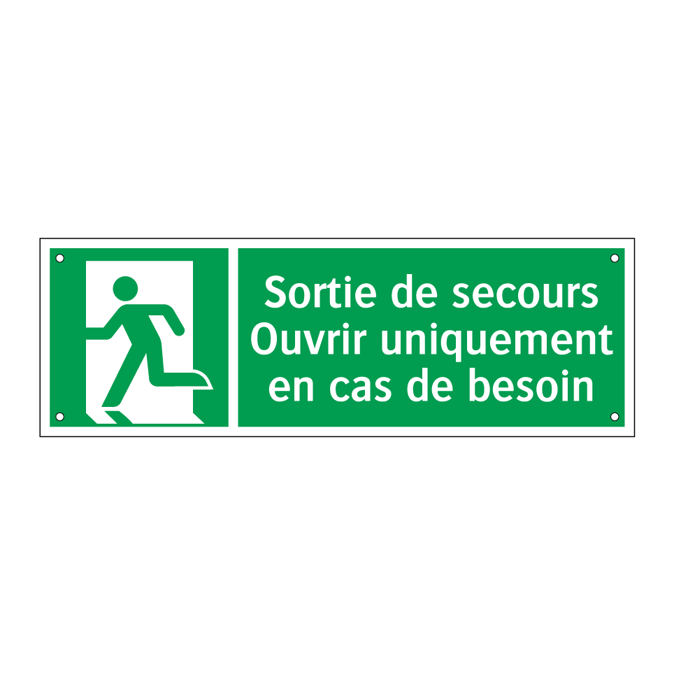 Panneau de secours avec le texte Sortie de secours Ouvrir uniquement en cas de besoin et une symbolique claire