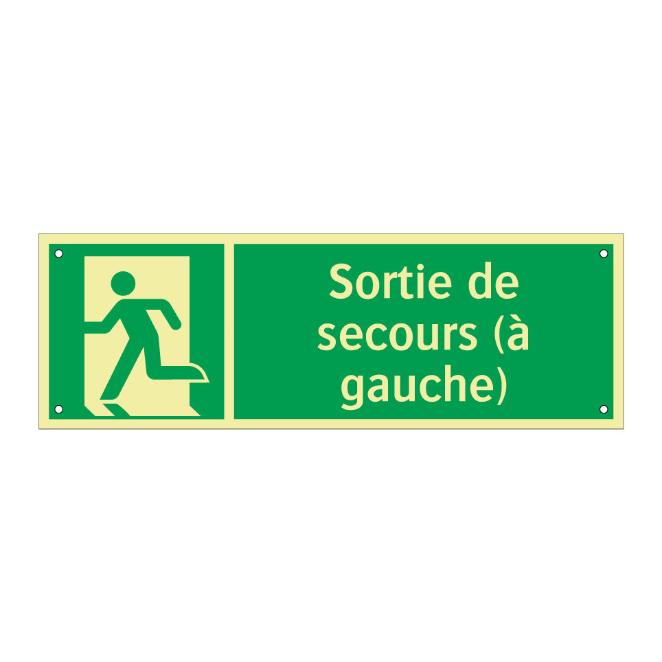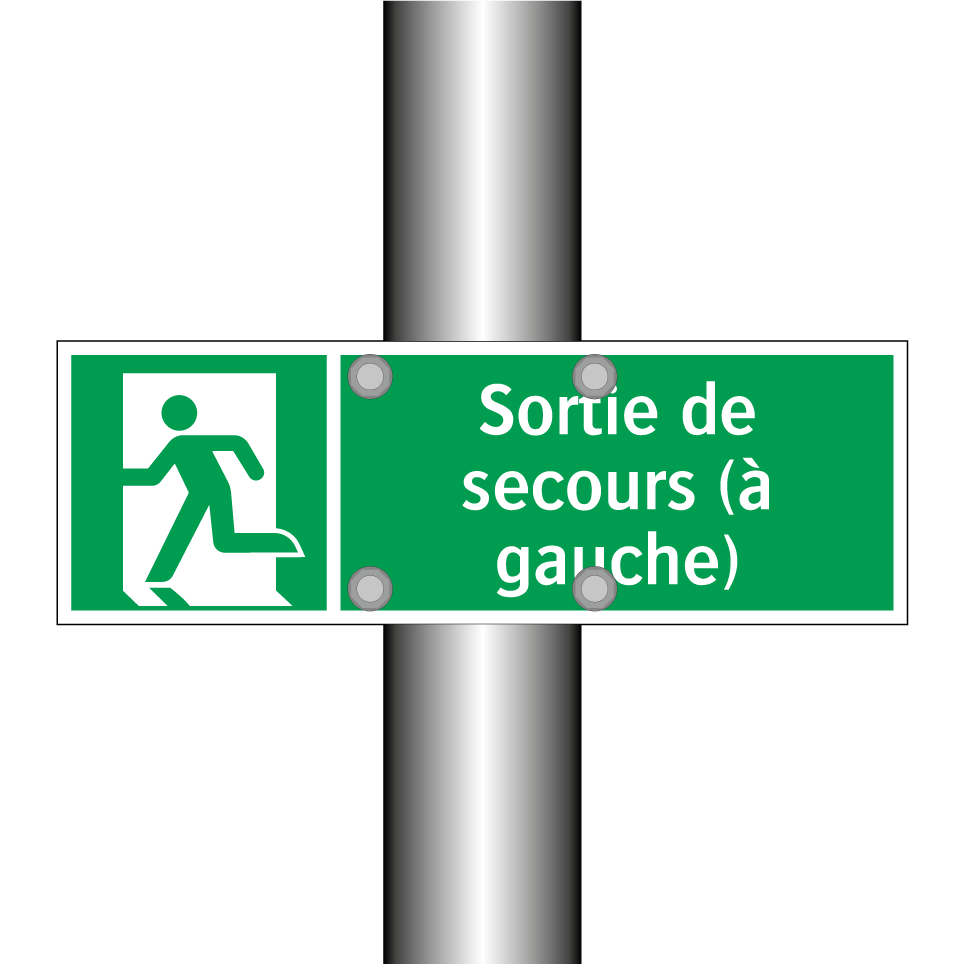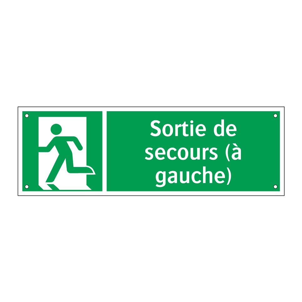 Panneau de secours avec le texte Sortie de secours (à gauche) et une symbolique claire
