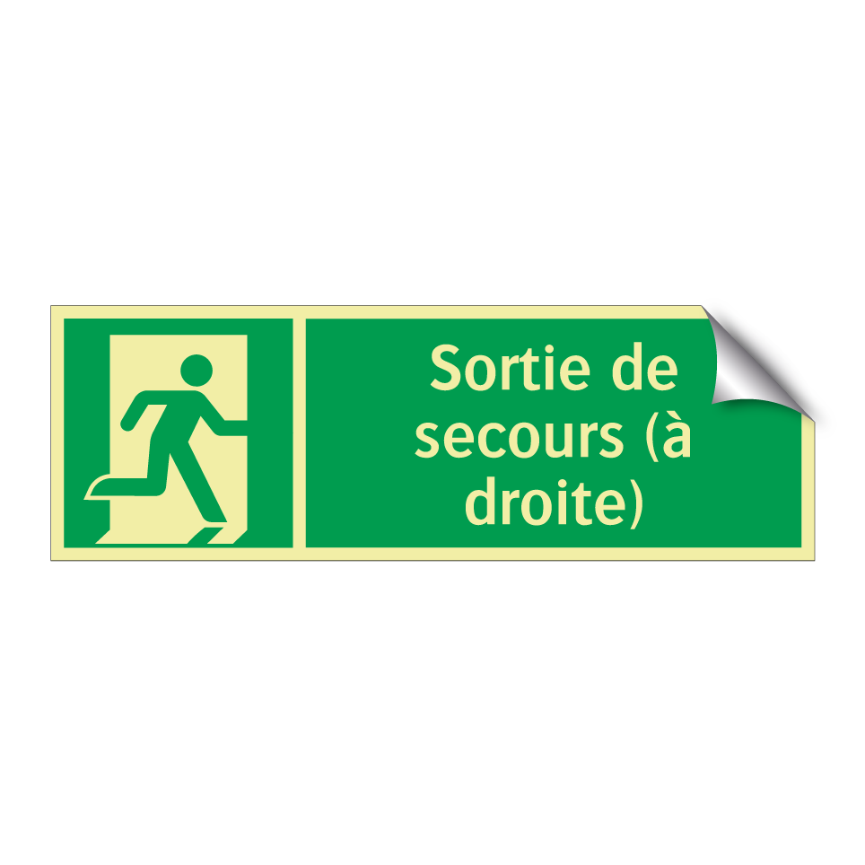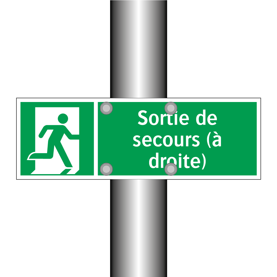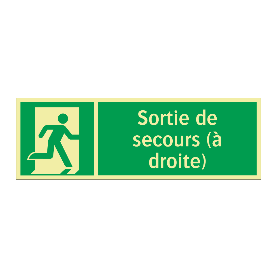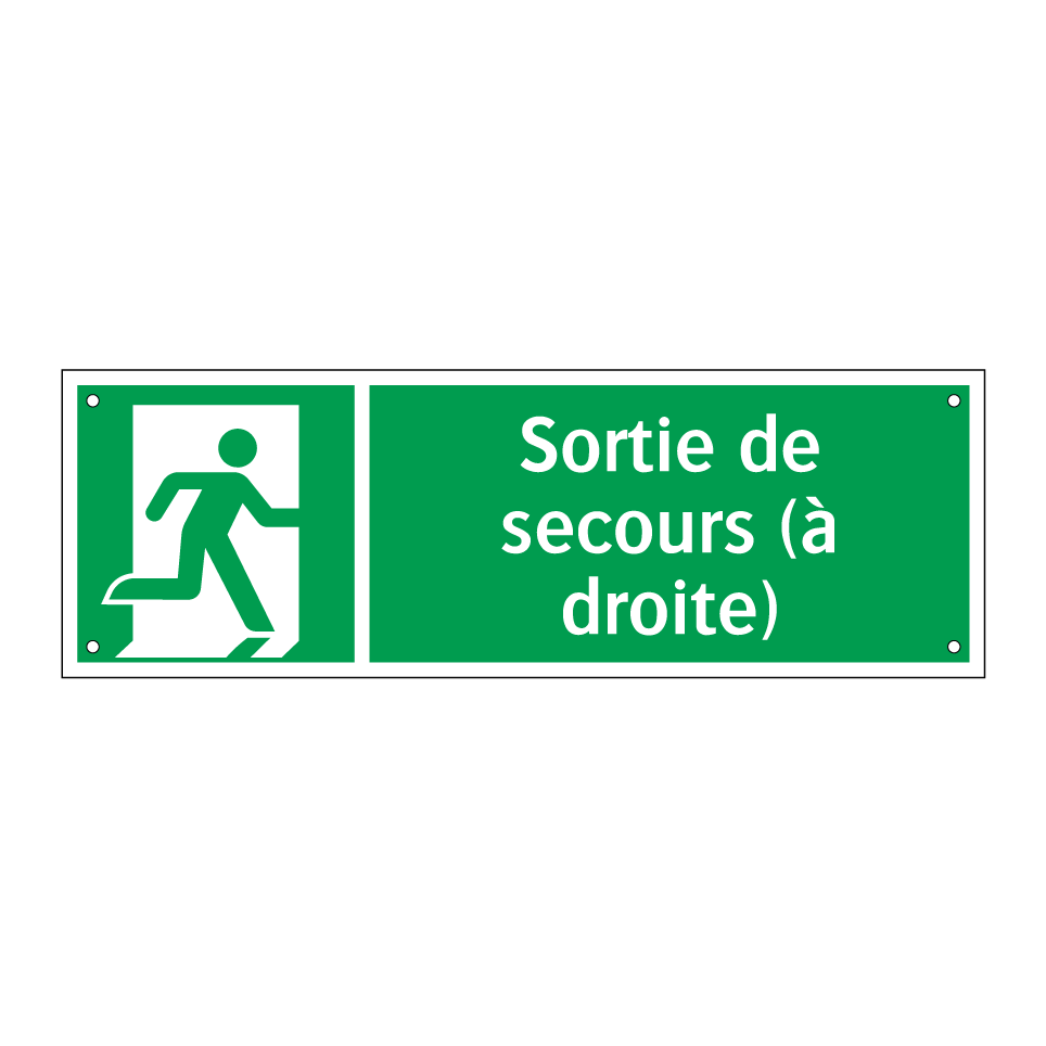 Panneau de secours avec le texte Sortie de secours (à droite) et une symbolique claire