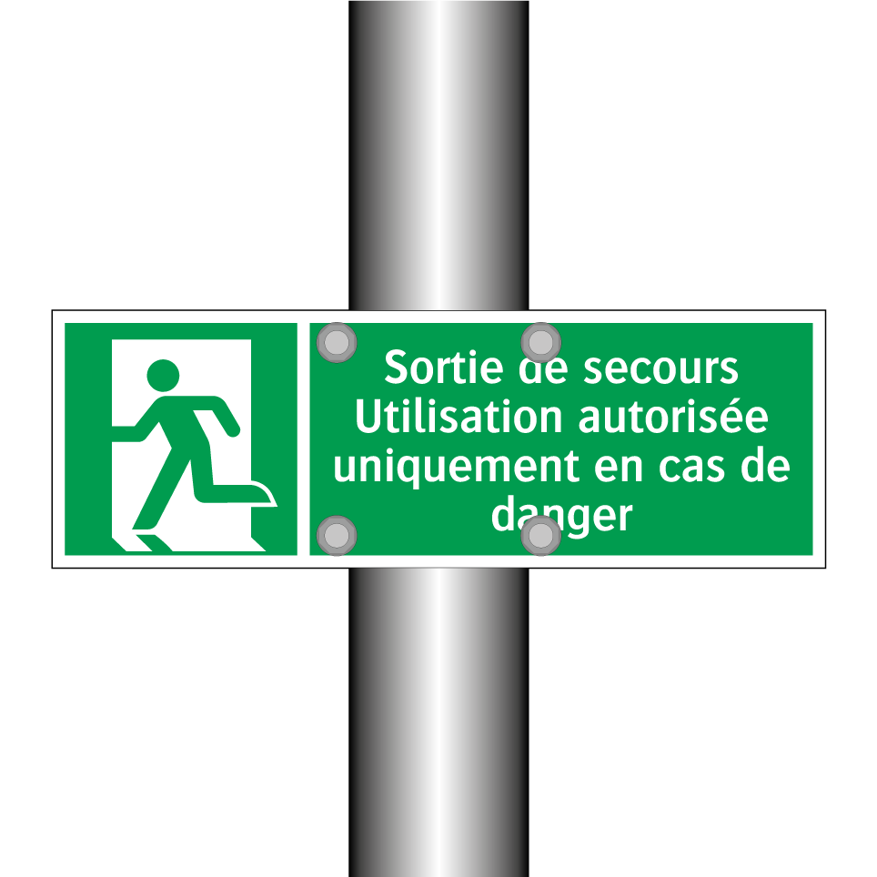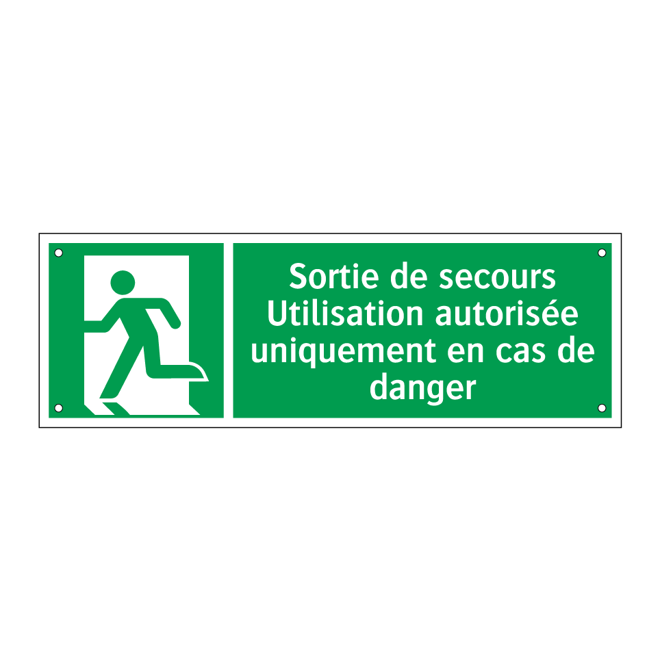 Panneau de secours avec le texte Sortie de secours Utilisation autorisée uniquement en cas de danger et une symbolique claire