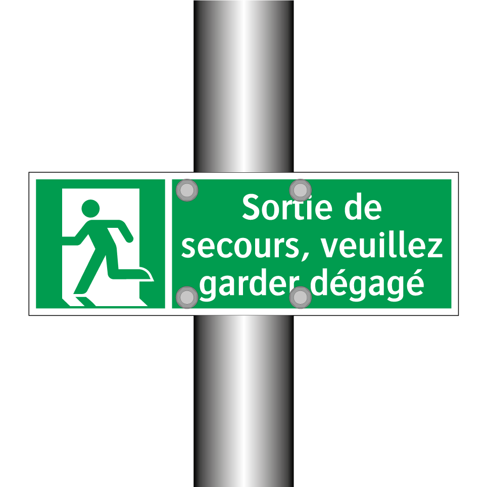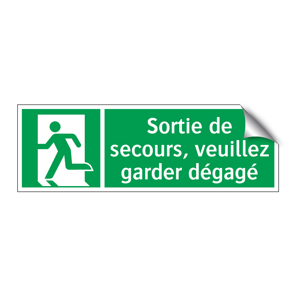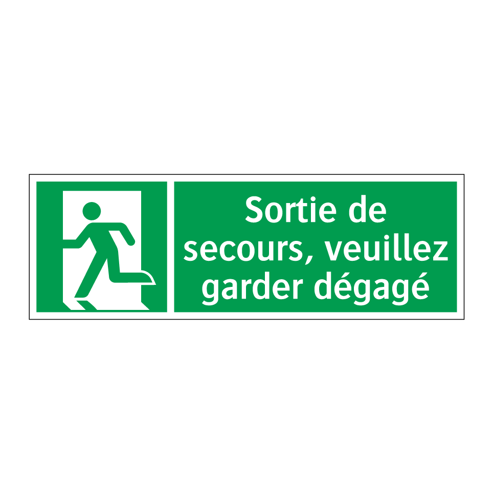 Panneau de secours avec le texte Sortie de secours, veuillez garder dégagé et une symbolique claire