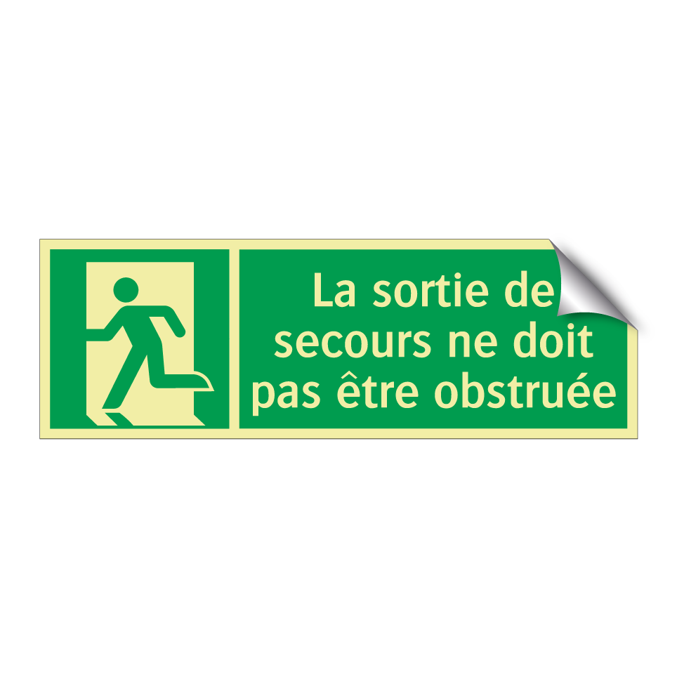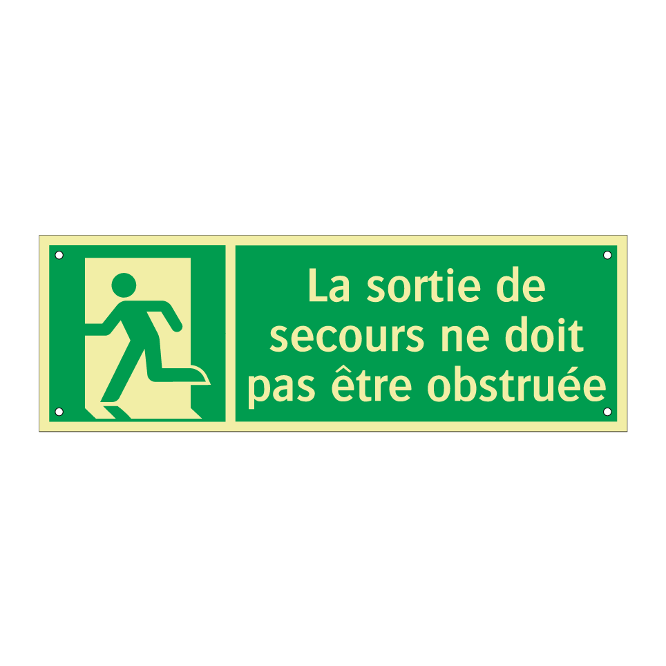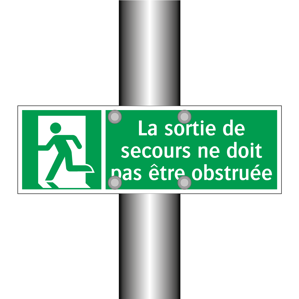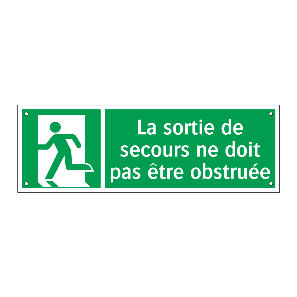 Panneau de secours avec le texte La sortie de secours ne doit pas être obstruée et une symbolique claire