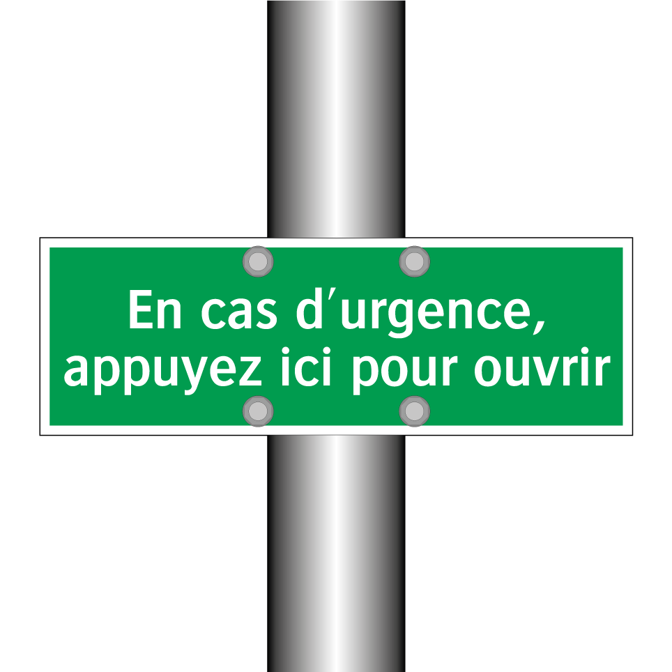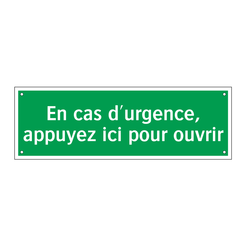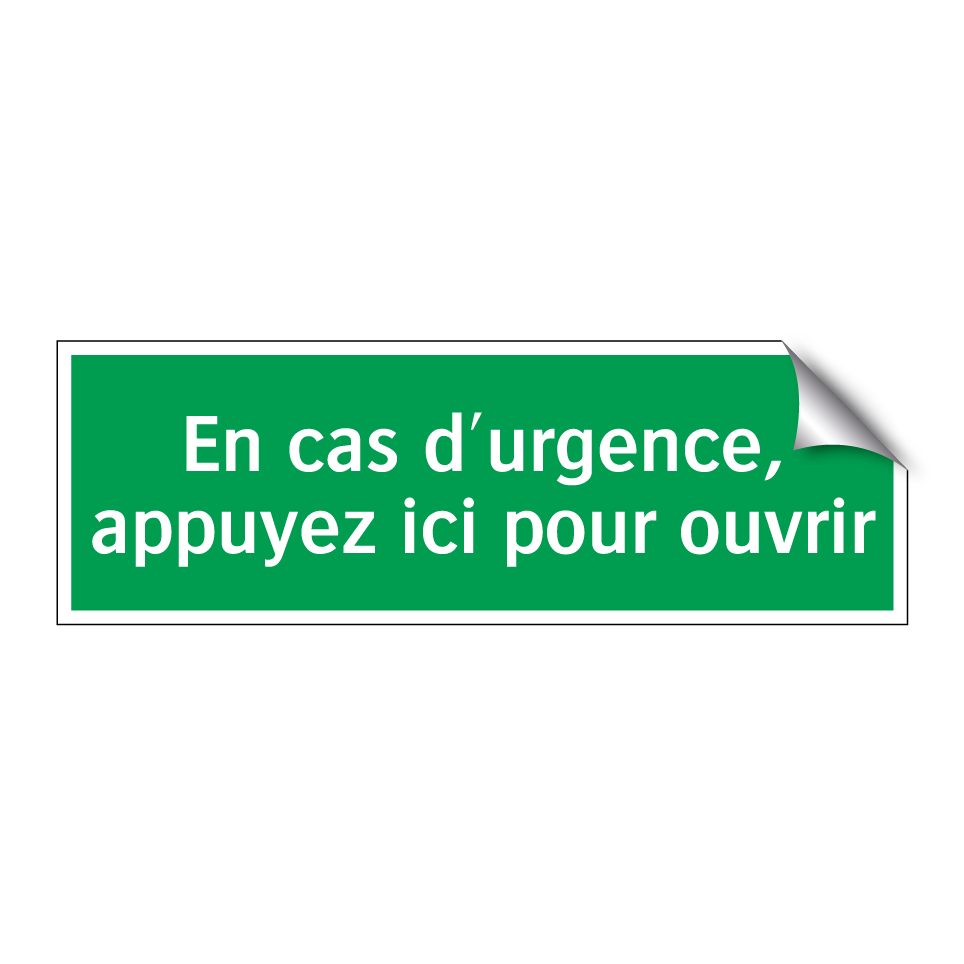 Panneau de secours avec le texte En cas d'urgence, appuyez ici pour ouvrir