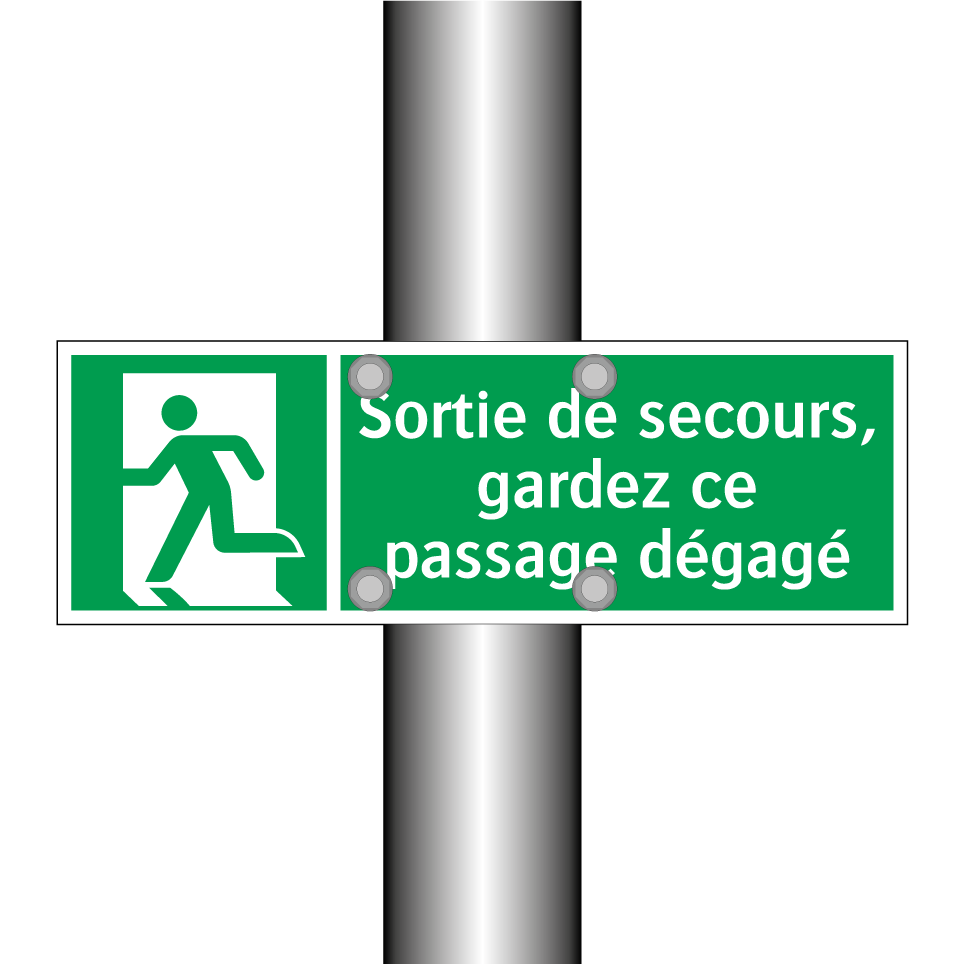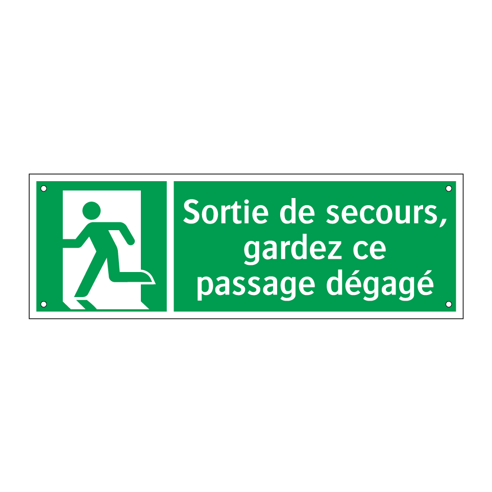 Panneau de secours avec le texte Sortie de secours, gardez ce passage dégagé et une symbolique claire