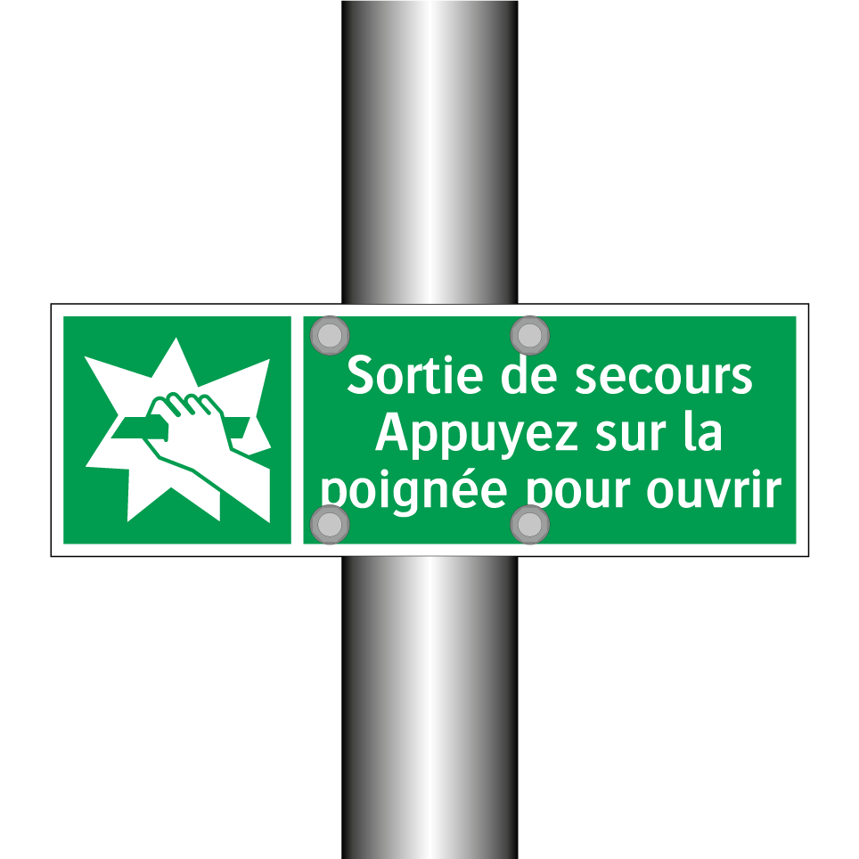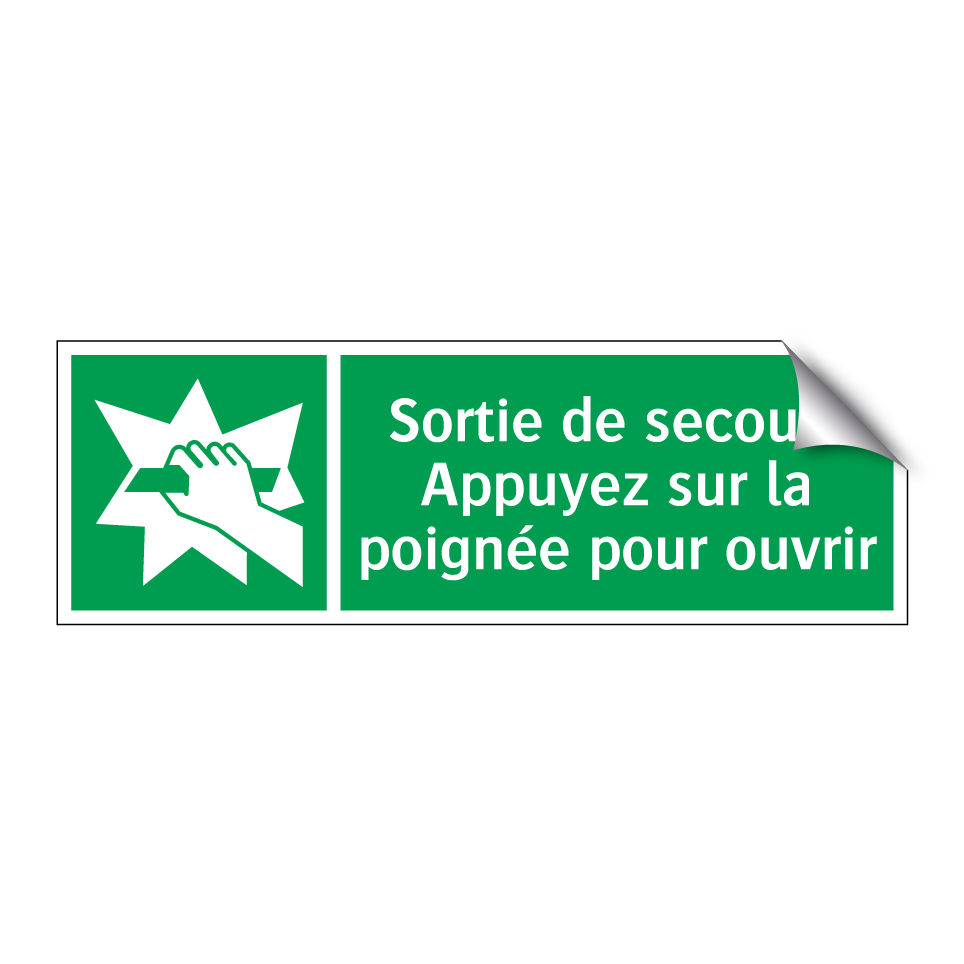 Panneau de secours avec le texte Sortie de secours Appuyez sur la poignée pour ouvrir et une symbolique claire
