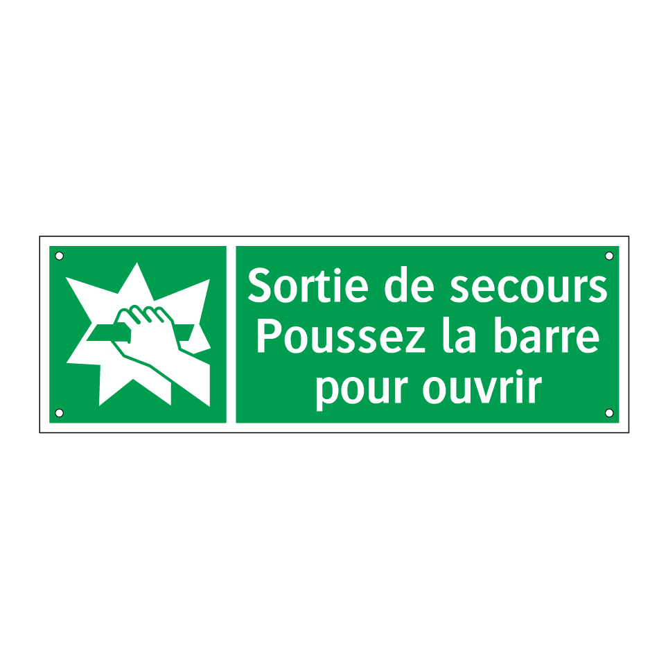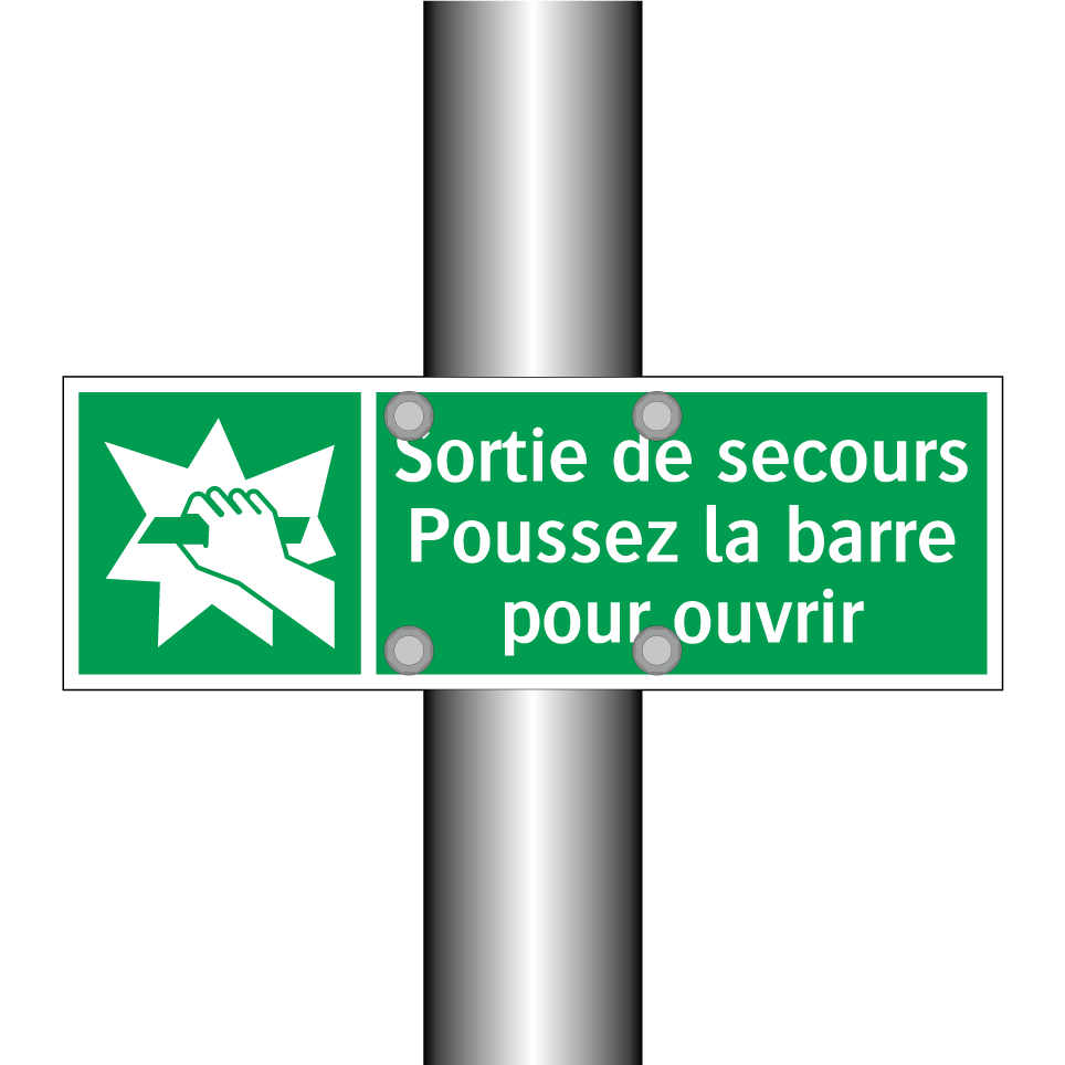 Panneau de secours avec le texte Sortie de secours Poussez la barre pour ouvrir et une symbolique claire