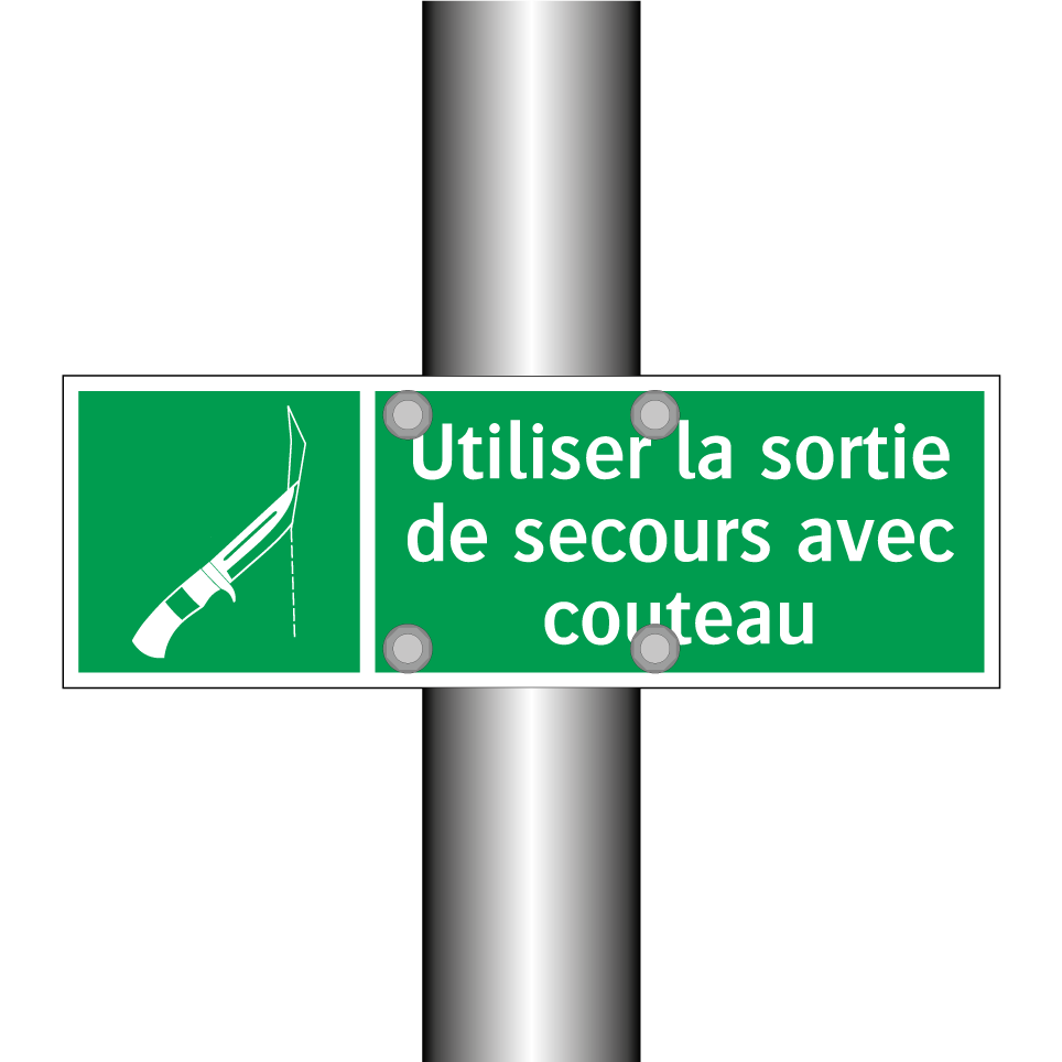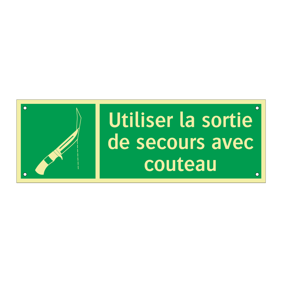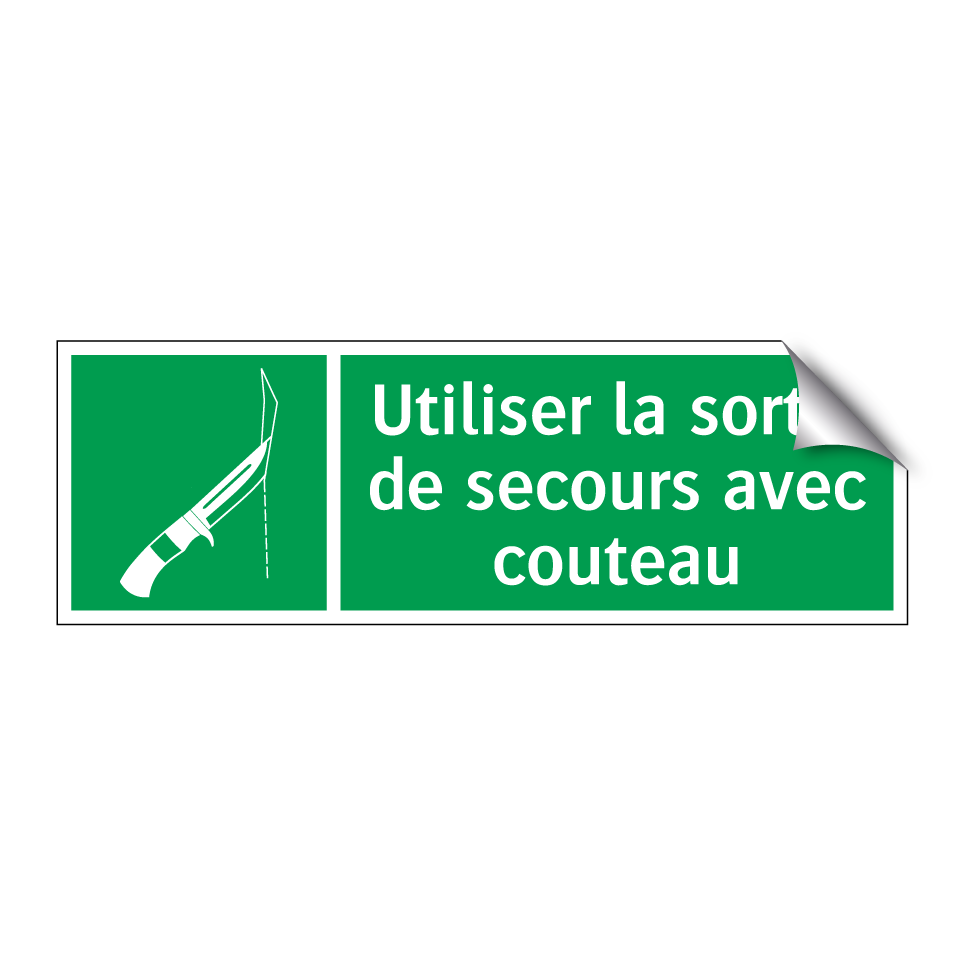 Panneau de secours avec le texte Utiliser la sortie de secours avec couteau et une symbolique claire