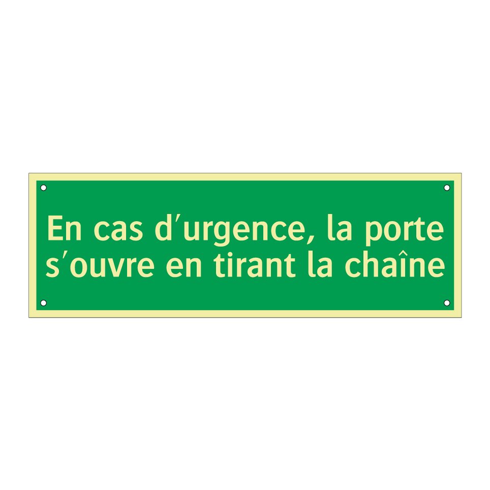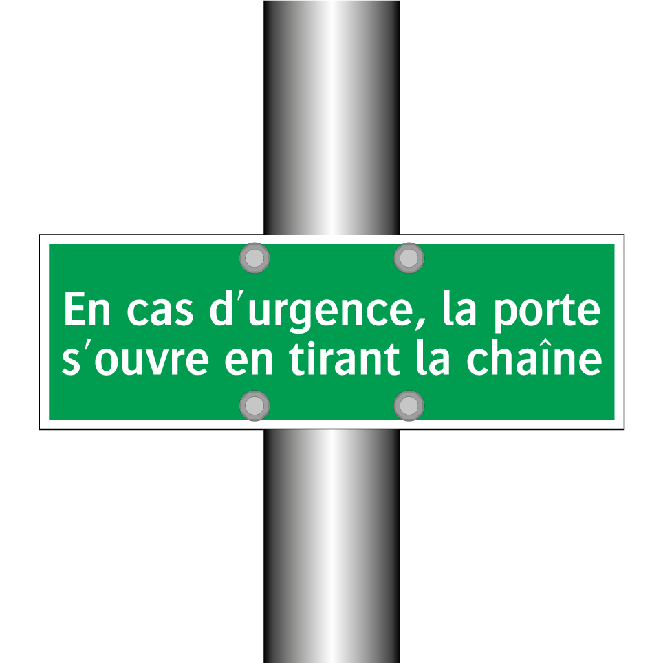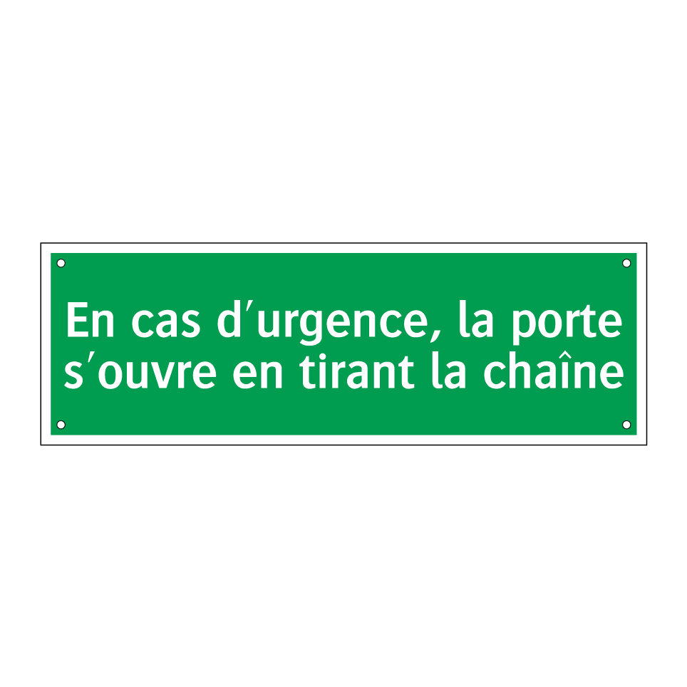 Panneau de secours avec le texte En cas d'urgence, la porte s'ouvre en tirant la chaîne