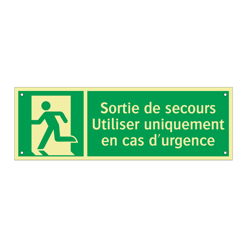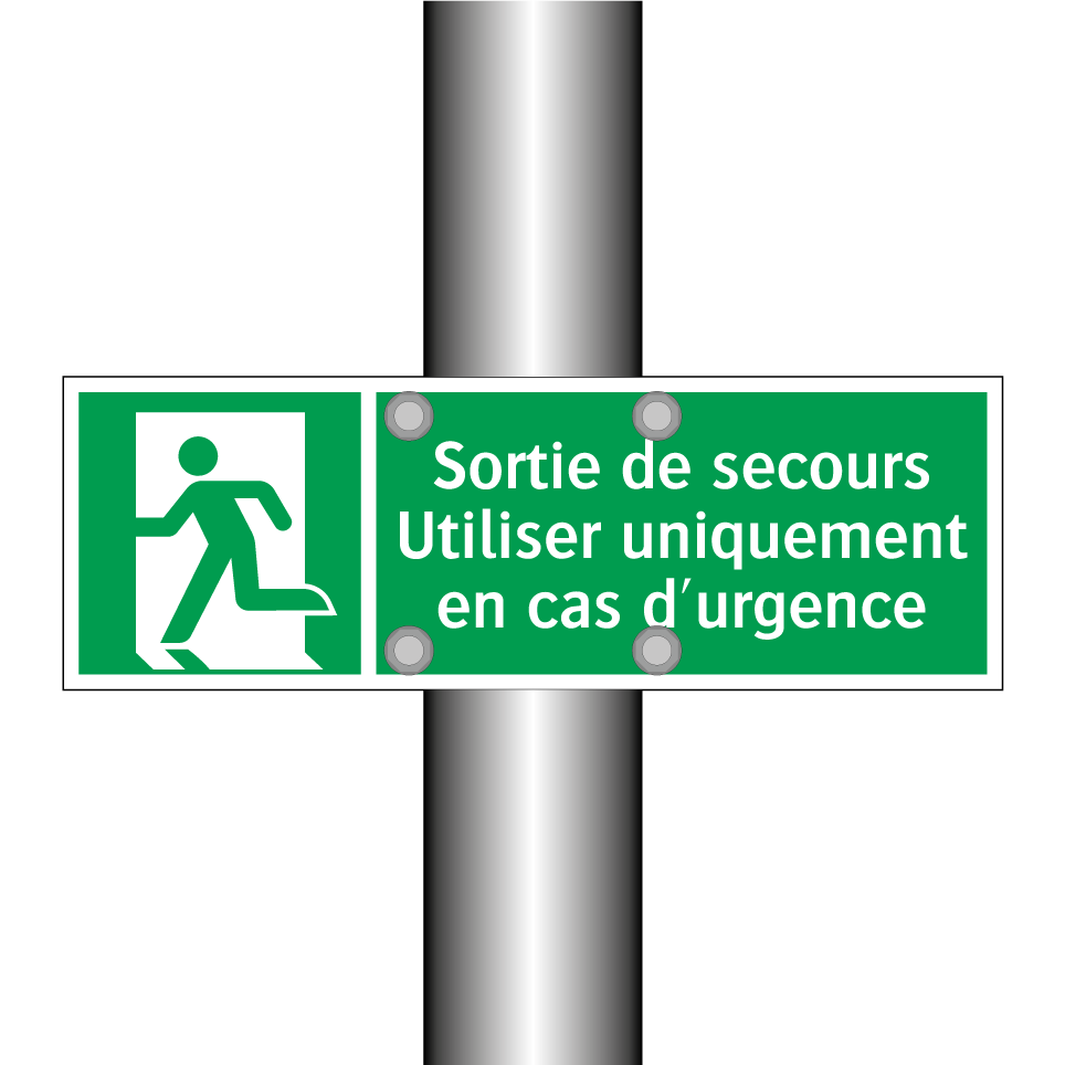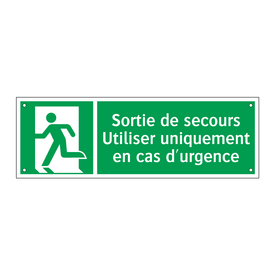 Panneau de secours avec le texte Sortie de secours Utiliser uniquement en cas d'urgence et une symbolique claire