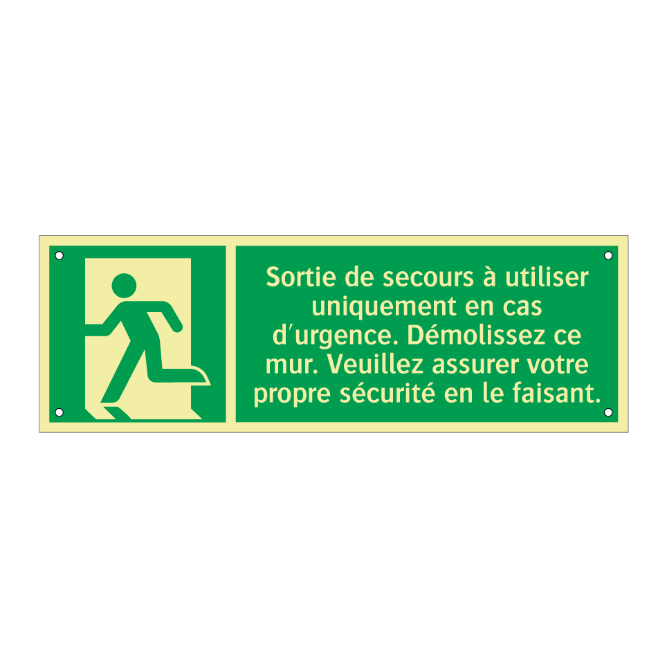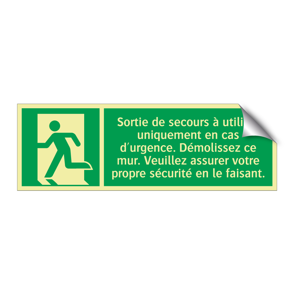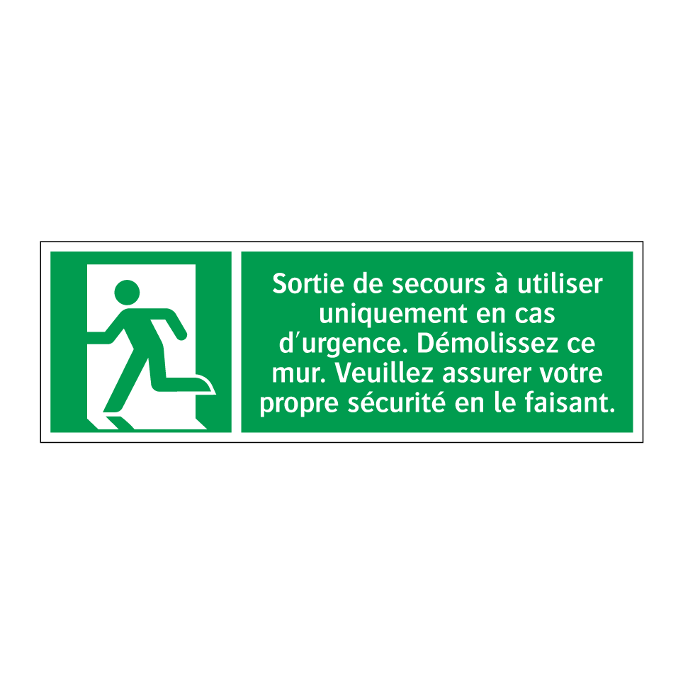 Panneau de secours avec le texte Sortie de secours à utiliser uniquement en cas d'urgence. Démolissez ce mur. Veuillez assurer votre propre sécurité en le faisant. et une symbolique claire