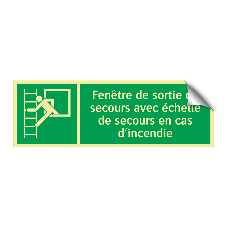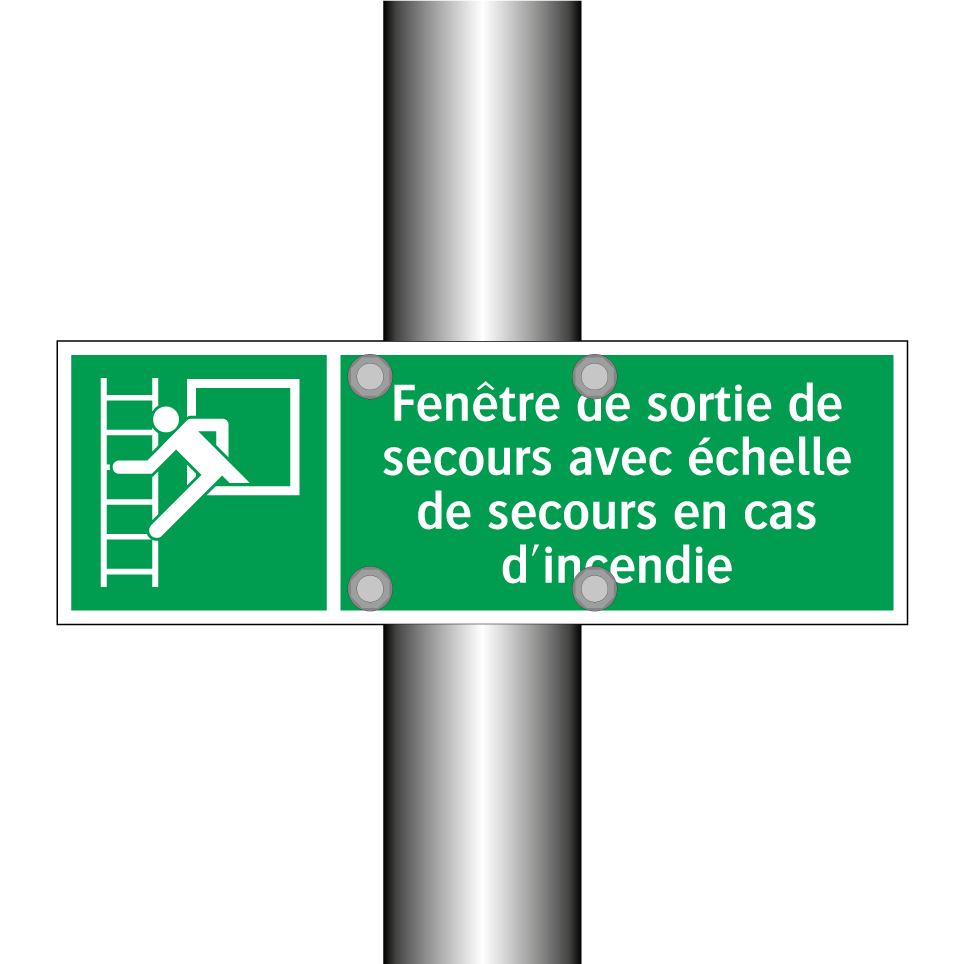 Panneau de secours avec le texte Fenêtre de sortie de secours avec échelle de secours en cas d'incendie et une symbolique claire
