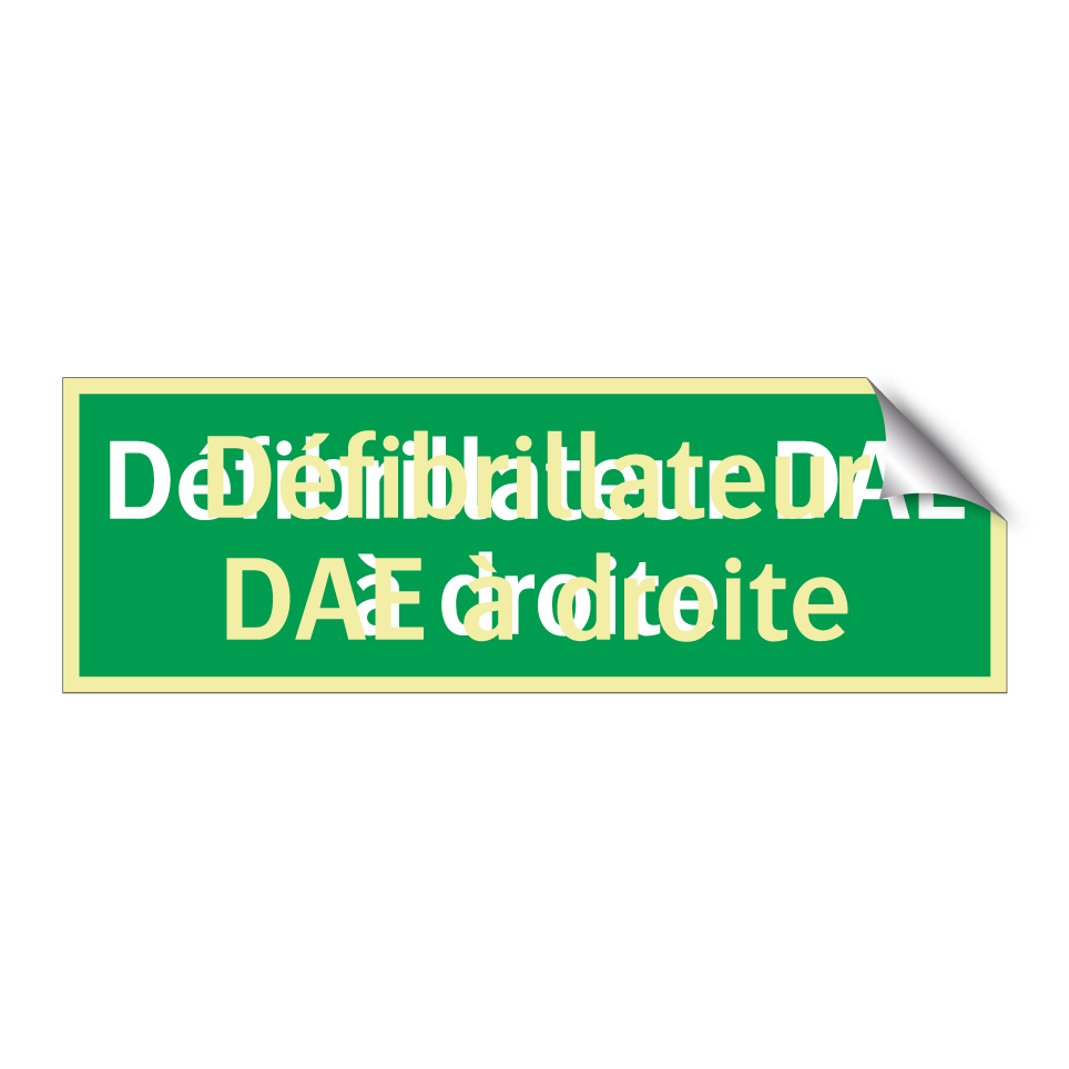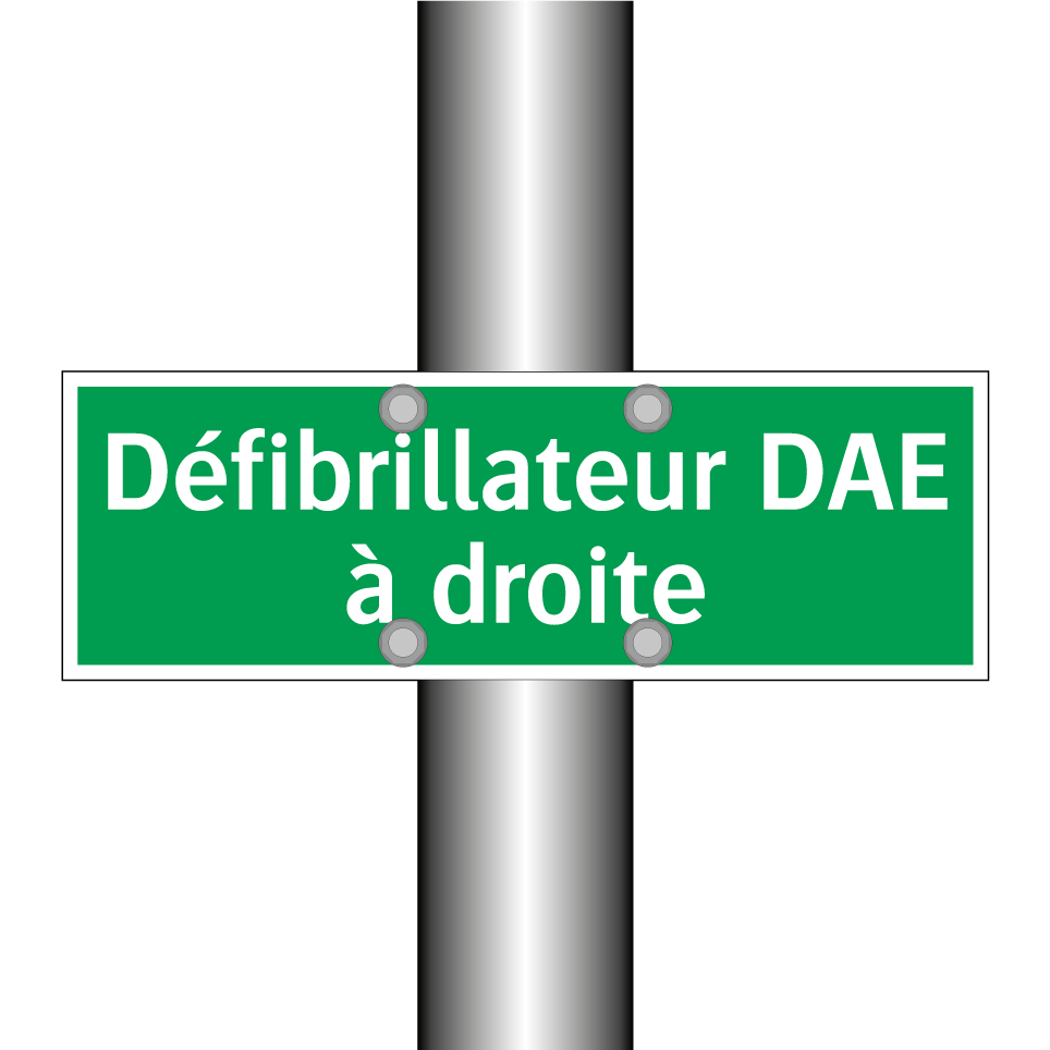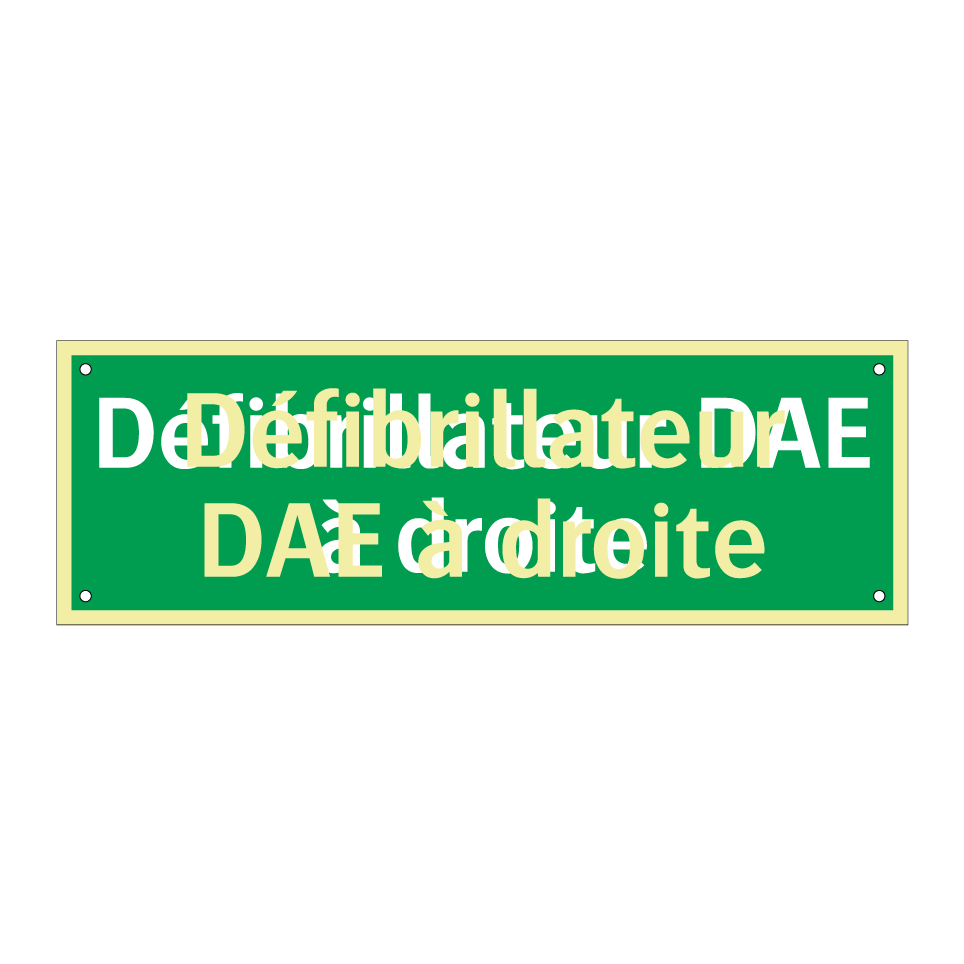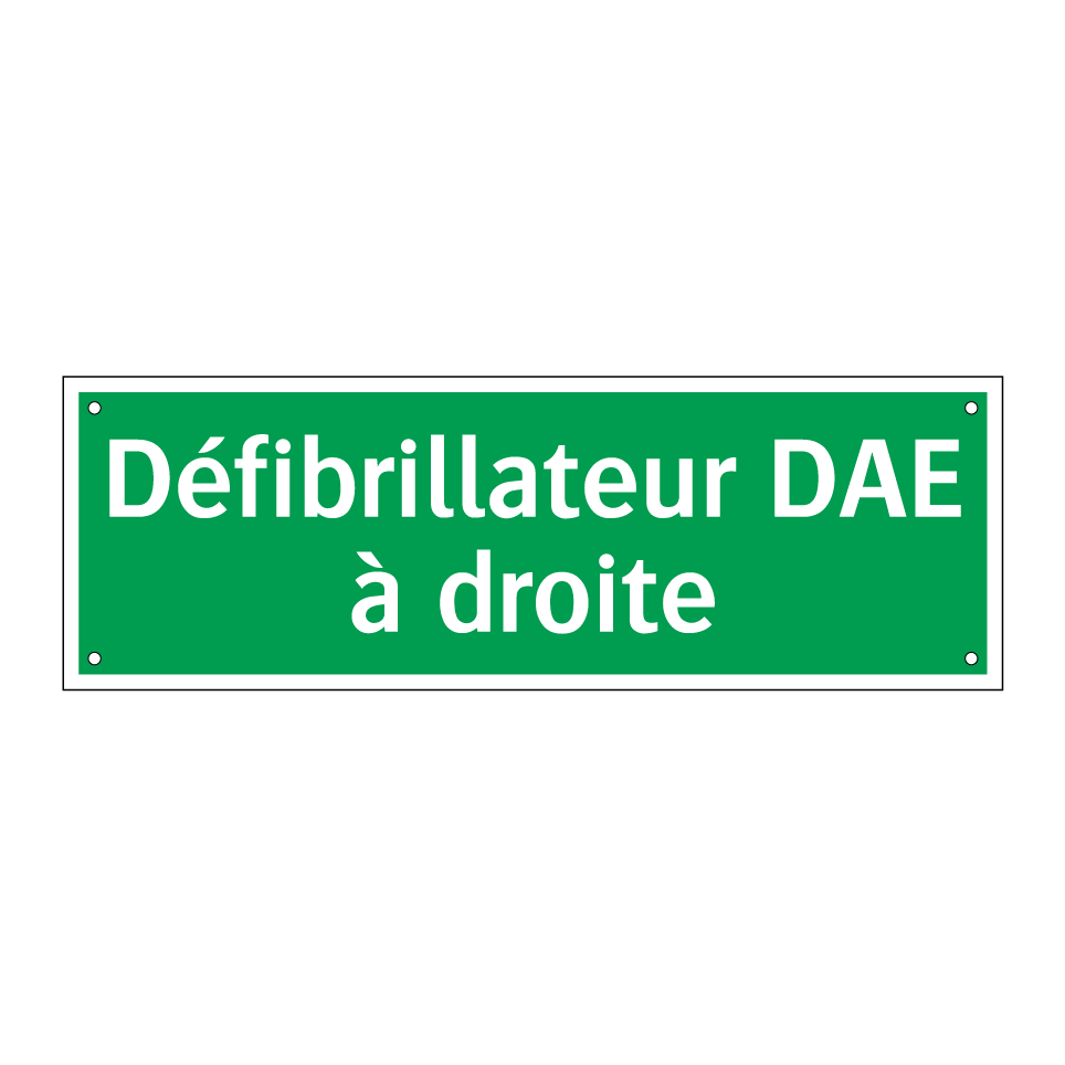 Panneau de secours avec le texte Défibrillateur DAE à droite
