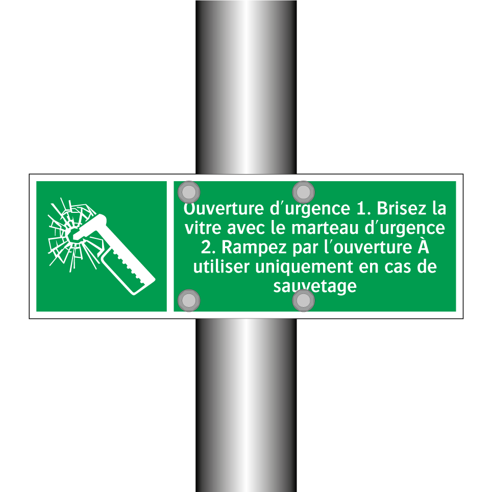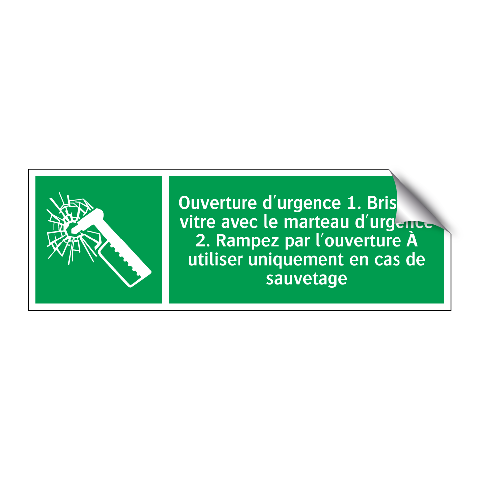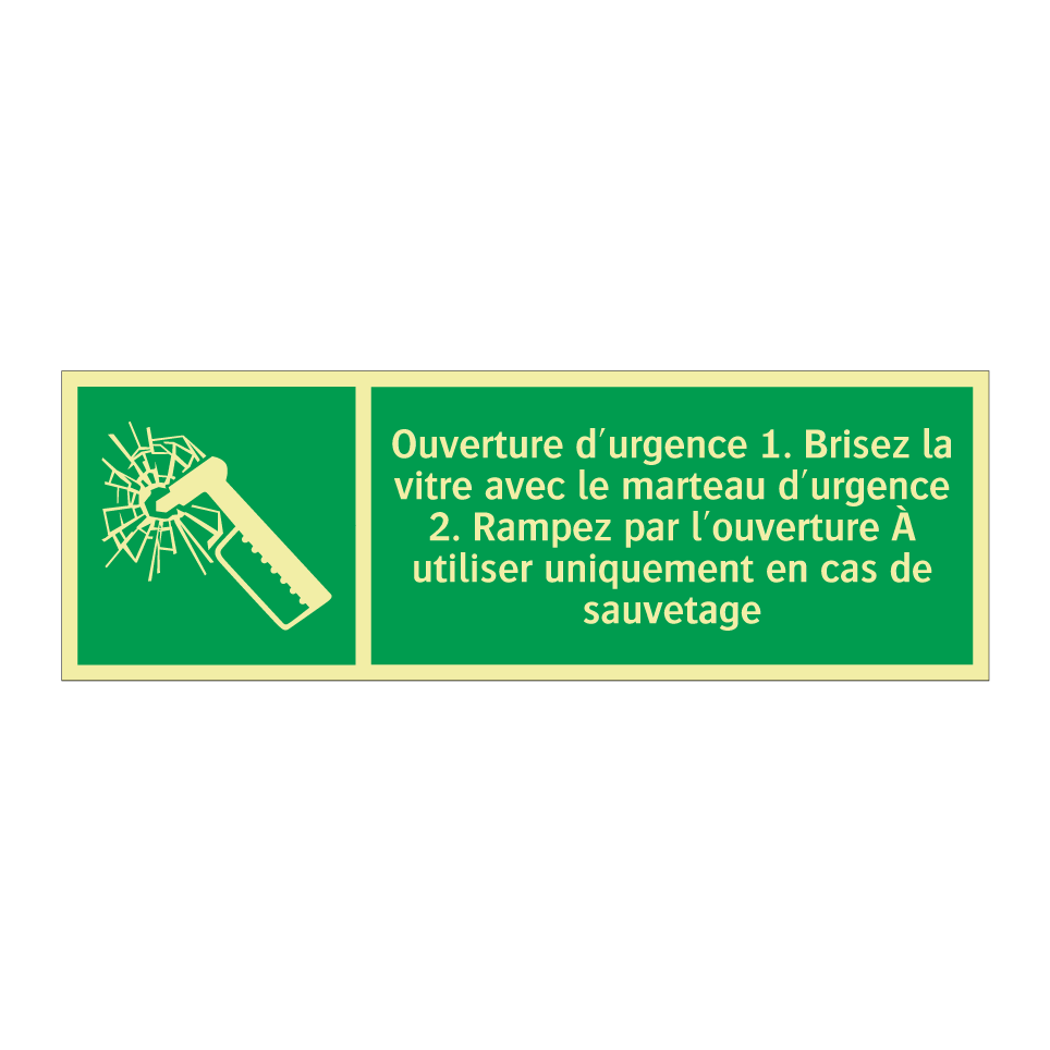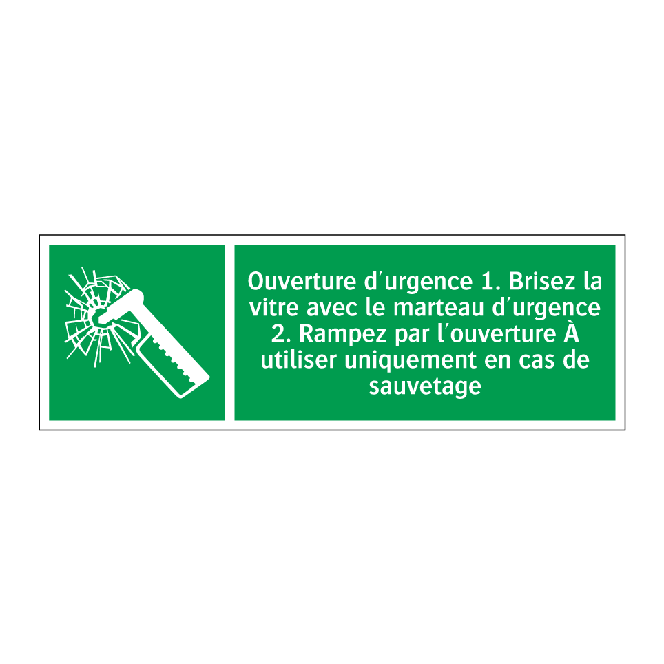 Panneau de secours avec le texte Ouverture d'urgence 1. Brisez la vitre avec le marteau d'urgence 2. Rampez par l'ouverture À utiliser uniquement en cas de sauvetage et une symbolique claire
