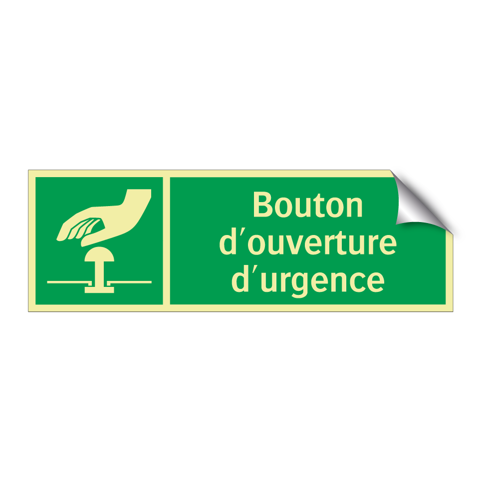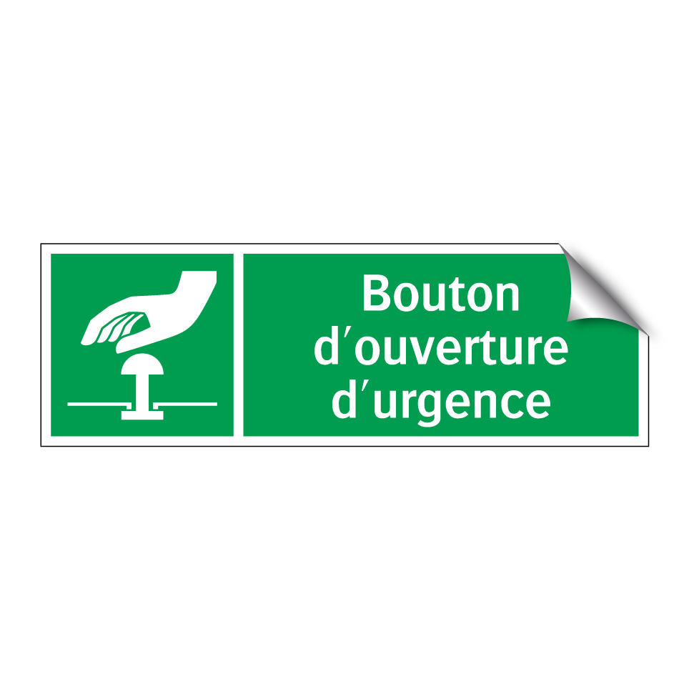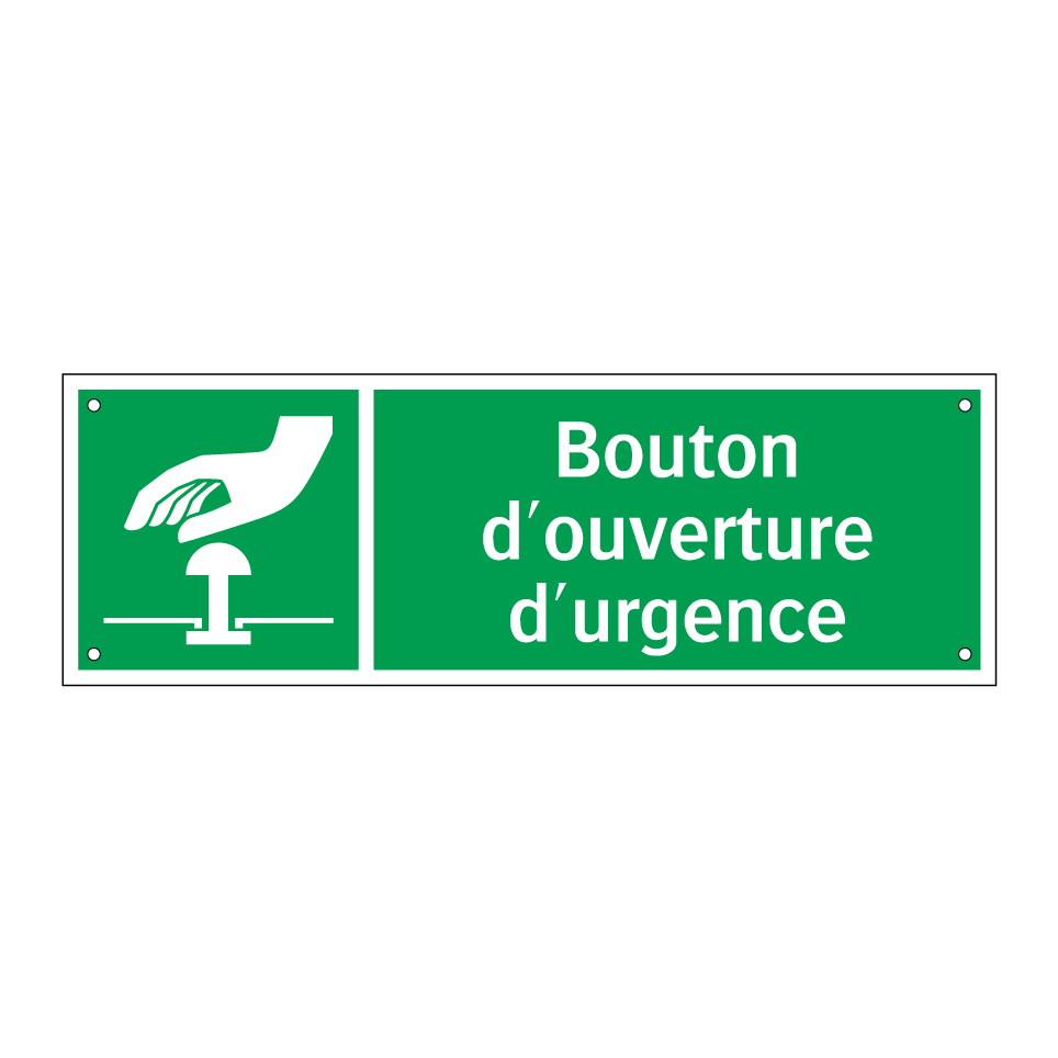 Panneau de secours avec le texte Bouton d'ouverture d'urgence et une symbolique claire