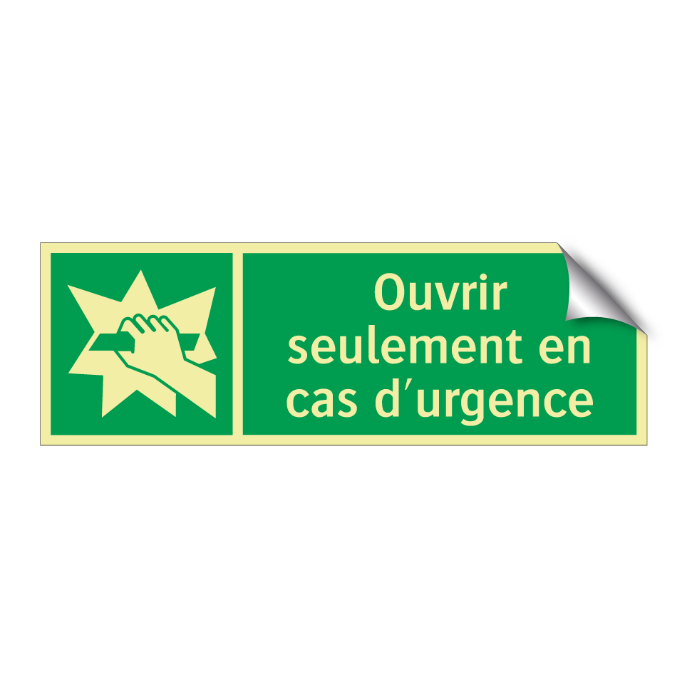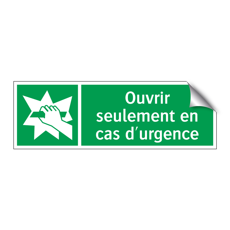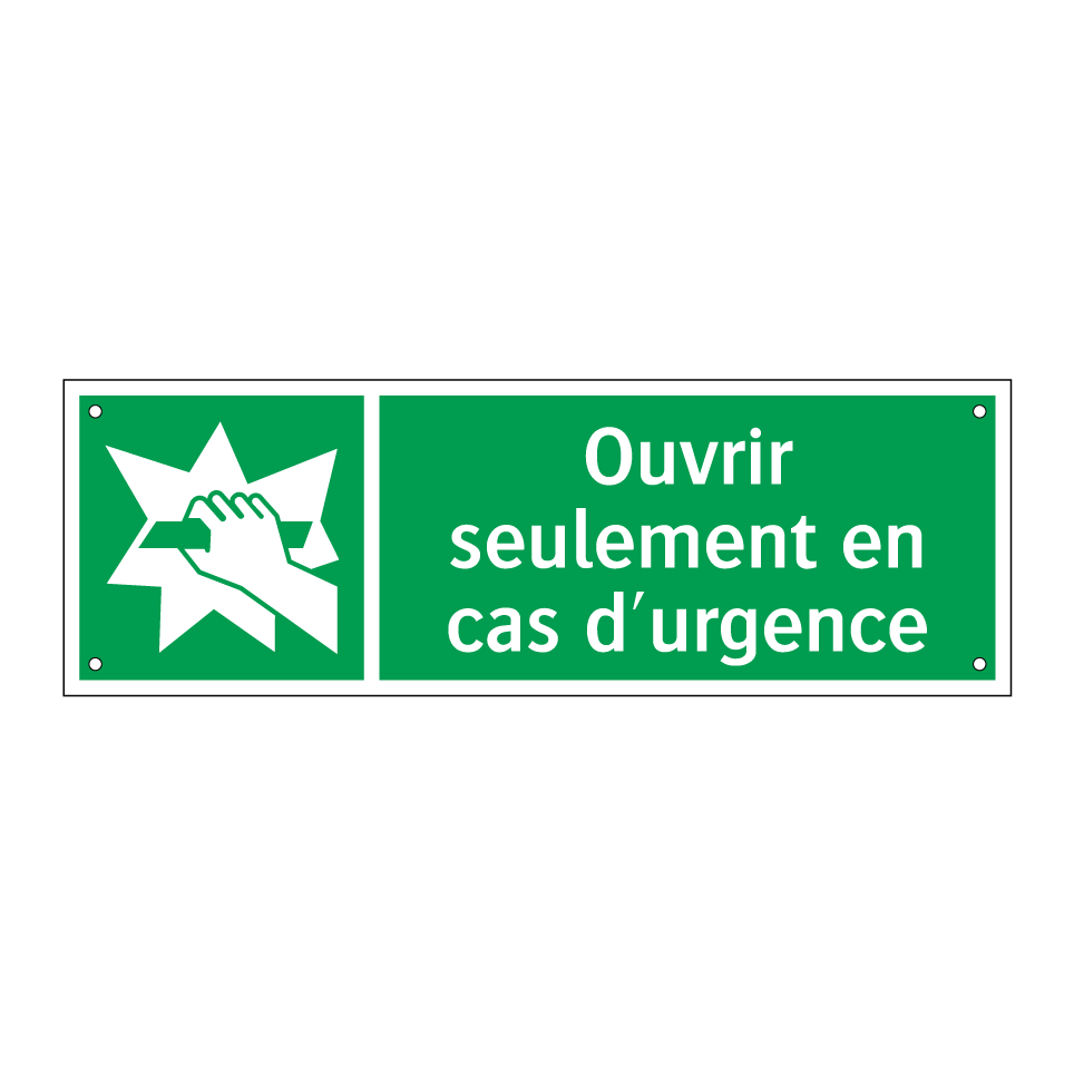 Panneau de secours avec le texte Ouvrir seulement en cas d'urgence et une symbolique claire
