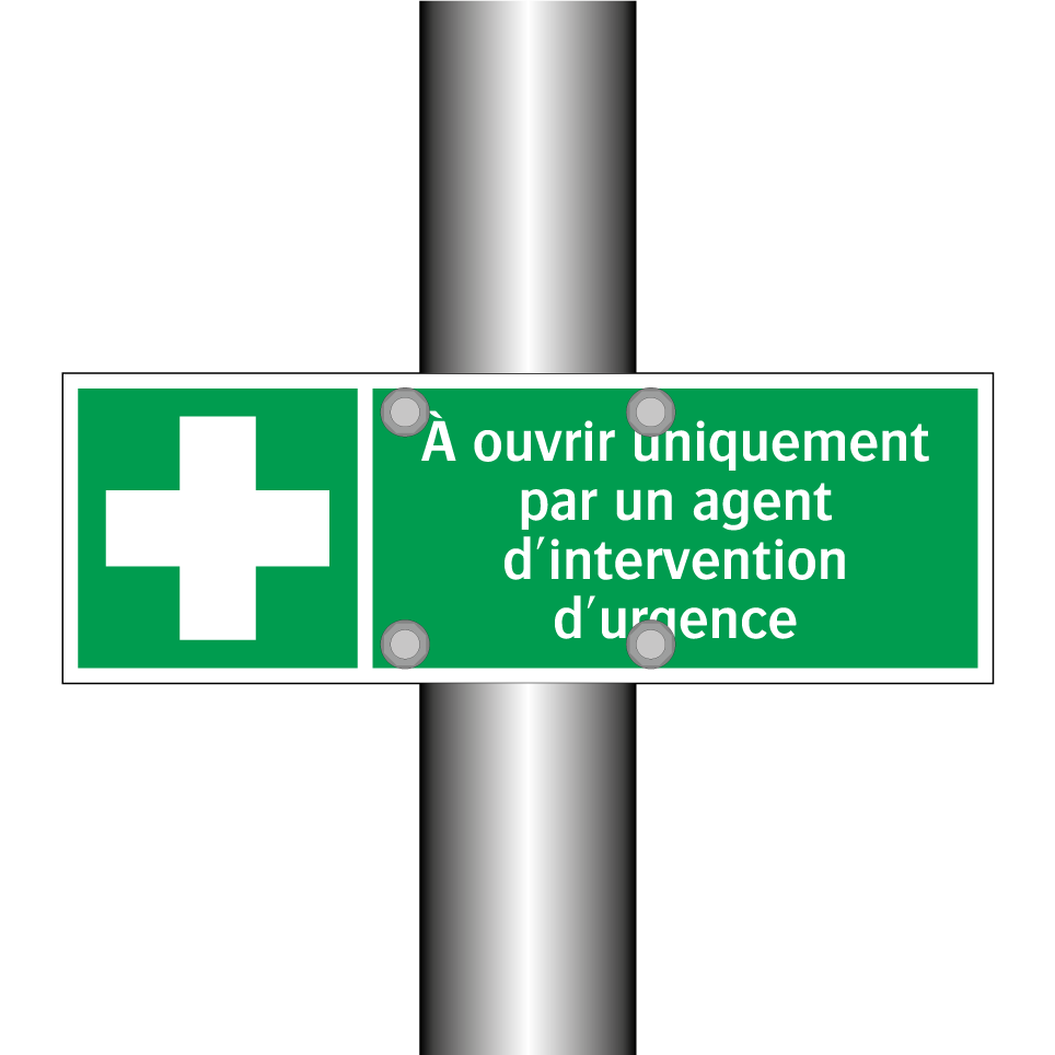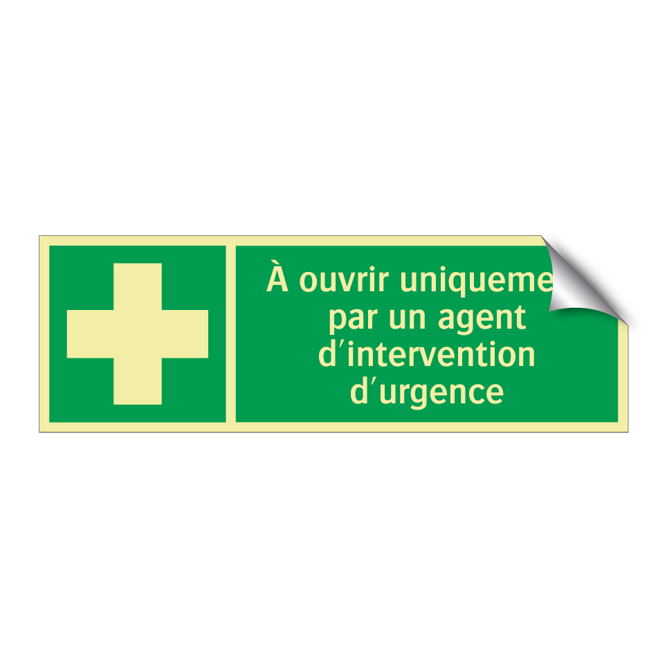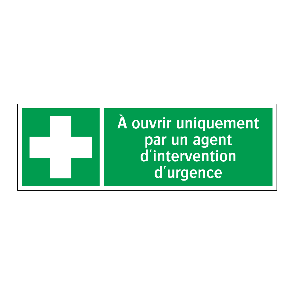 Panneau de secours avec le texte À ouvrir uniquement par un agent d'intervention d'urgence et une symbolique claire