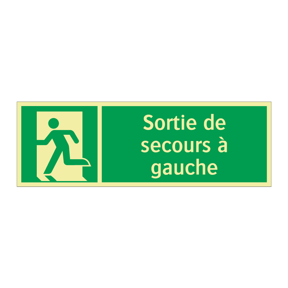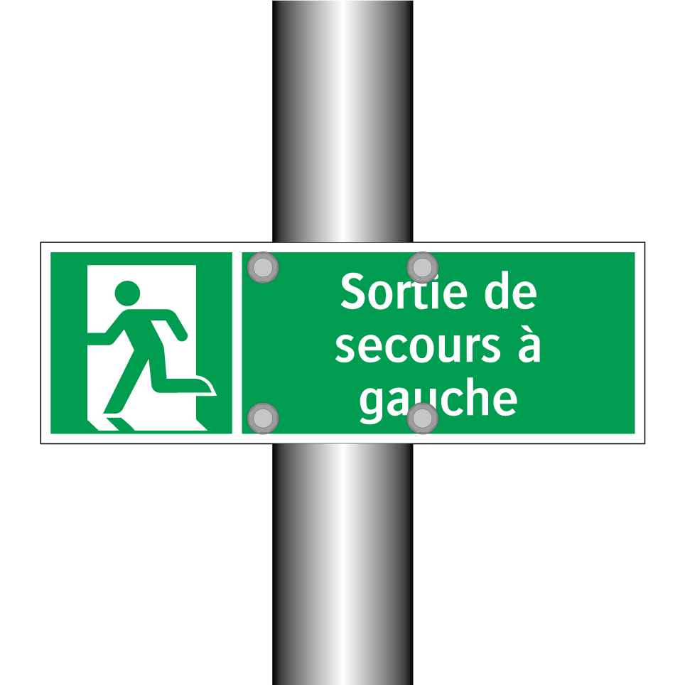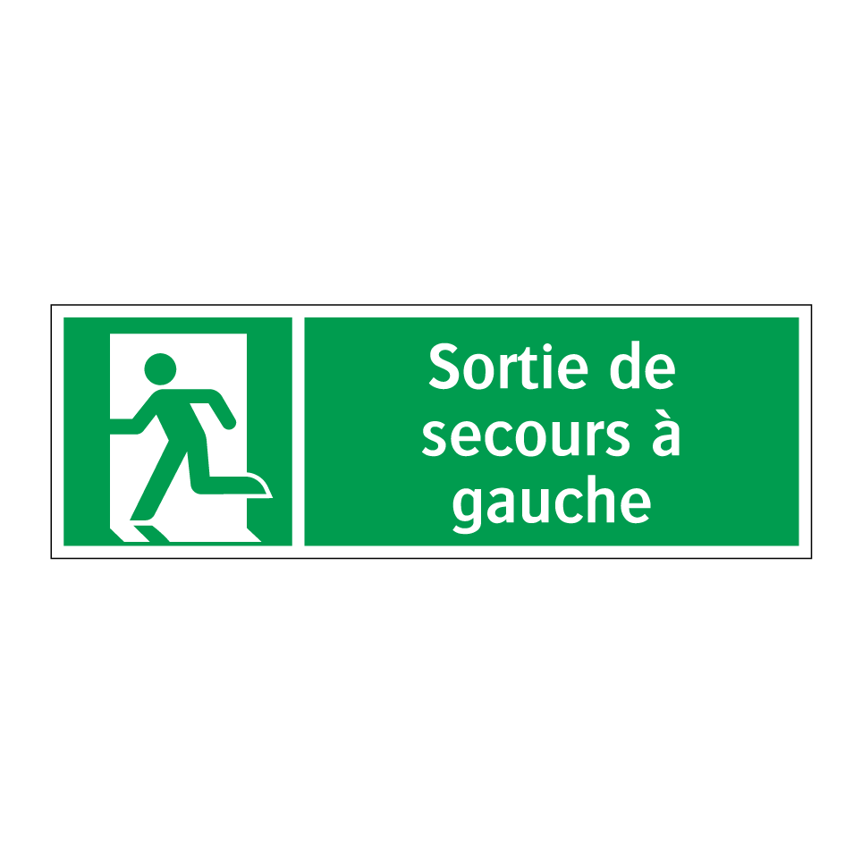 Panneau de secours avec le texte Sortie de secours à gauche et une symbolique claire