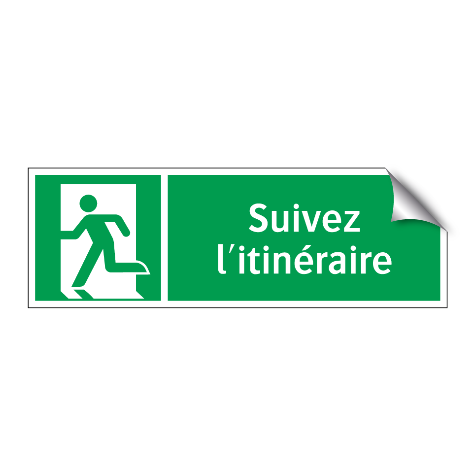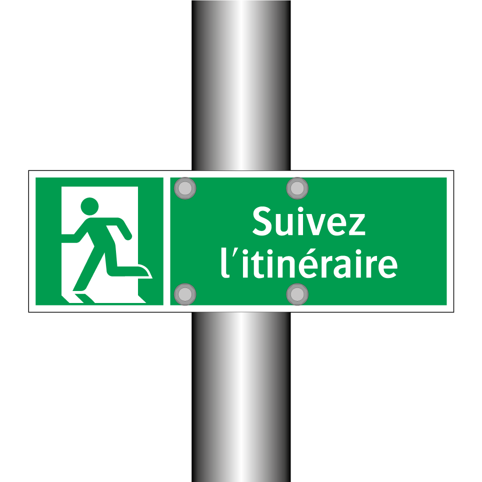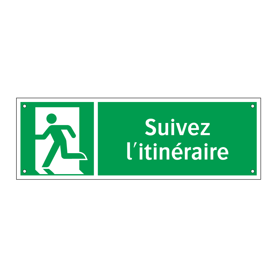 Panneau de secours avec le texte Suivez l'itinéraire et une symbolique claire