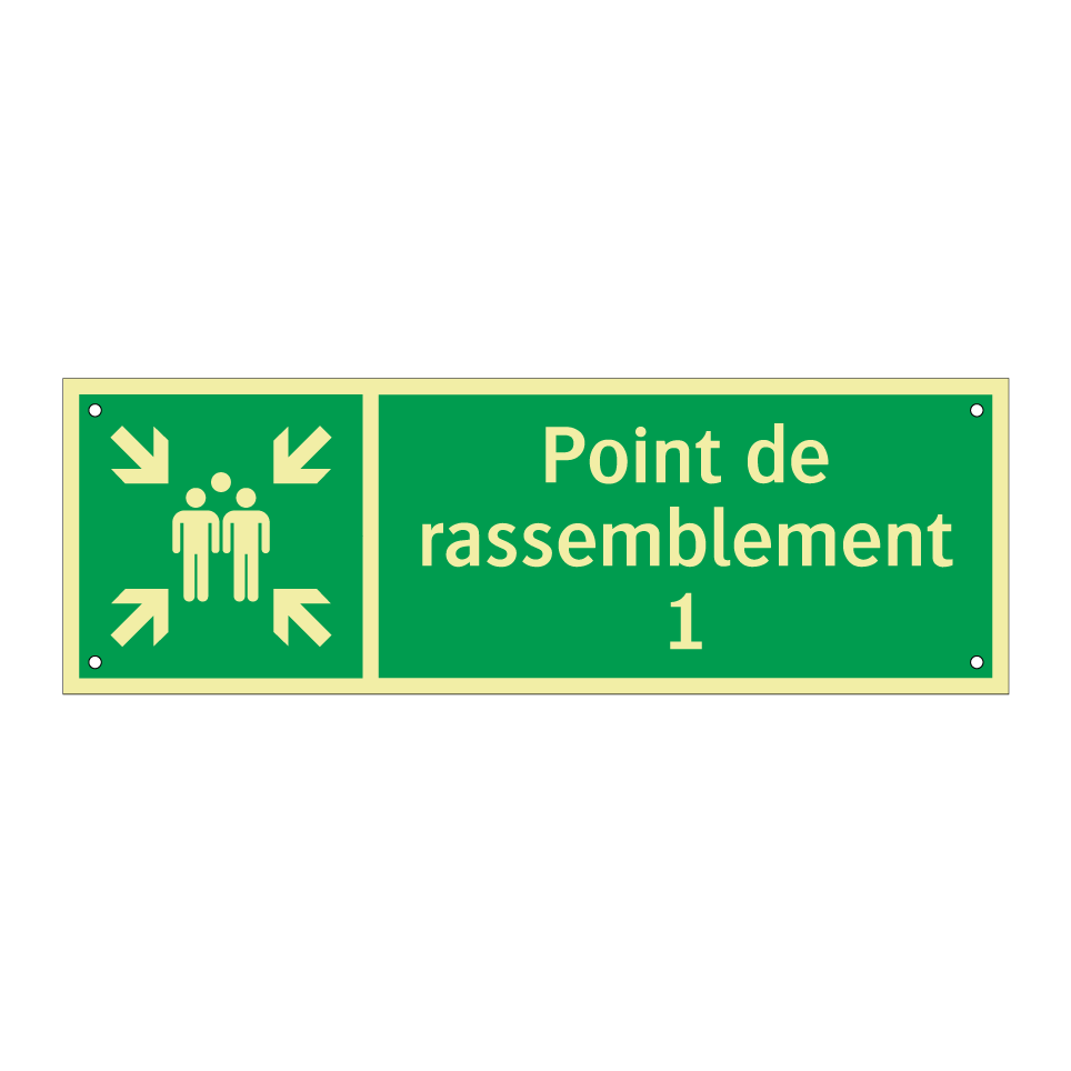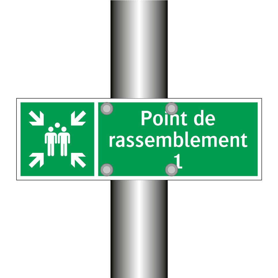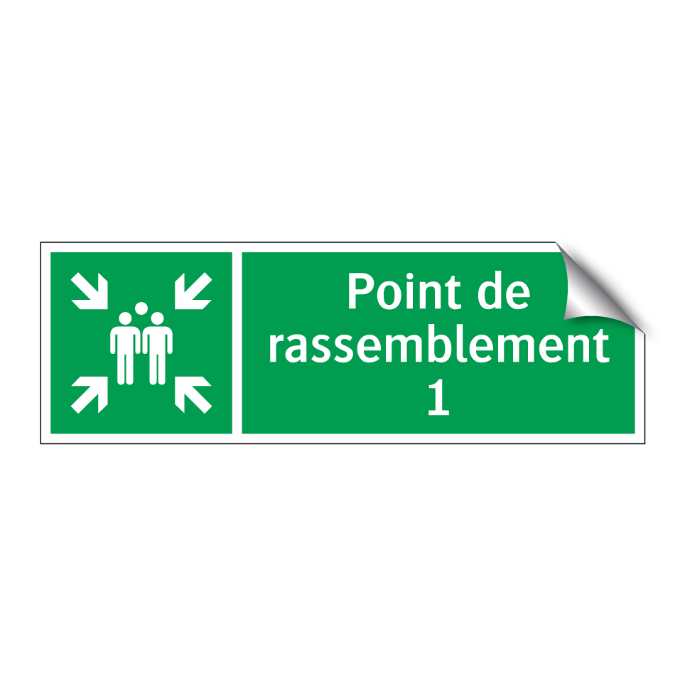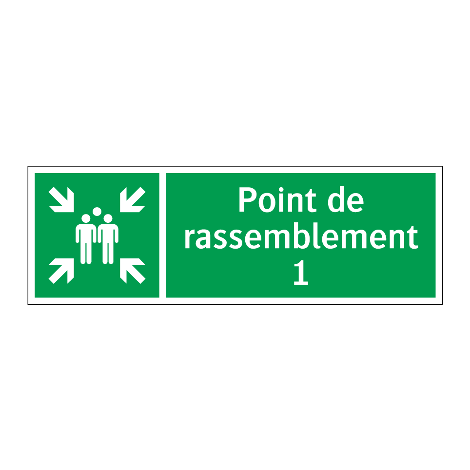 Panneau de secours avec le texte Point de rassemblement 1 et une symbolique claire